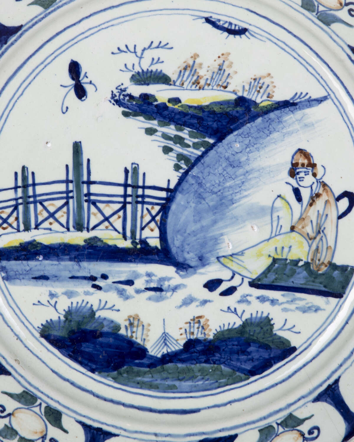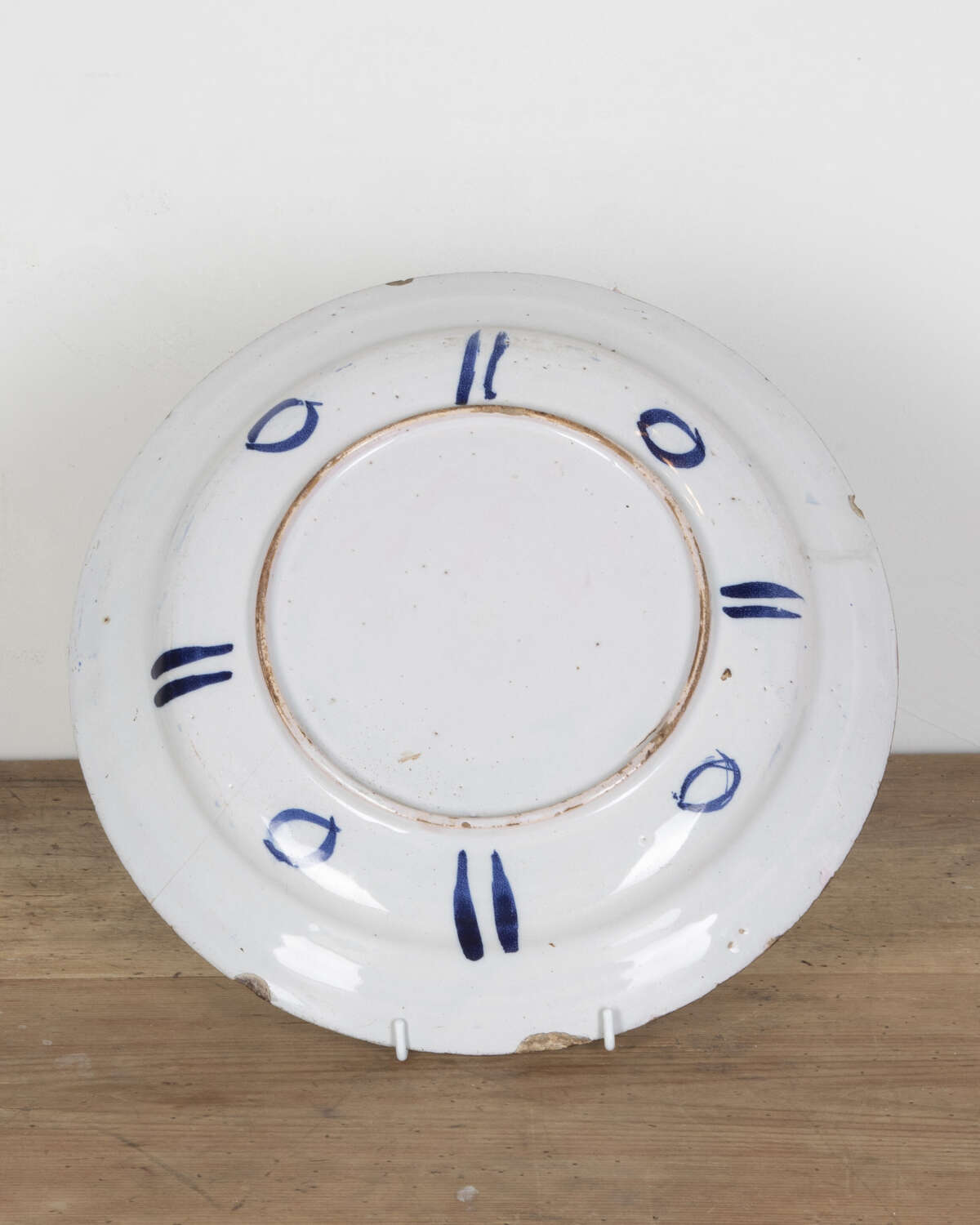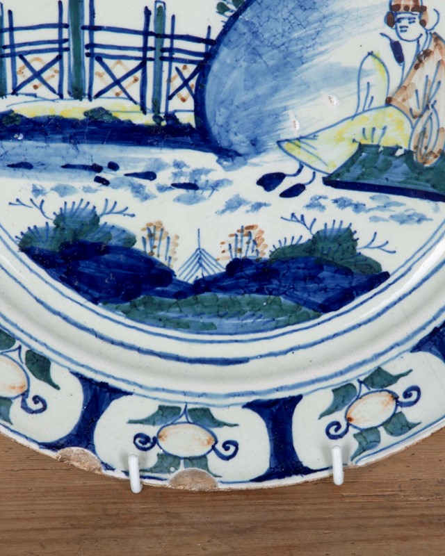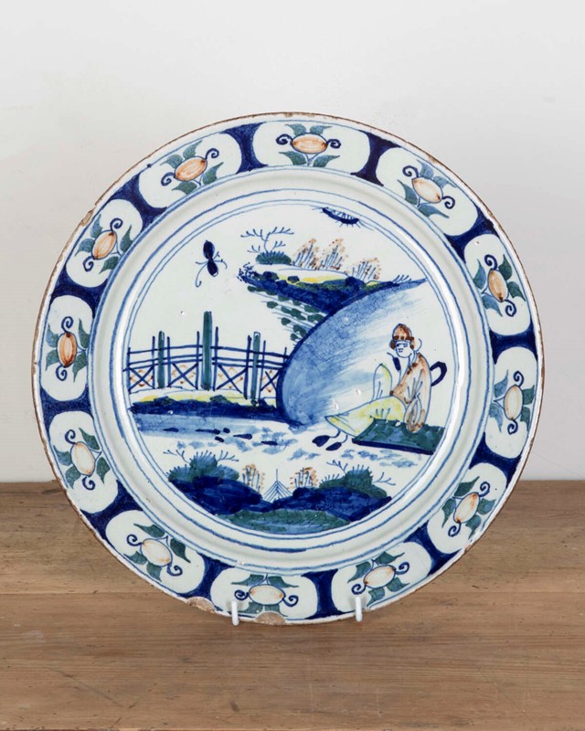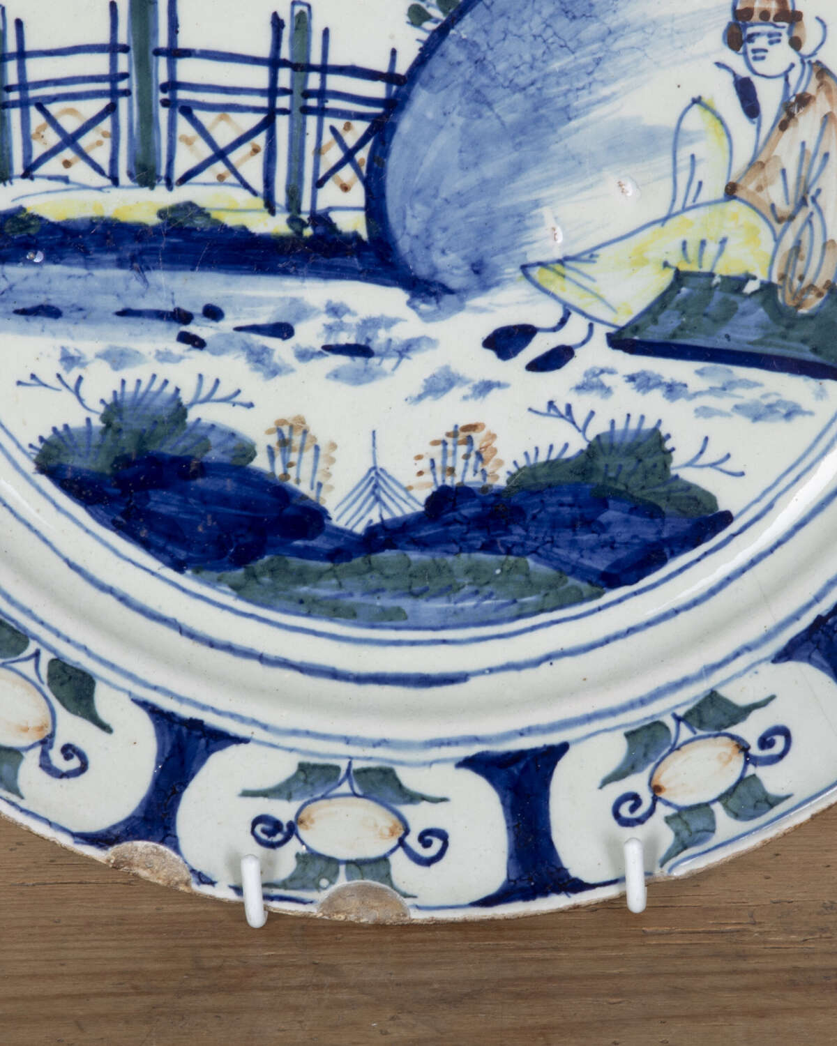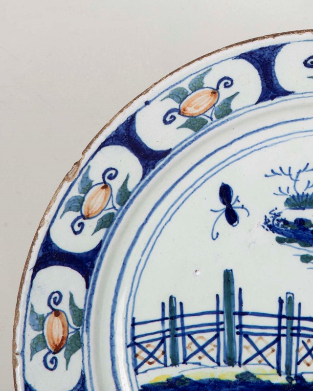 18th Century English tin glazed earthenware charger with wonderful hand painted polychrome decoration.