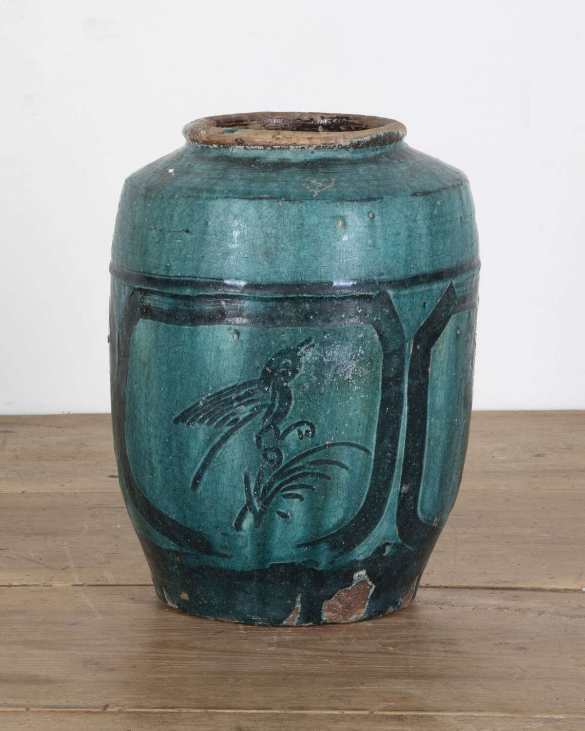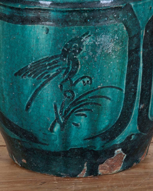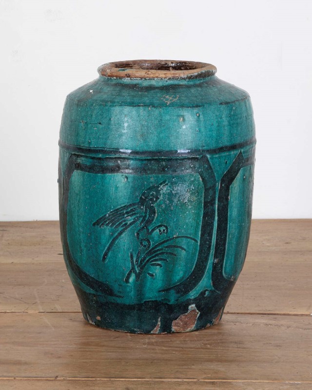 Glazed pottery temple jar, believed to be a 16th Century Chinese Ming Dynasty piece.Hand-detailed panels depicting birds and flowers.