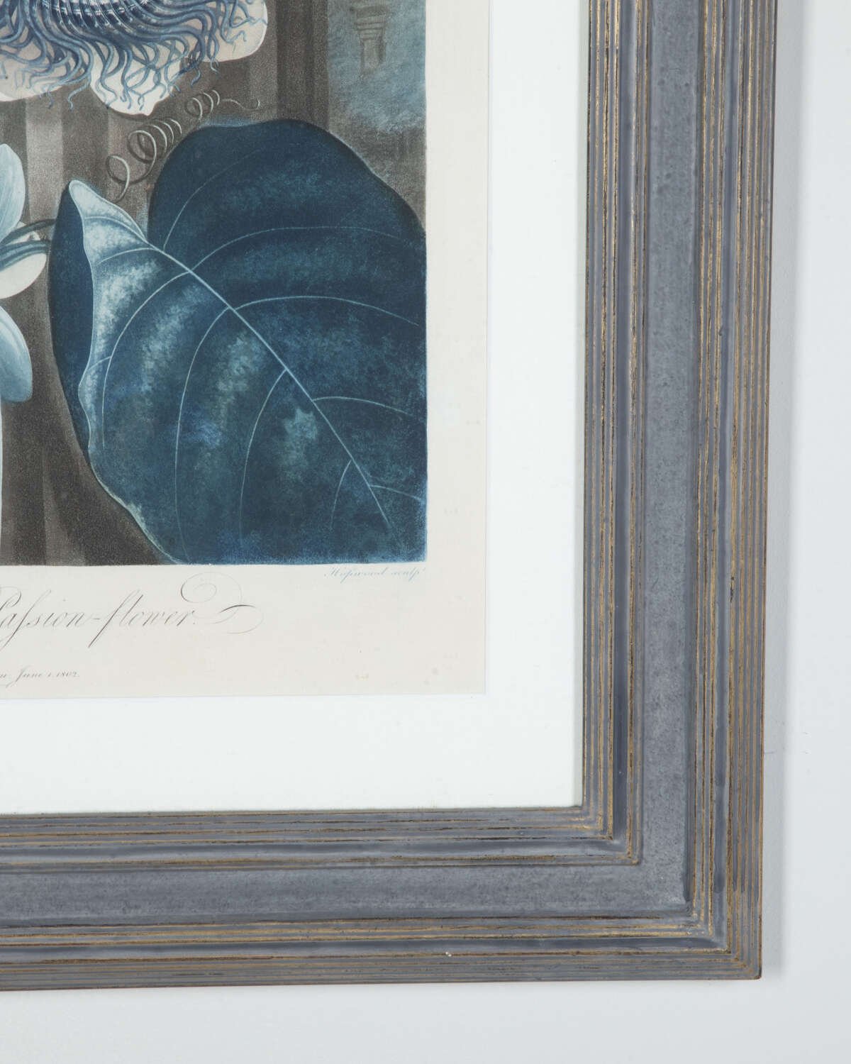This engraving depicts "The Quadrangular Passion Flower" which is framed within a handmade structure and hessian mounts. The frame has truvue glass for optimal clarity.