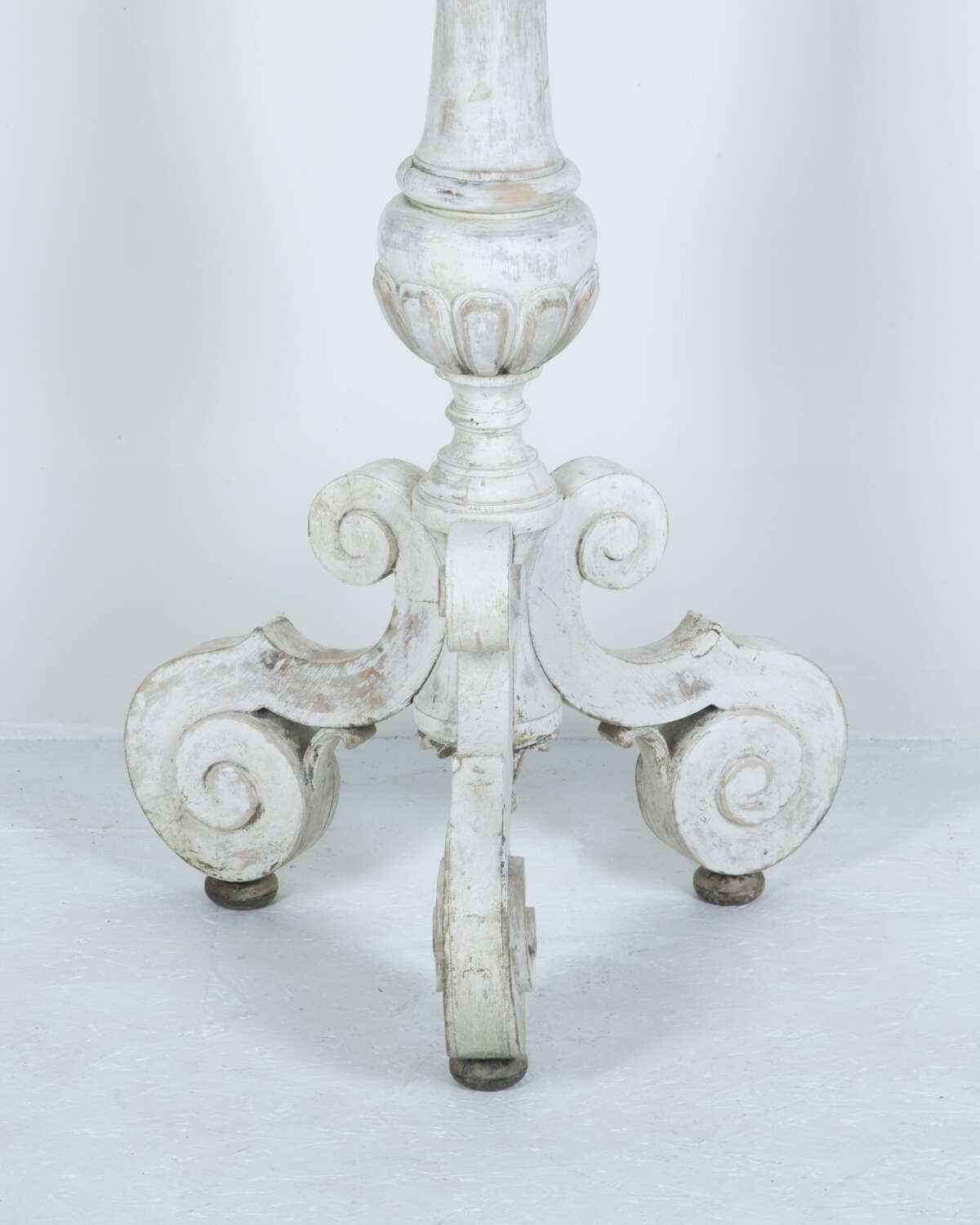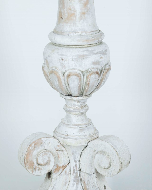 Fabulous early 19th century French floor standing carved wood altar candle stand in early paint. A rare and unique piece which could be converted into a statement floor lamp.