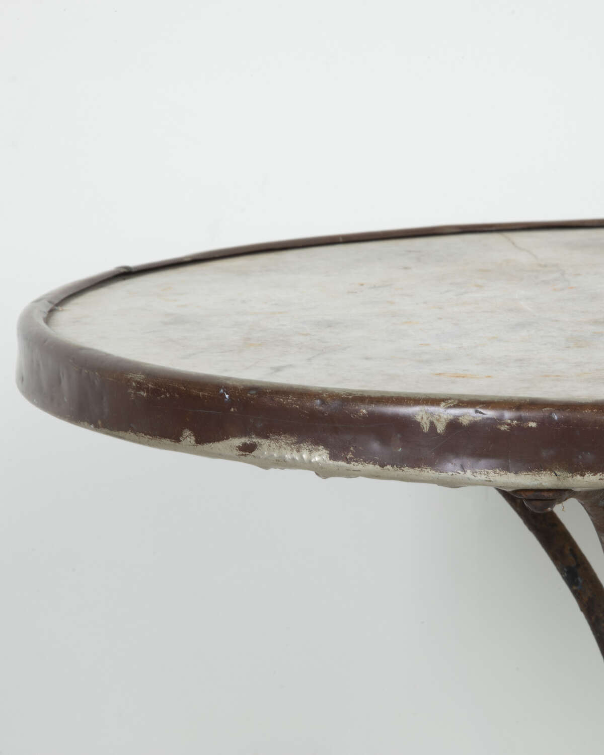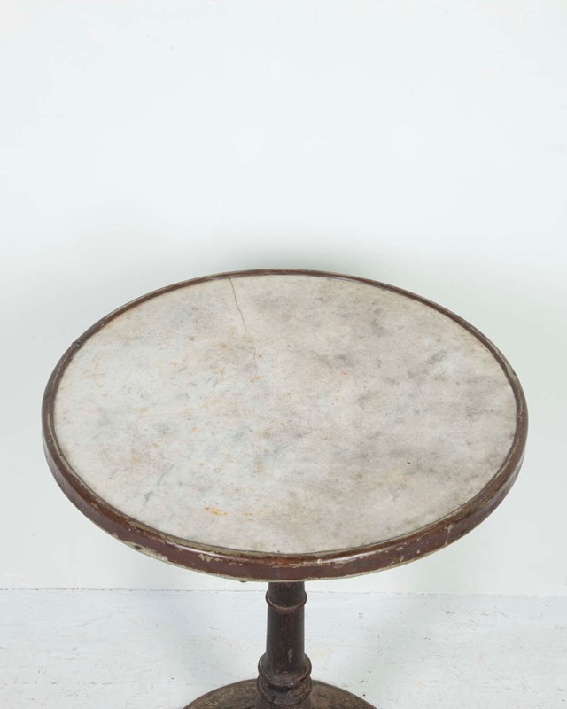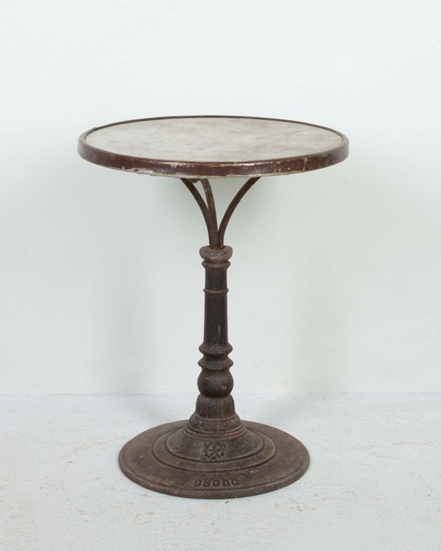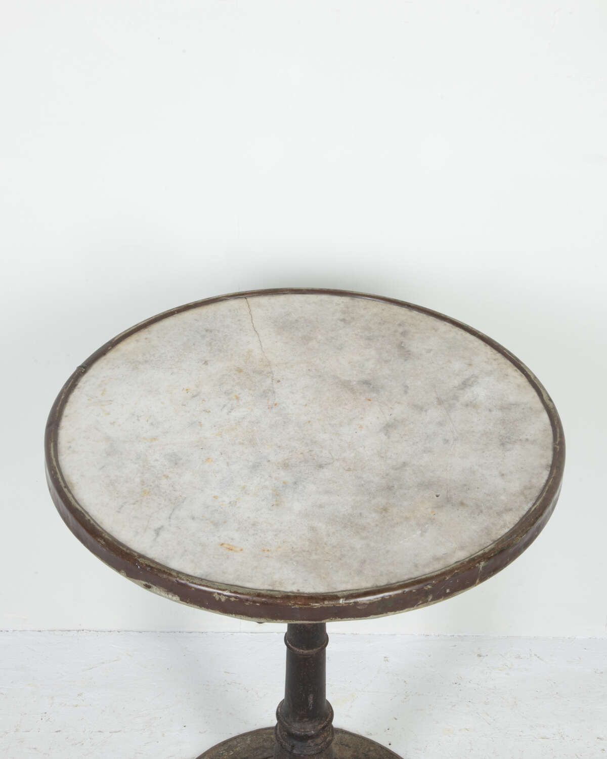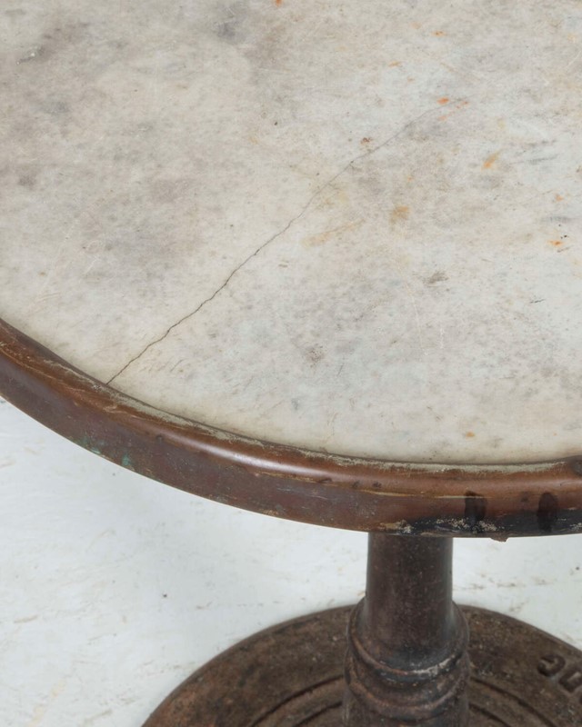 Cast iron and marble 20th Century French bistro table. Brass banded top and foundry makers stamp to the base.