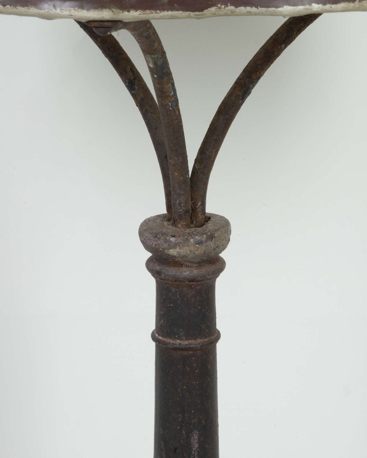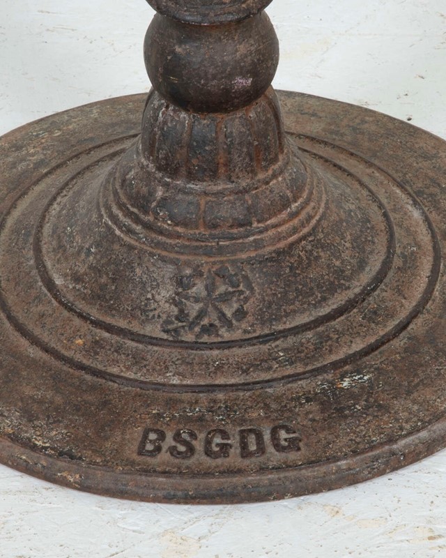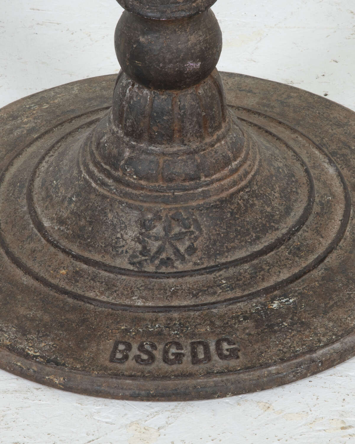 Cast iron and marble 20th Century French bistro table. Brass banded top and foundry makers stamp to the base.