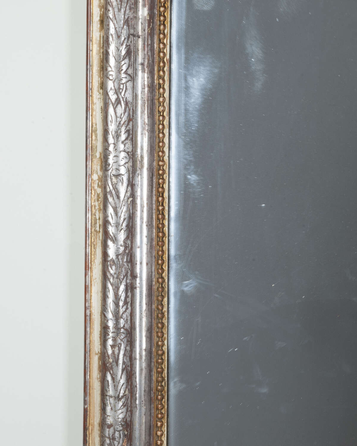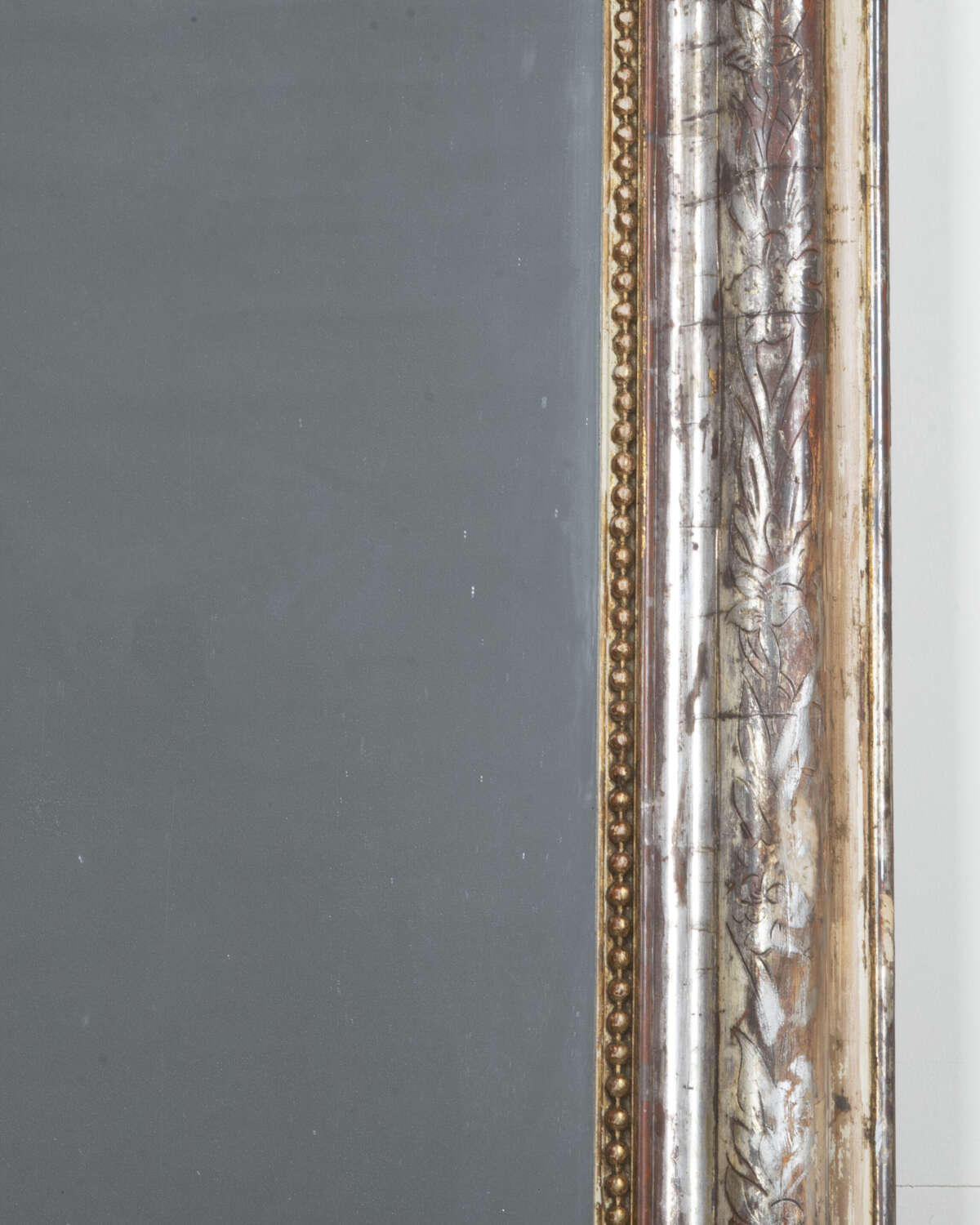 Original and beautifully aged mercury glass plate, silver gilt frame with floral and foliate etching over a russet bole.