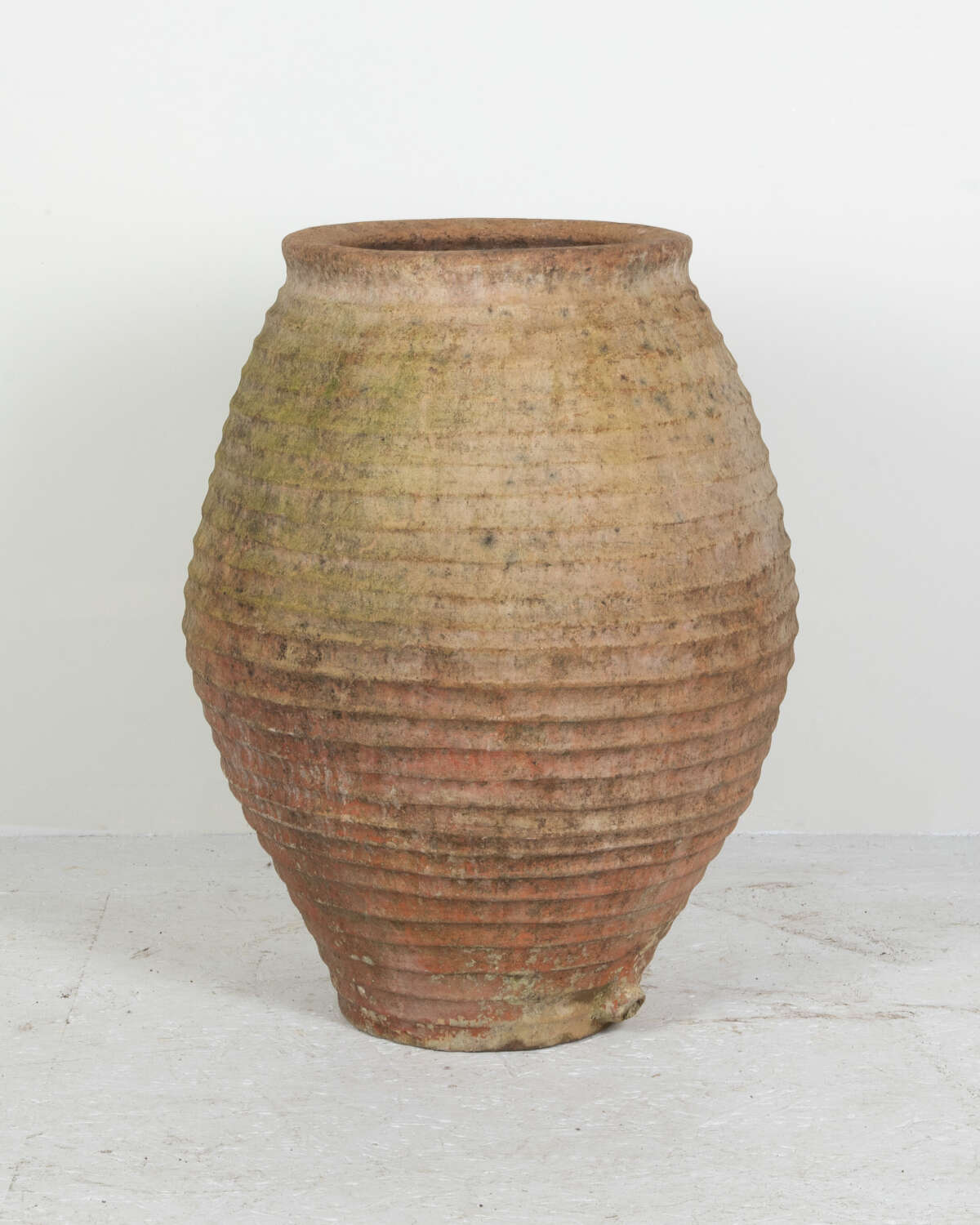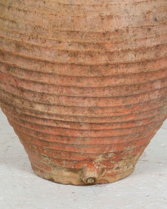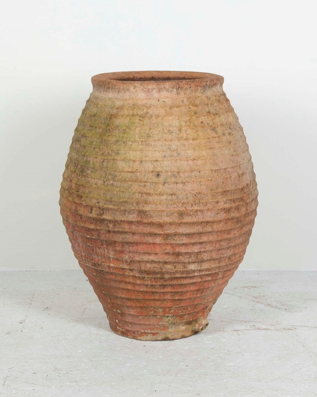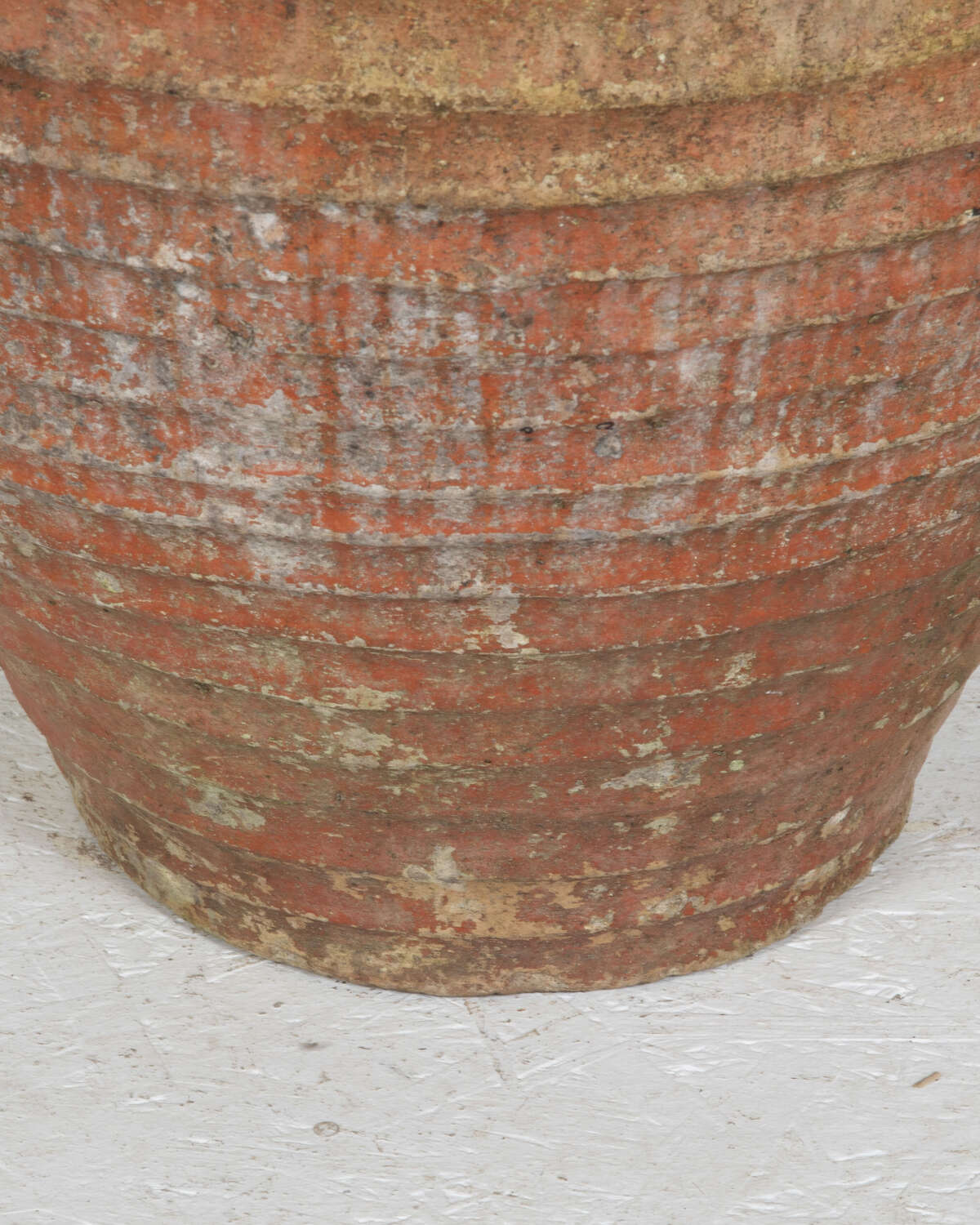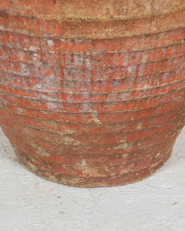 Large 19th Century Spanish ribbed terracotta olive jar.In gently distressed original red paintwith great rustic decorative appeal.