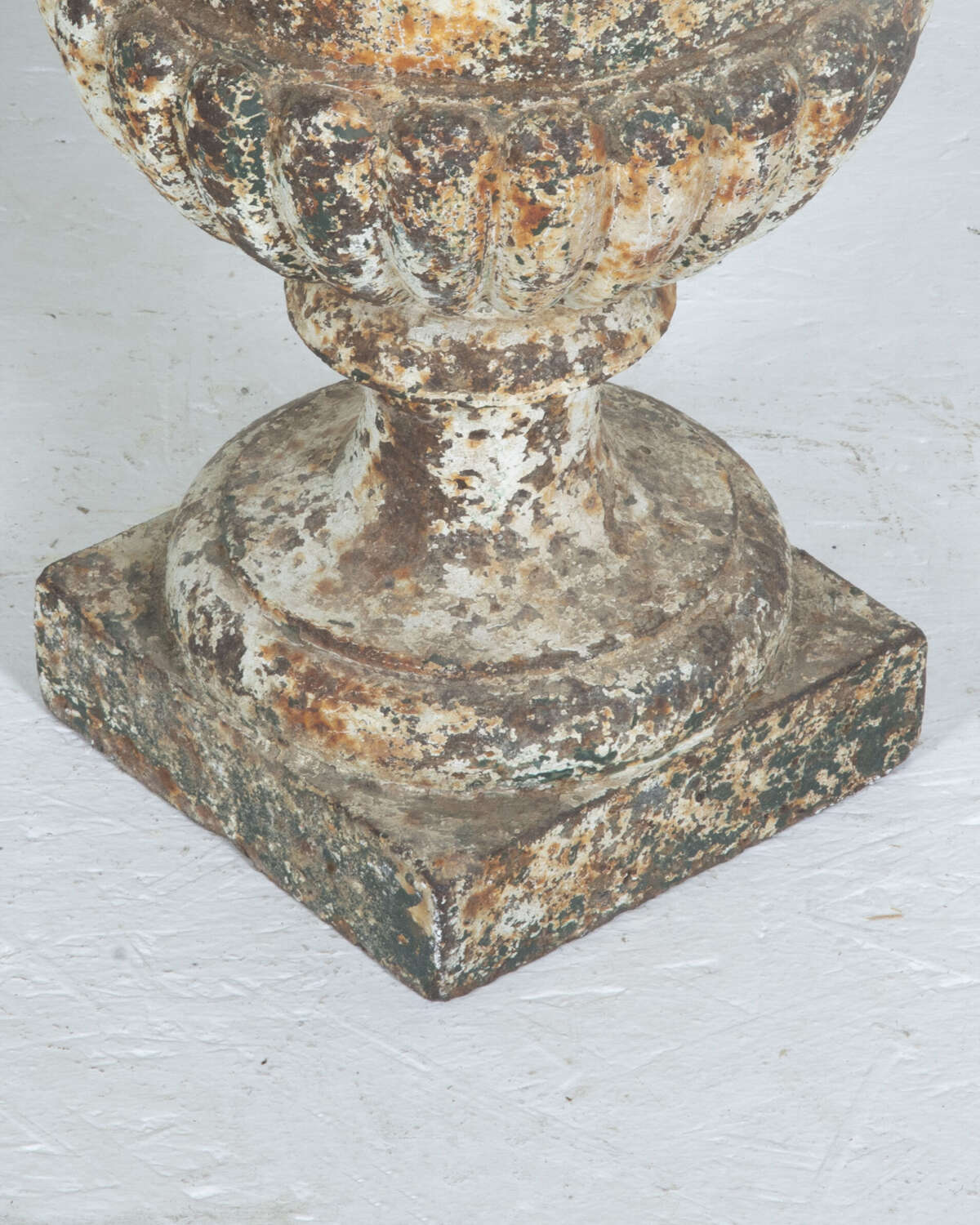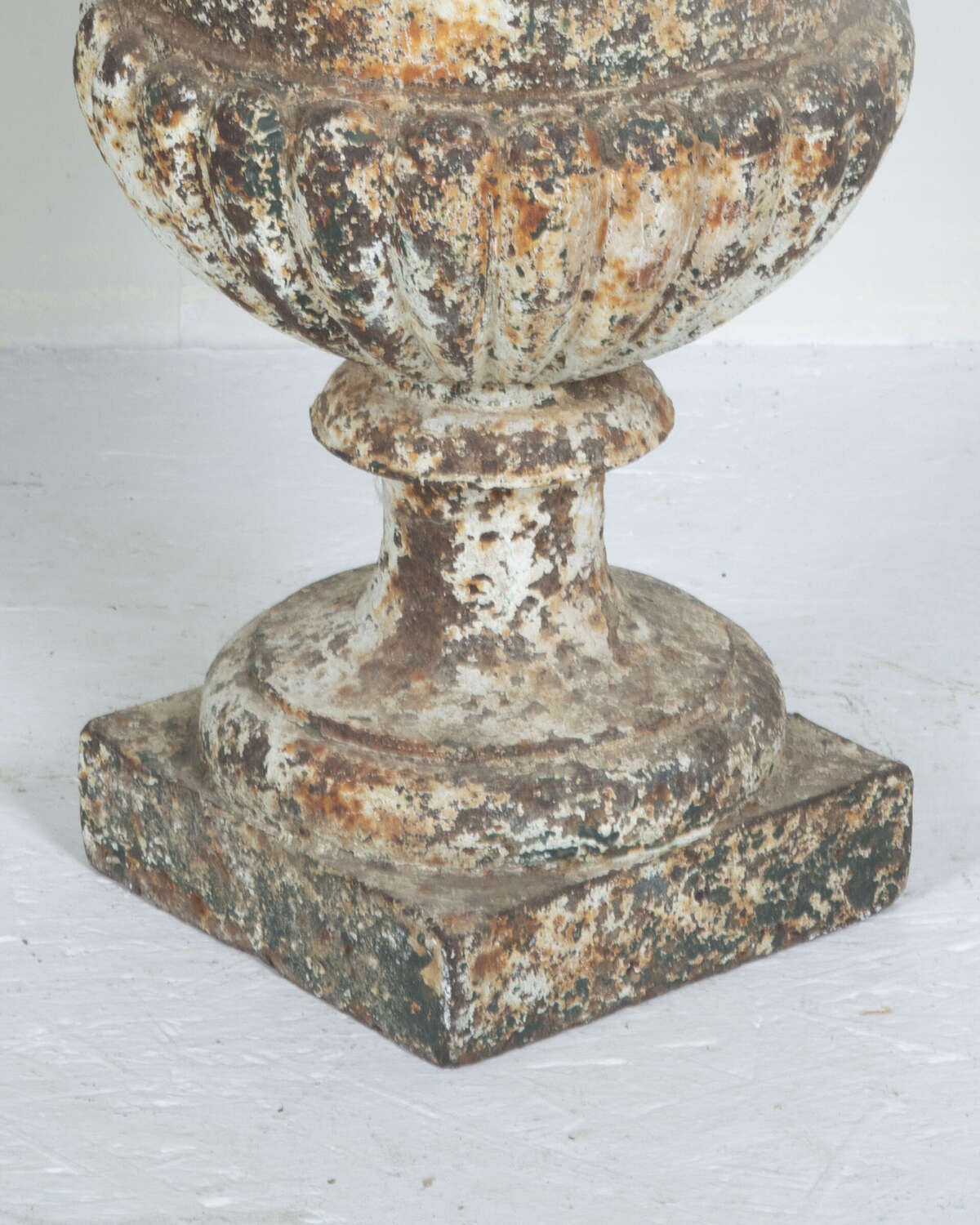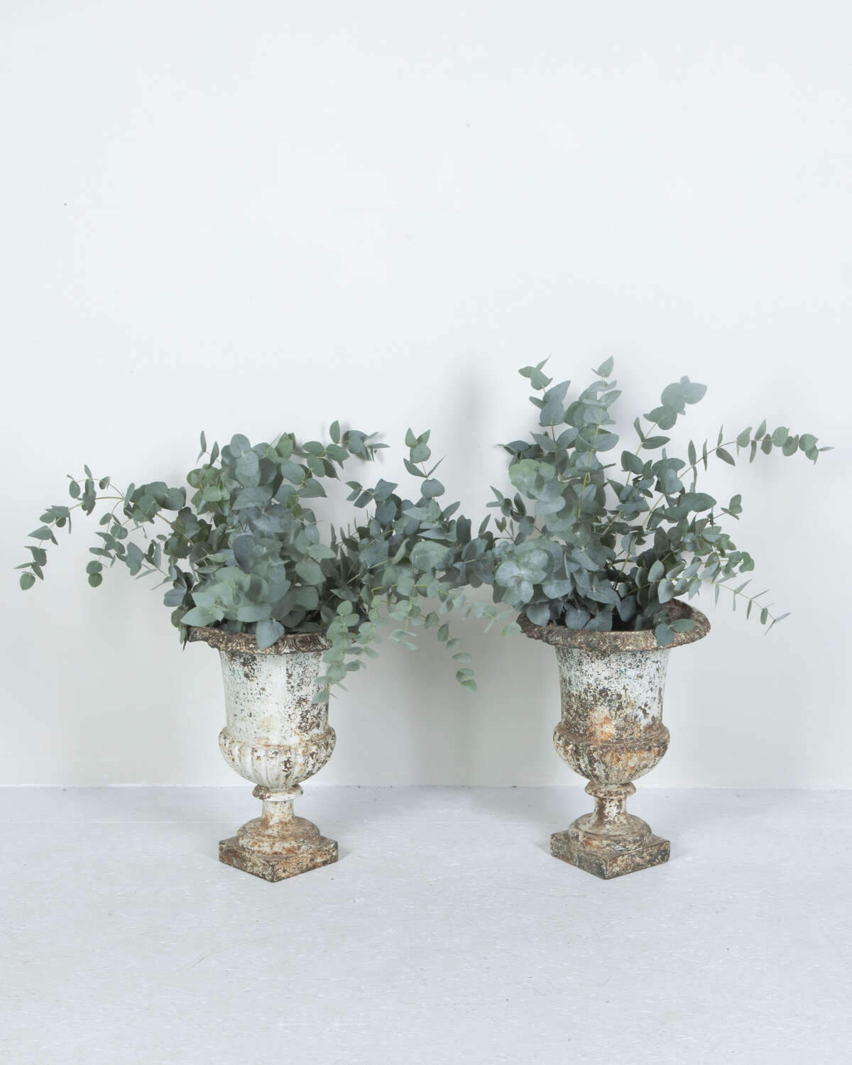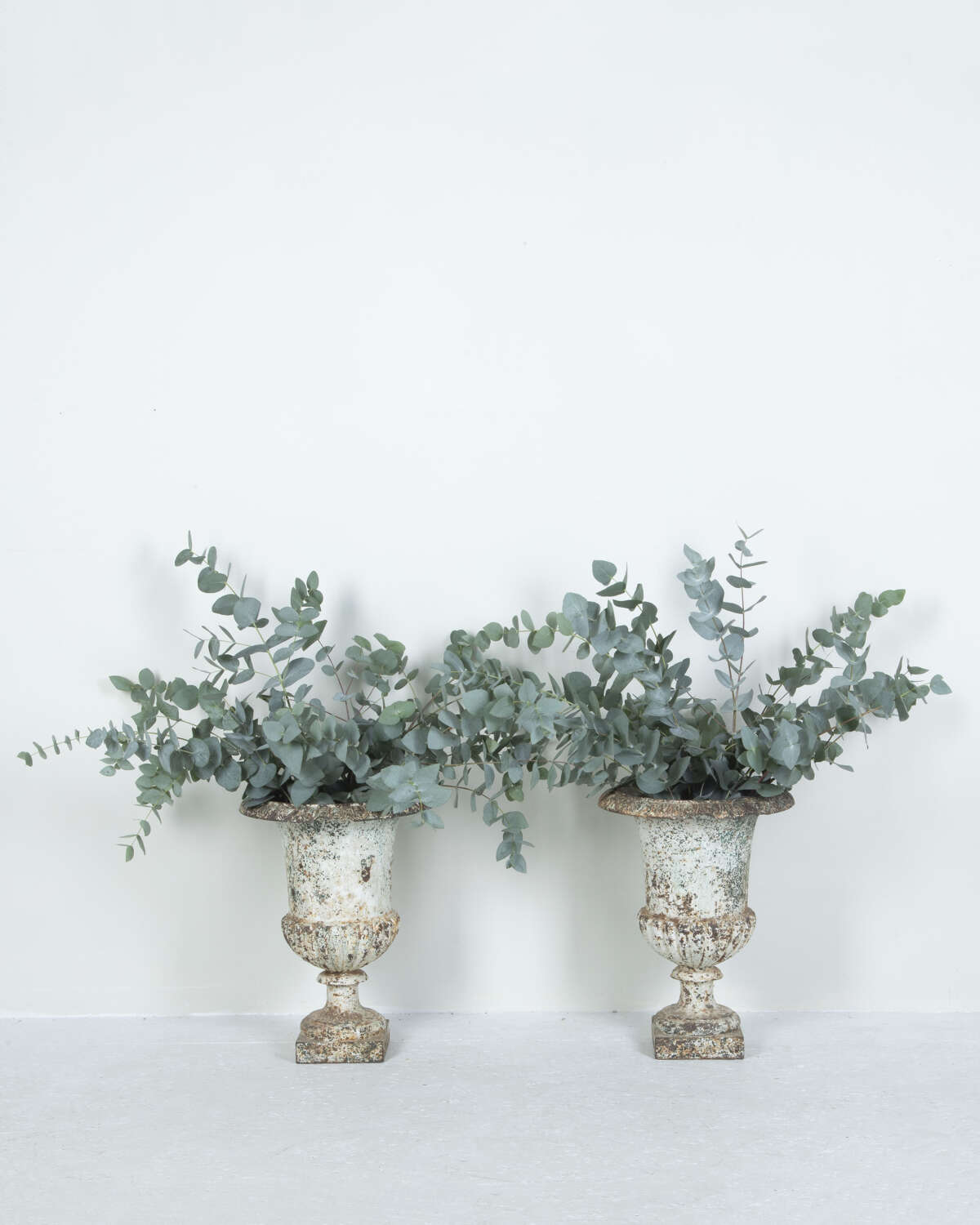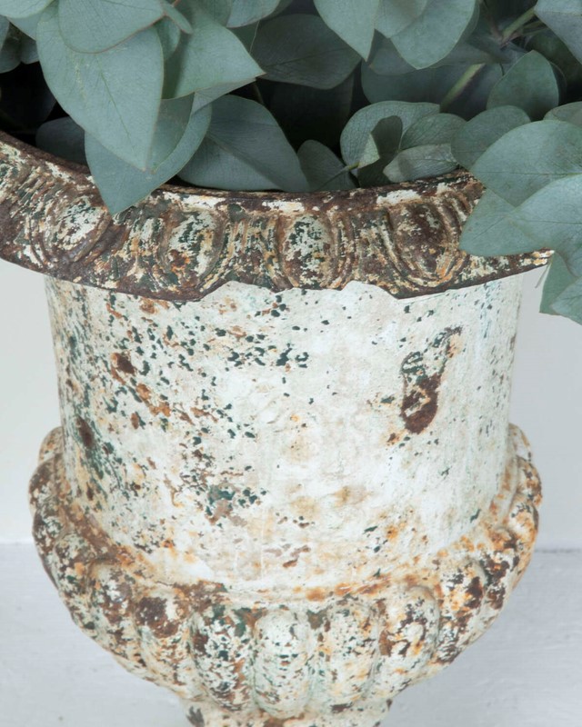 Pair of 19th Century French cast iron urns of campana form. Classical urns of great quality and weight with lovely weathered patina.