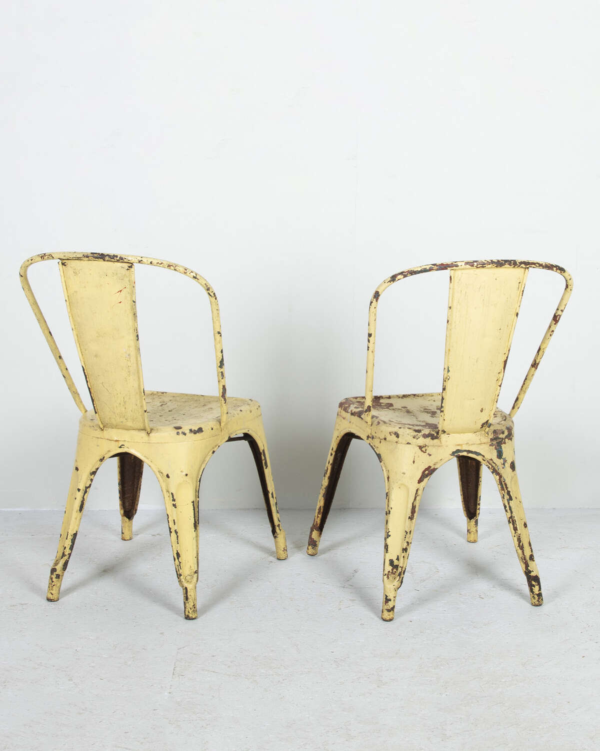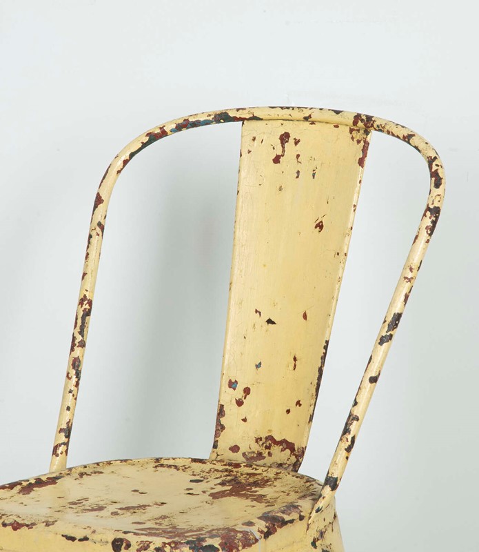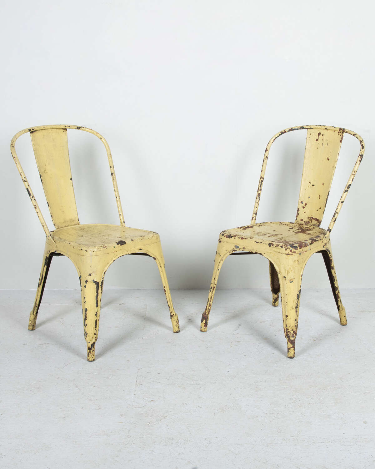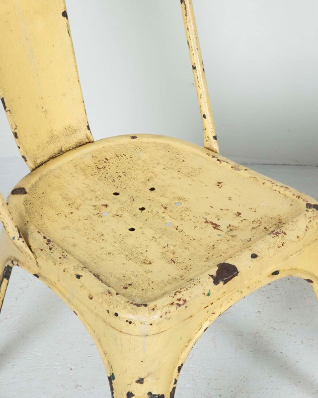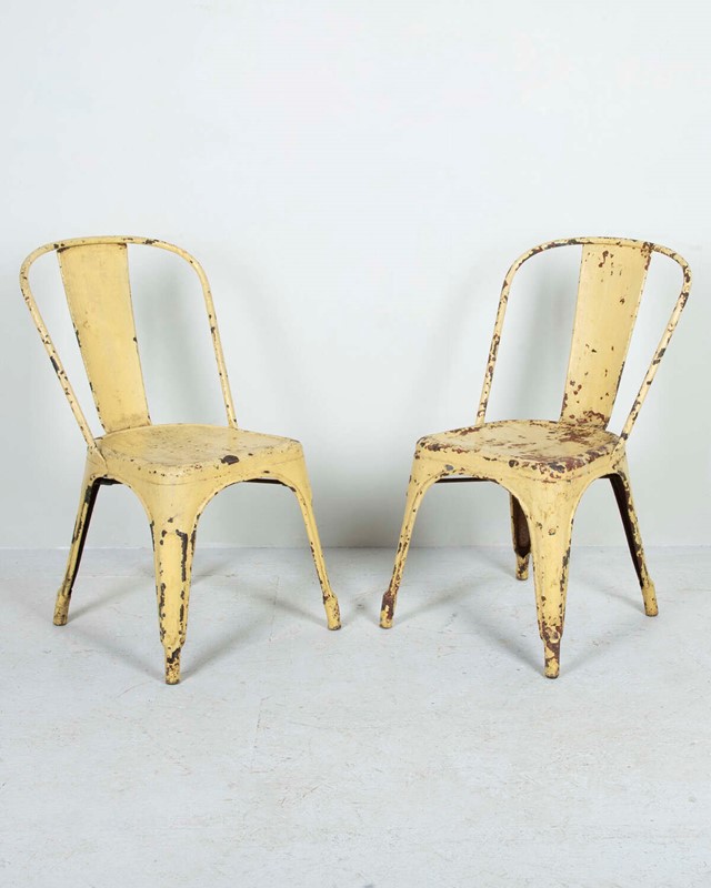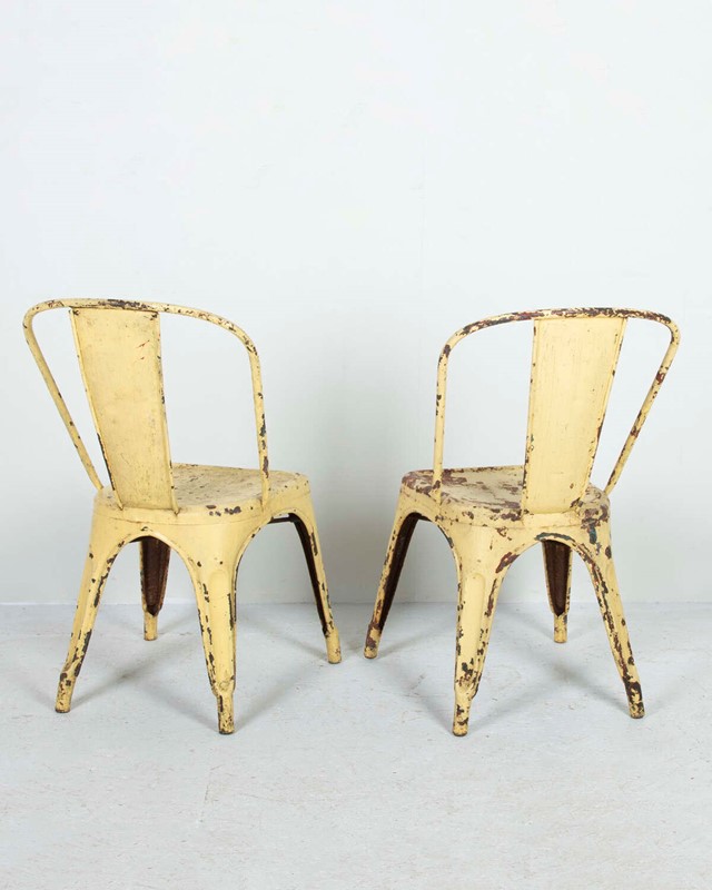 Pair of mid 20th Century pressed metal chairs from the famous French 'Tolix' company. Worn and distressed yellow paint commensurate withage and use.