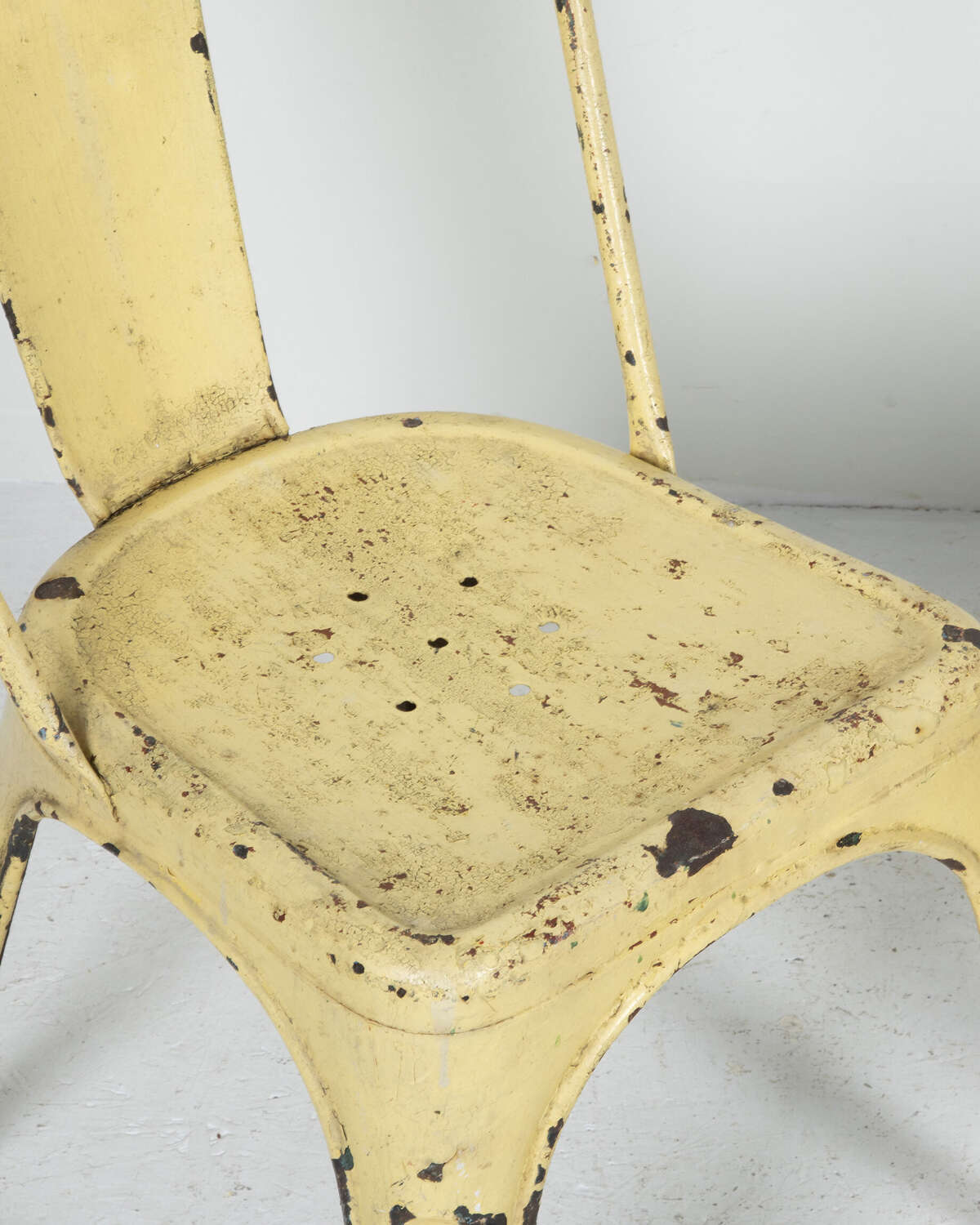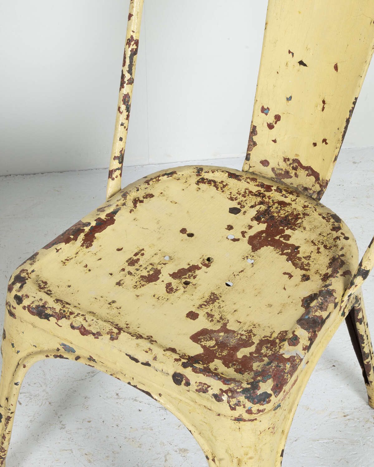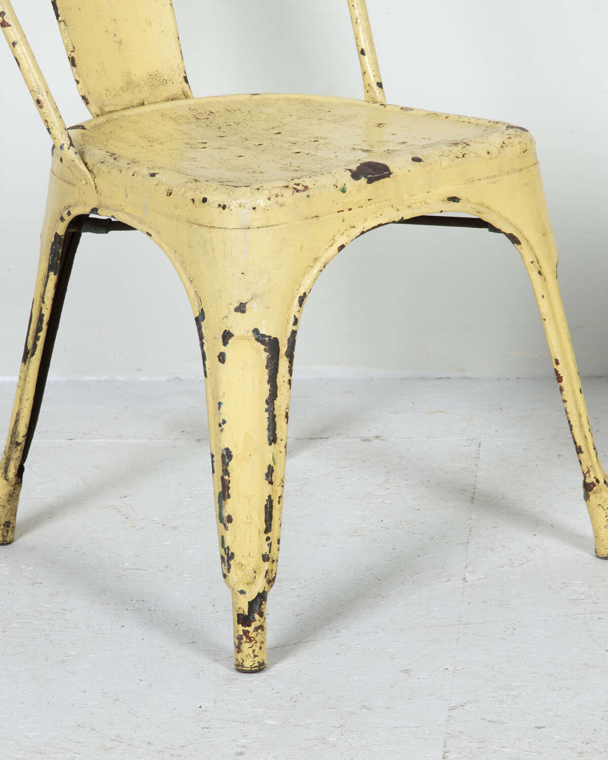 Pair of mid 20th Century pressed metal chairs from the famous French 'Tolix' company. Worn and distressed yellow paint commensurate withage and use.