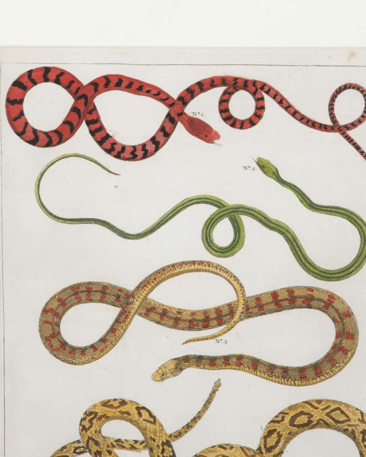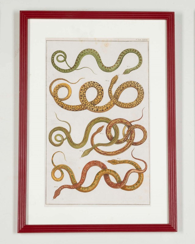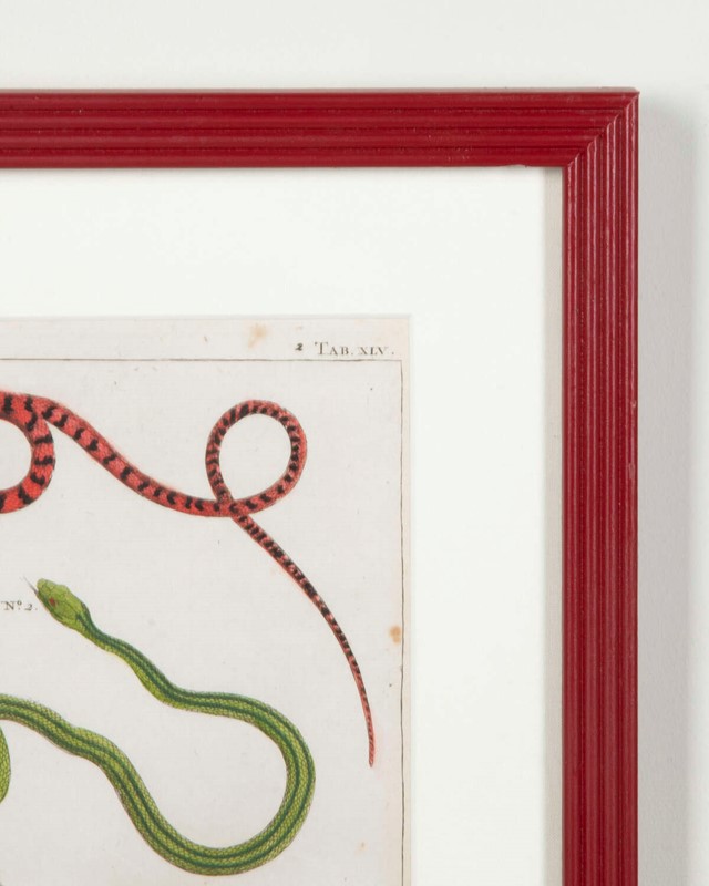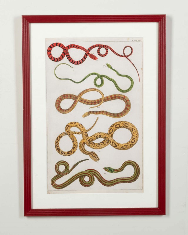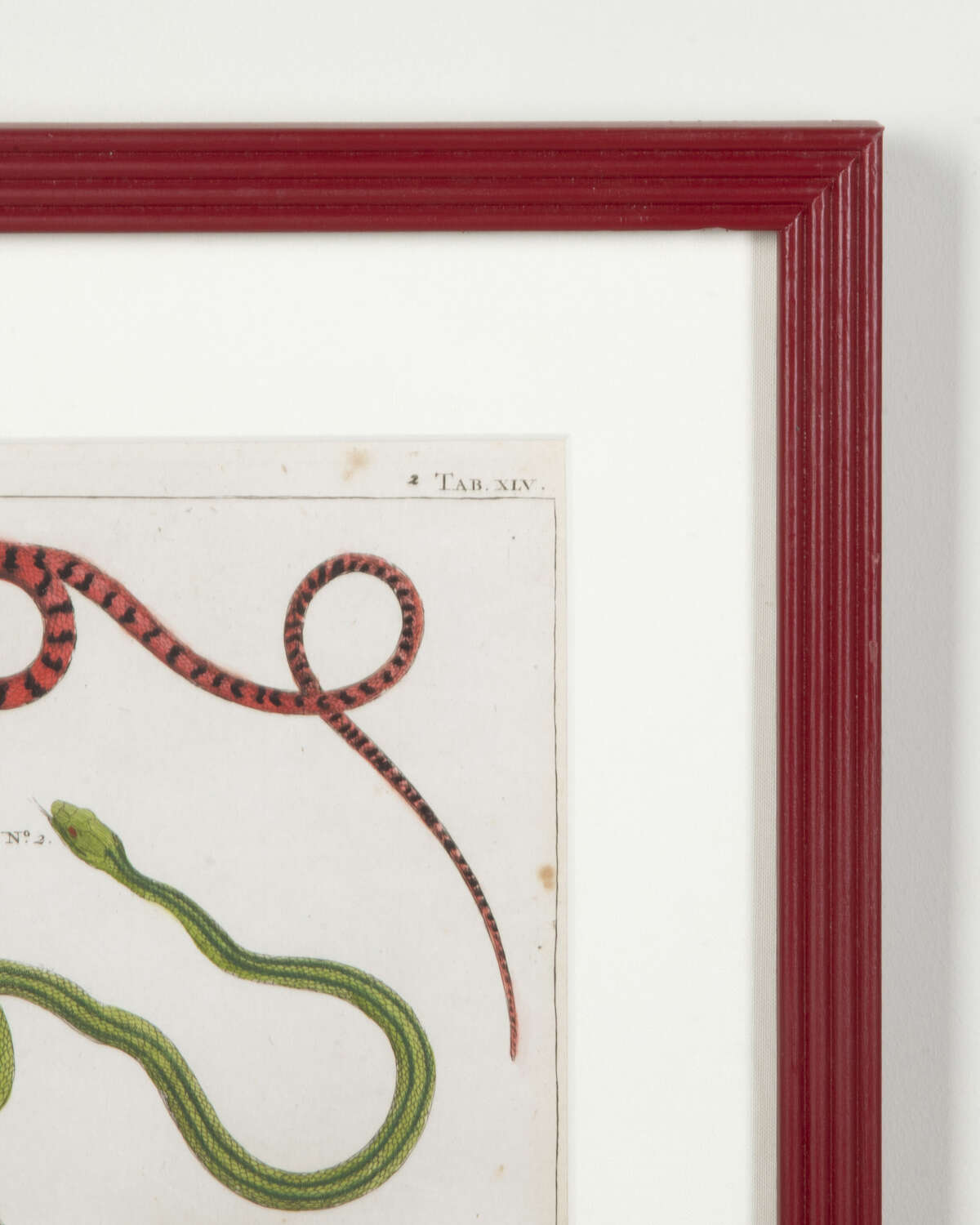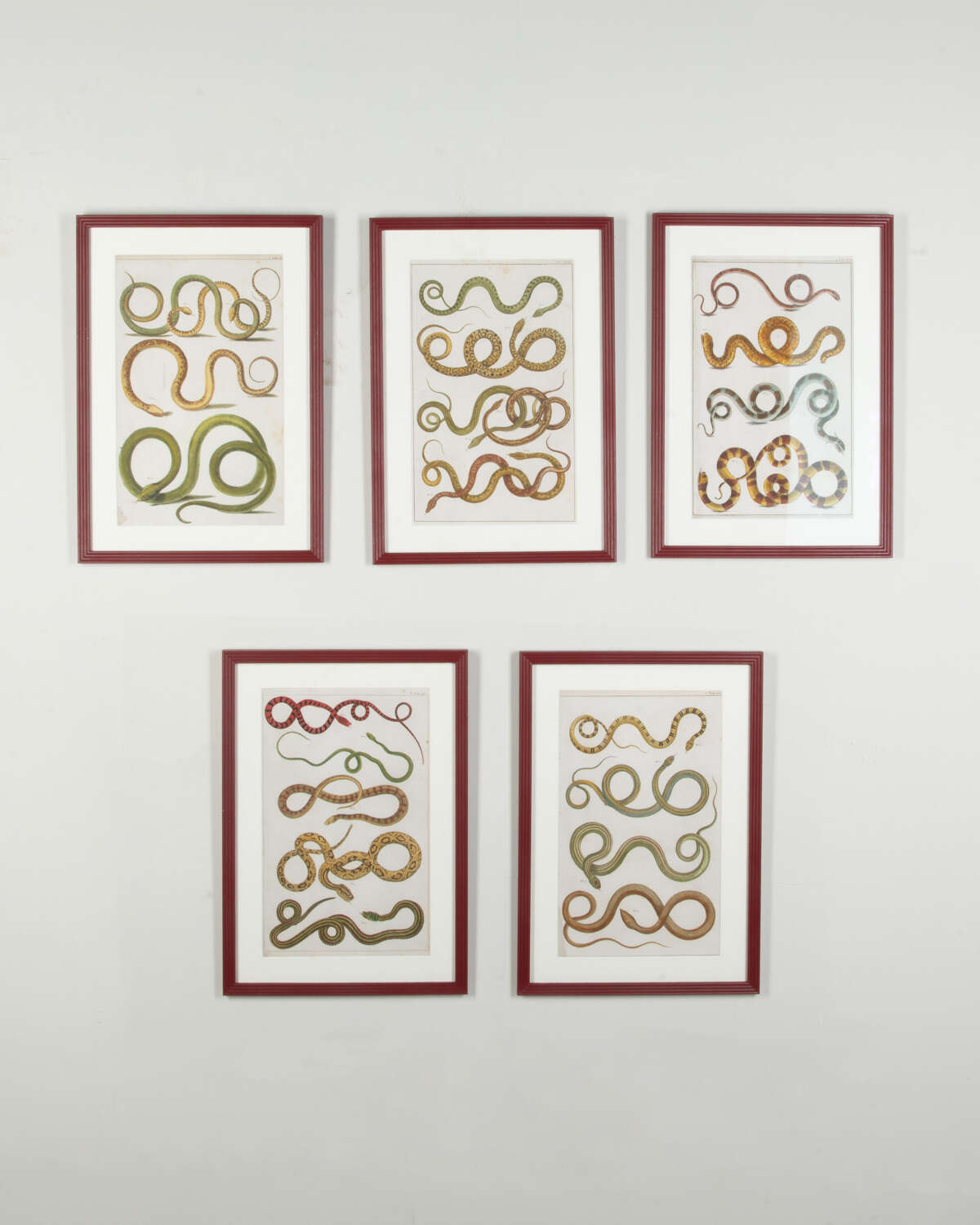 Set of five 18th Century Albertus Seba hand-coloured snake engravings.Presented in bespoke hand-painted and lacquered red reeded frames with hessian mounts and AR70 Artglass for optimal clarity.Born in Etzel, near Friedeburg, Seba moved to Amsterdam as an apprentice where later he opened a pharmacy near the harbour. Taking advantage of the location he asked sailors and ship surgeons to bring exotic plants and animal products which he could use for preparing drugs.