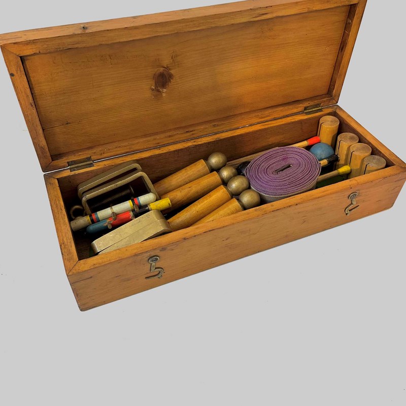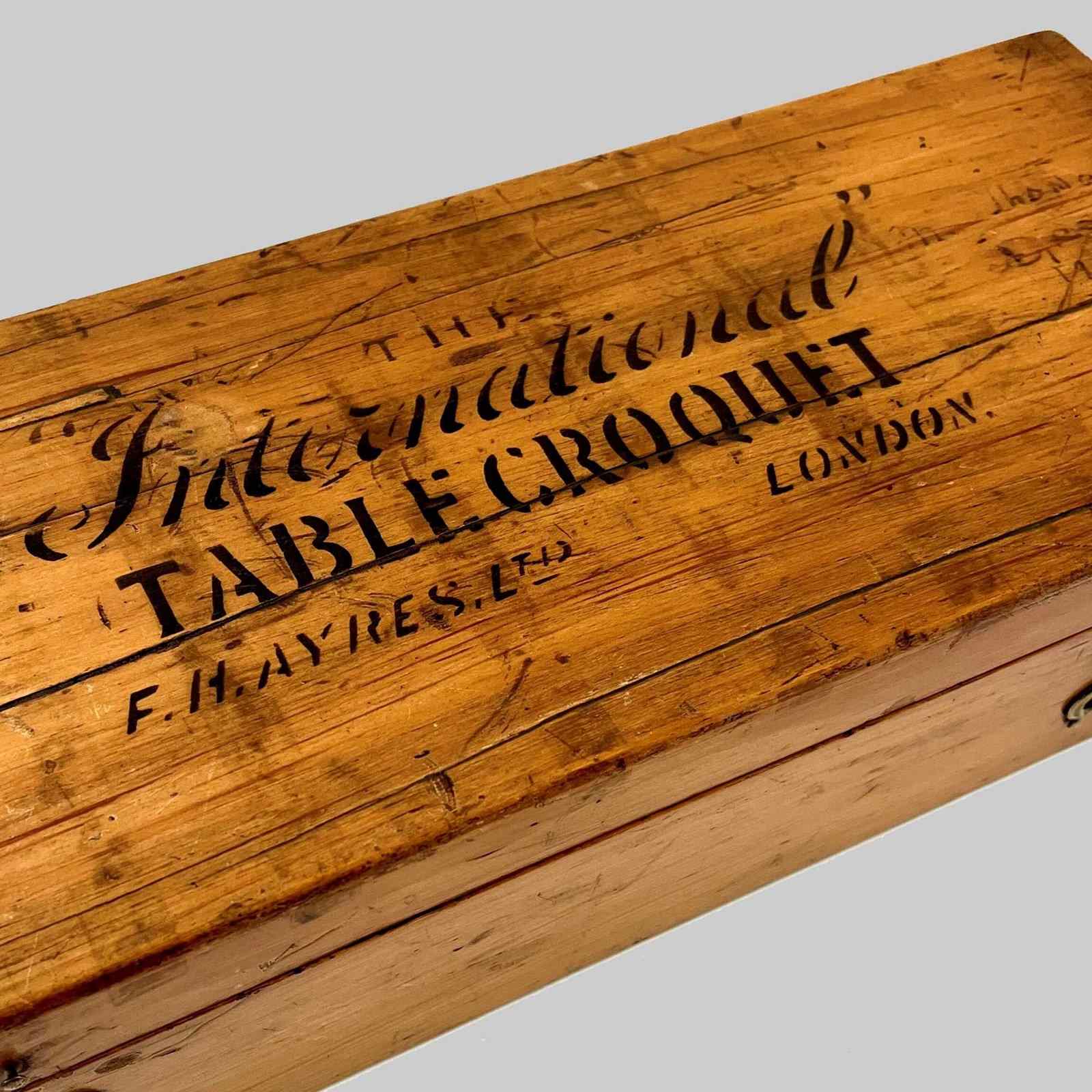 The ‘International Table Croquet’ By F.H.Ayres Ltd., London. The set complete for up to four players, with wooden mallets and wooden painted balls, starting and finishing posts, 6 hoops, 4 table clamps and boundary tape. The clamps attach to the corners of the table and the boundary tape is stretched around them to prevent the balls rolling off the table. The posts and hoops detach from their green painted bases to pack into the box. All contained within the original box with the name printed to the lid.