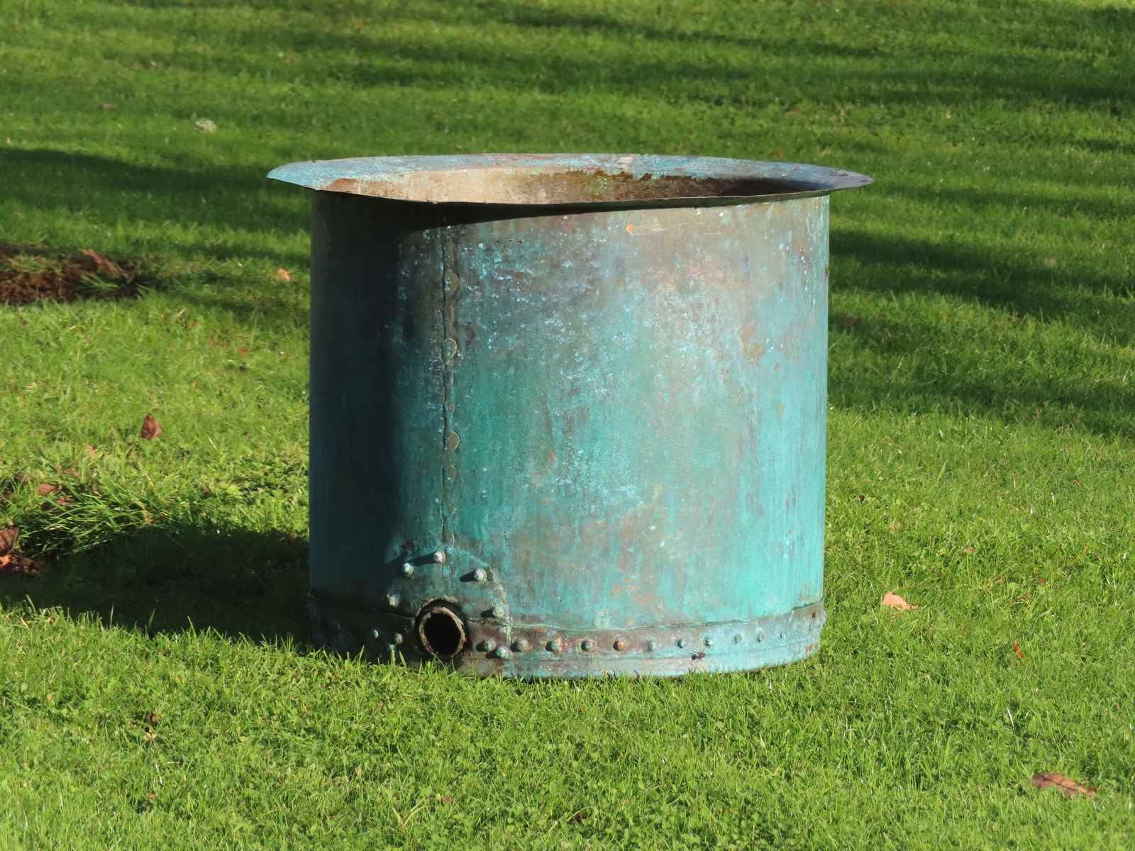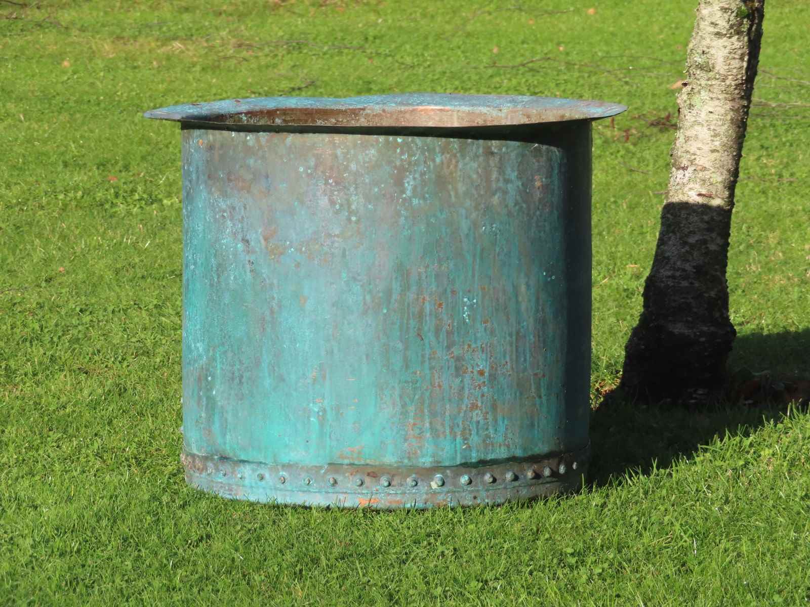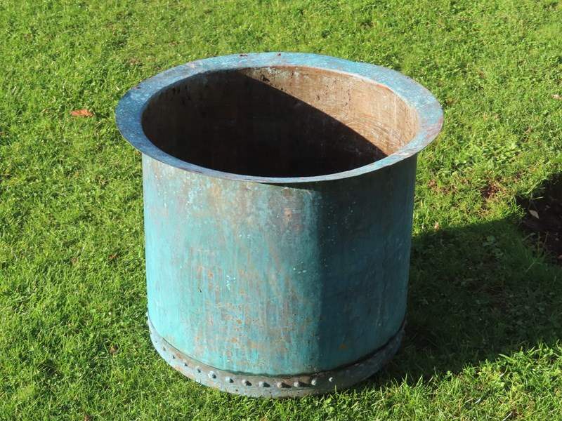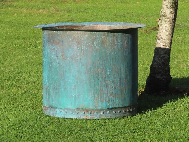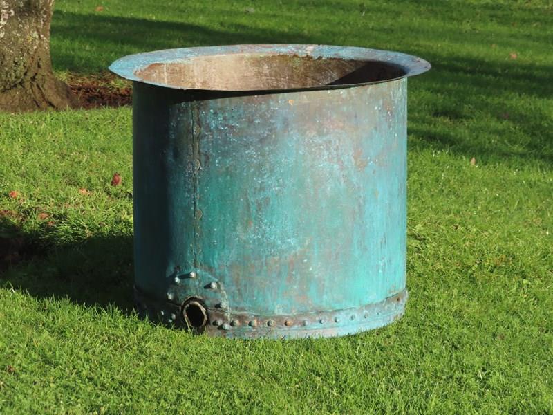 19th century copper planter. Beautiful riveted verdigris copper.