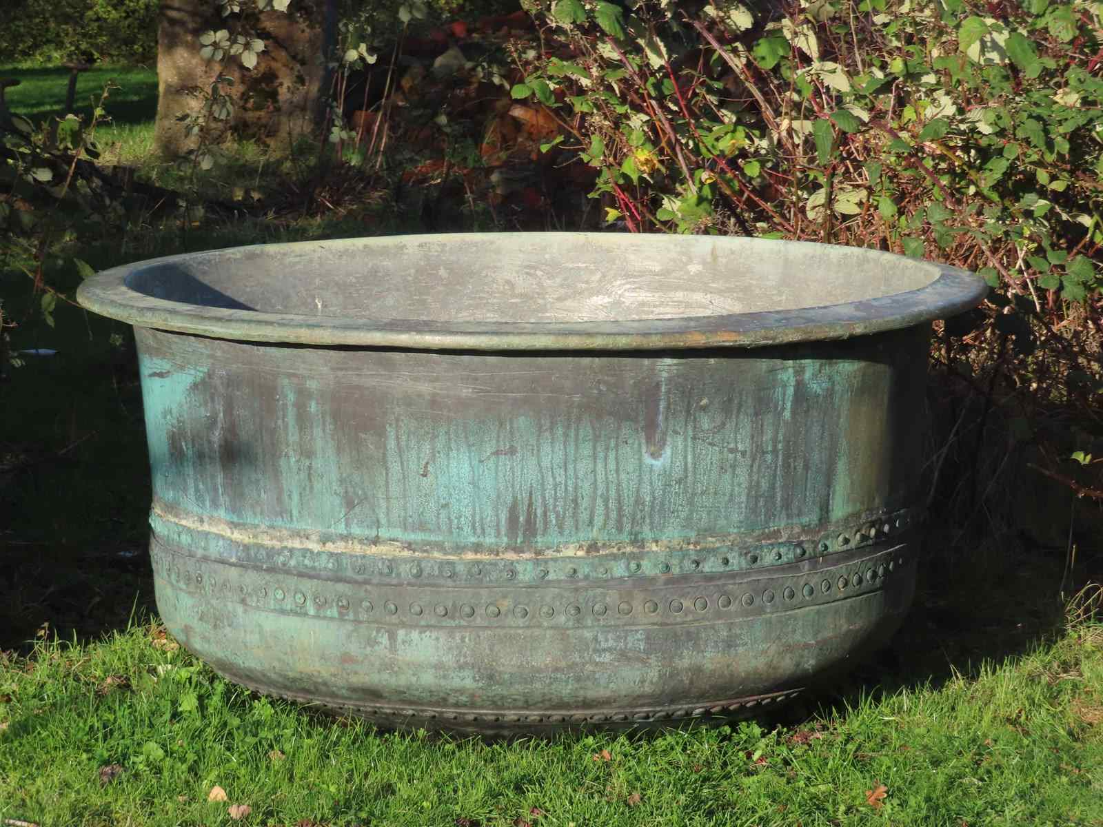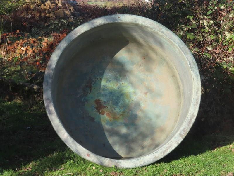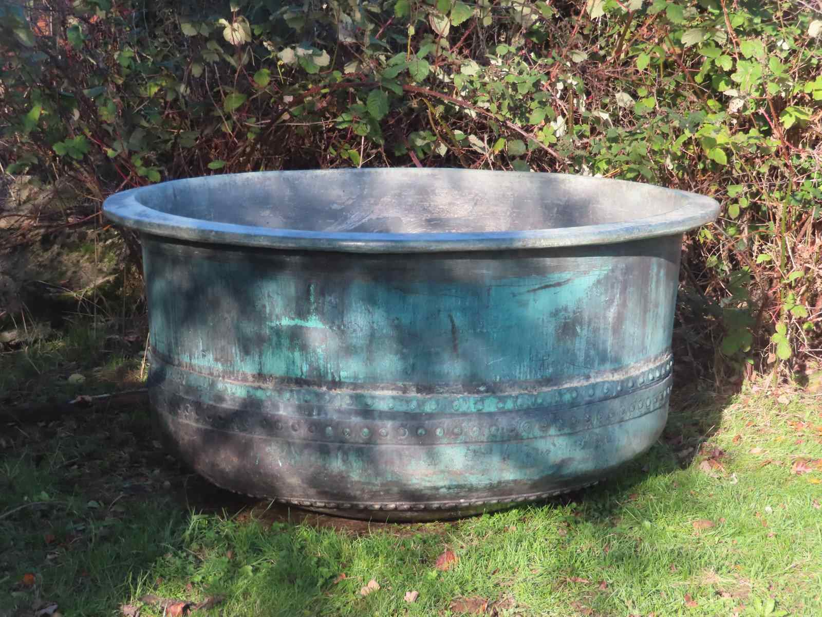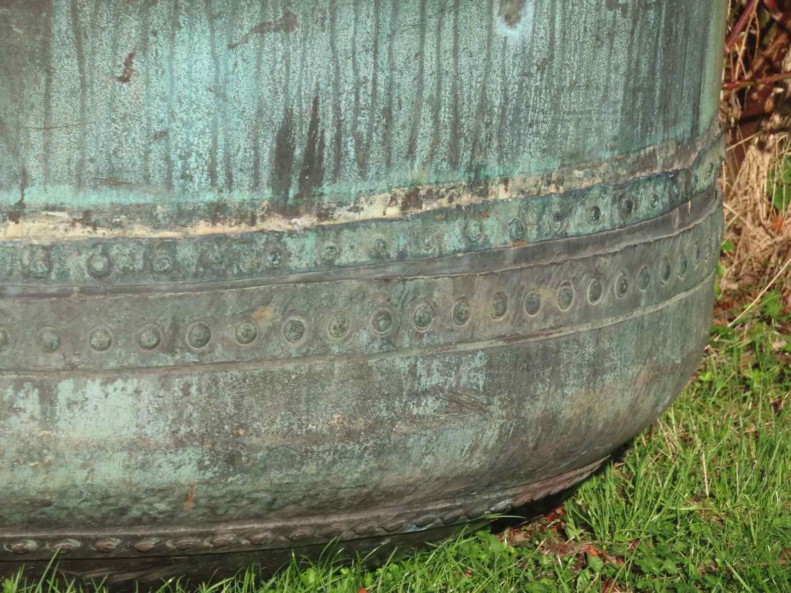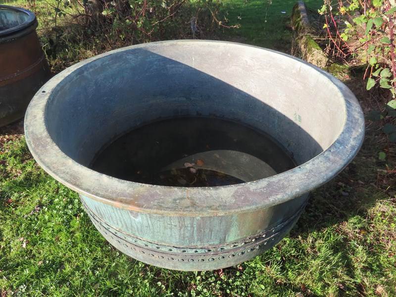 Gorgeous riveted copper that holds water making it perfect as a water feature or basin. Could be drilled for planting drainage.