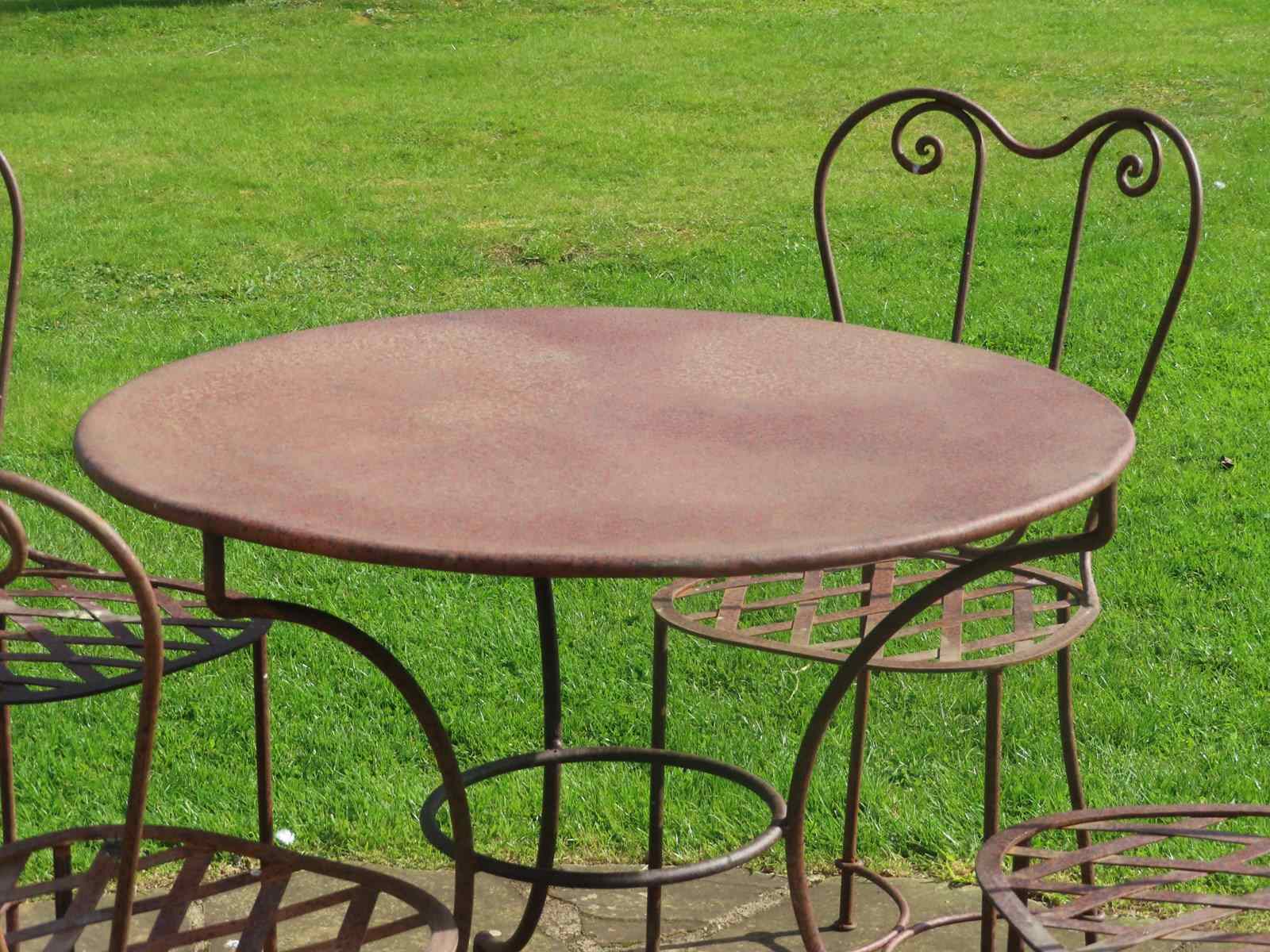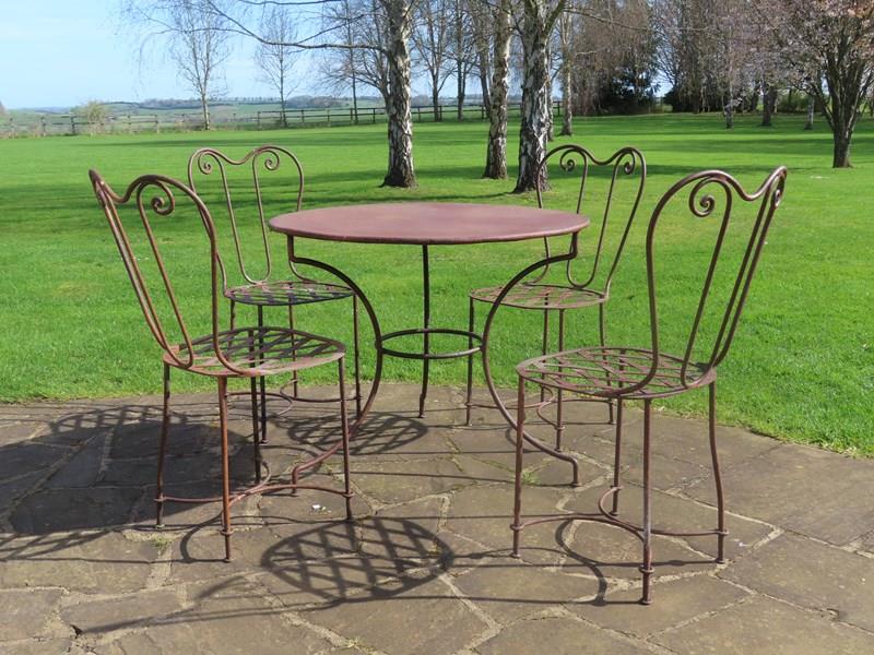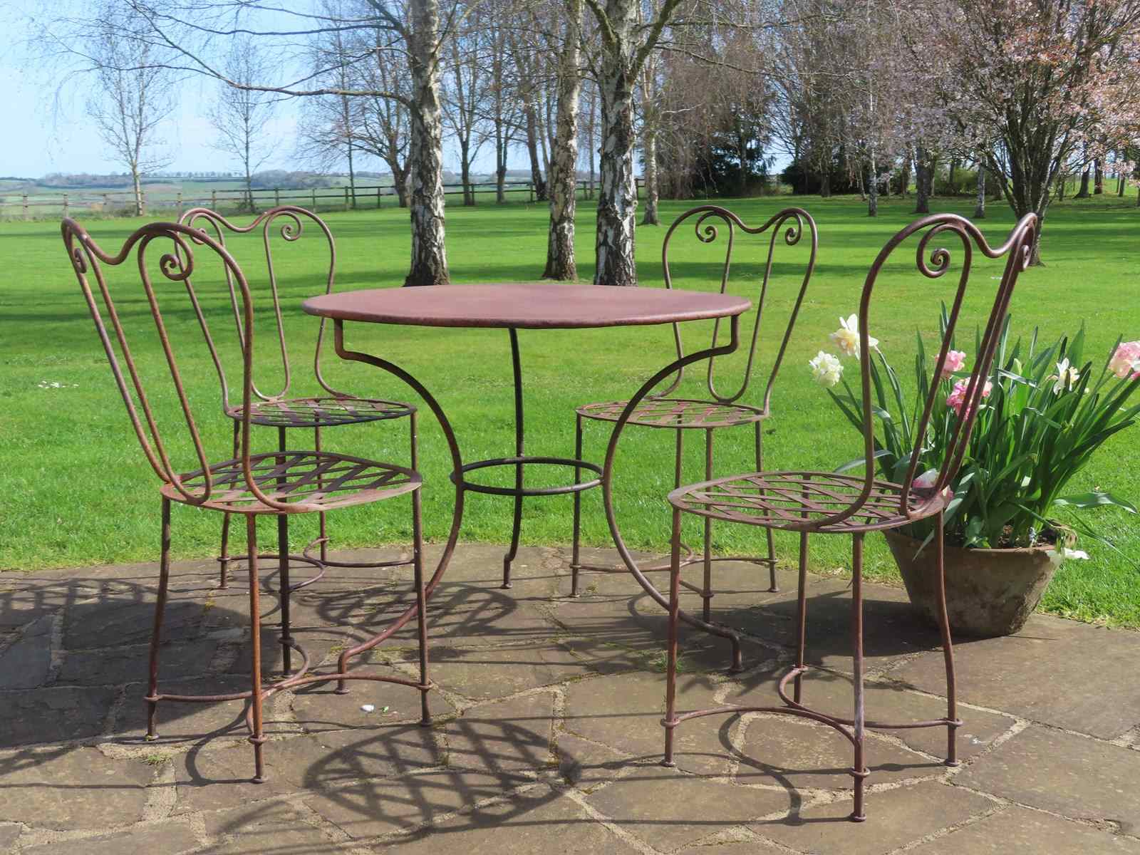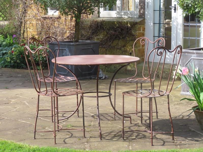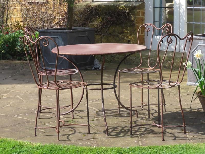 Antique iron table with four chairs. Late 19th century antique garden furniture. Each seat is in a lattice style with elegantly scrolled back.