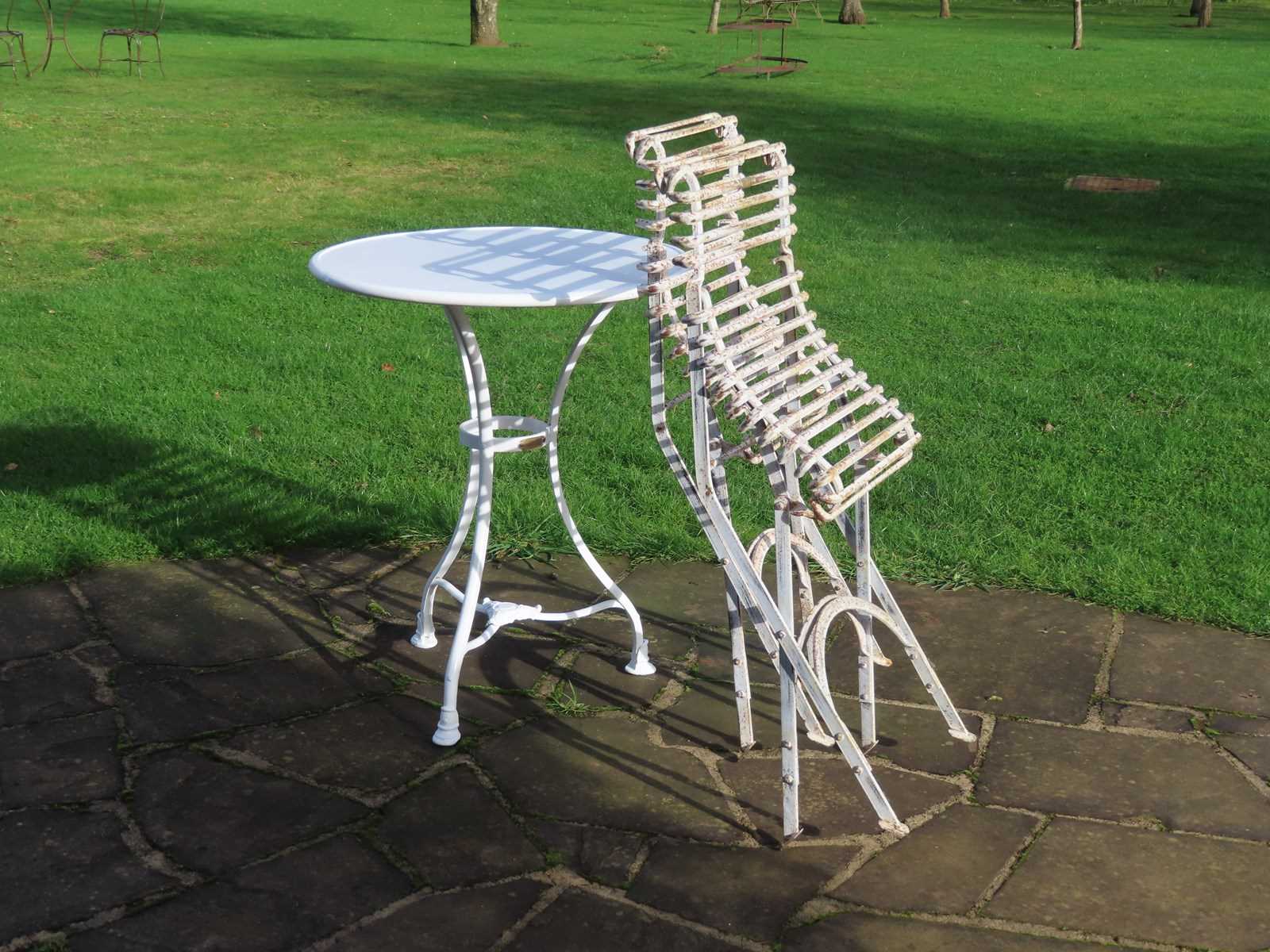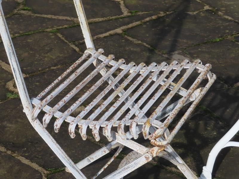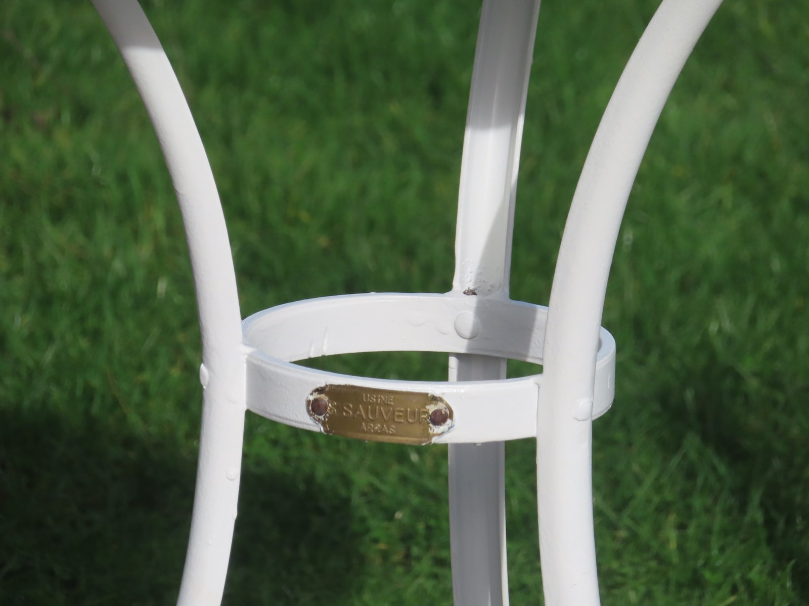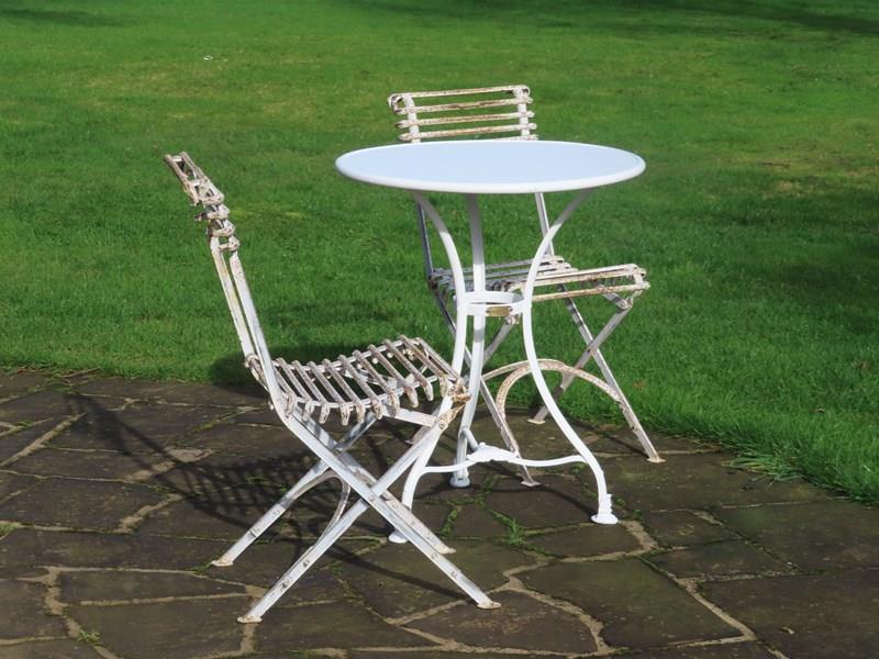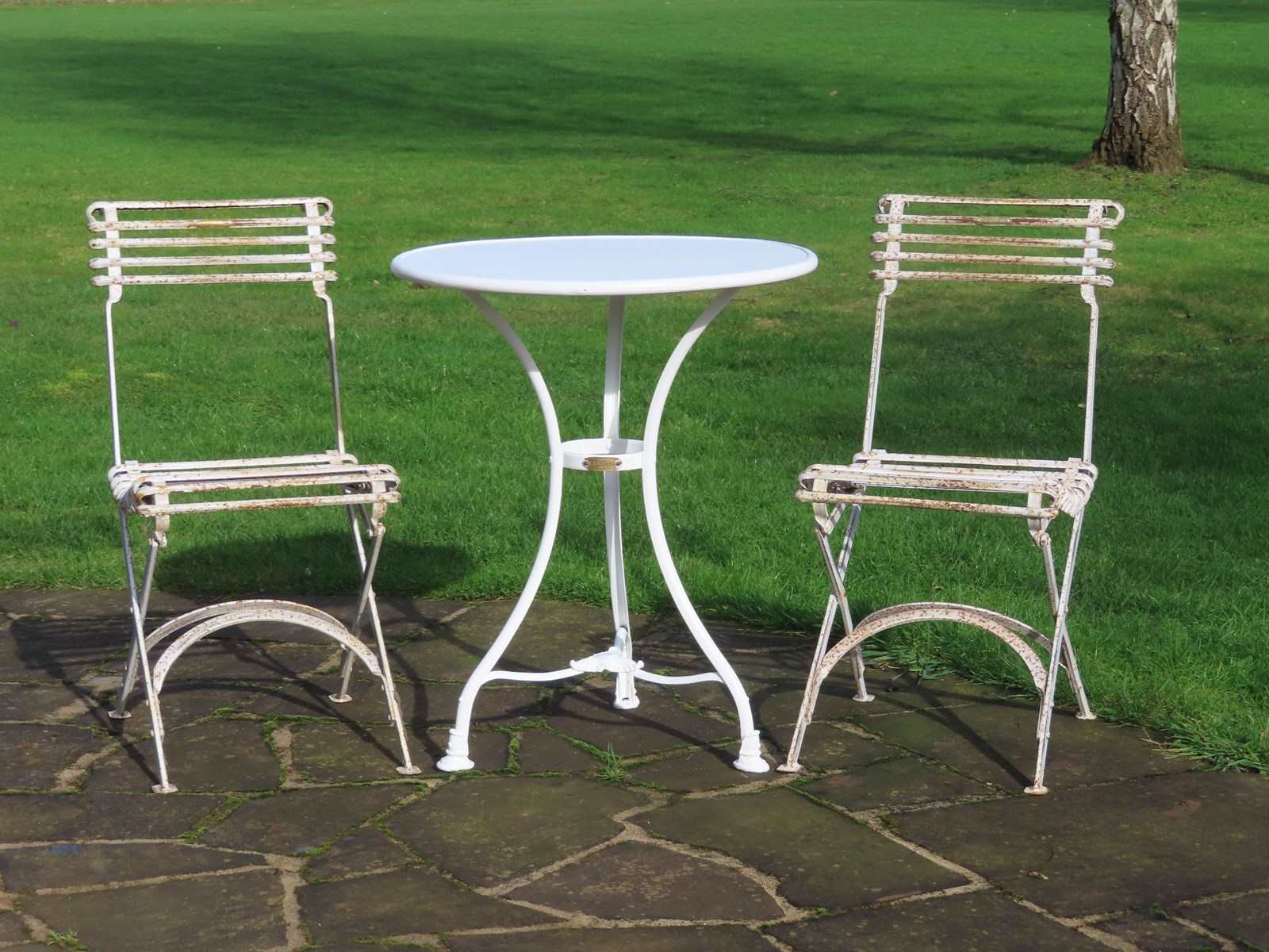 Arras iron bistro table with a pair of folding chairs. With the distinctive hoof feet and maker's mark.