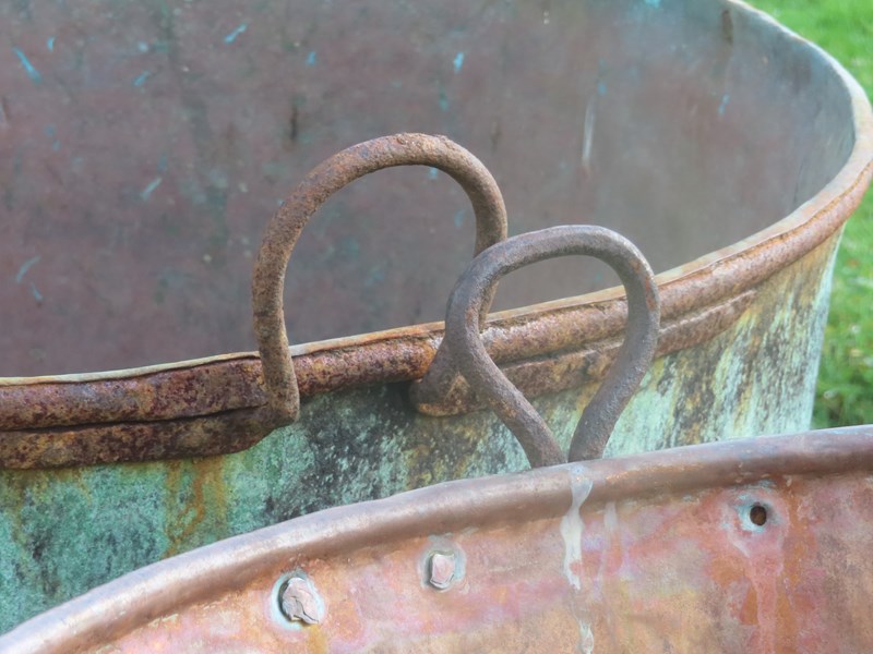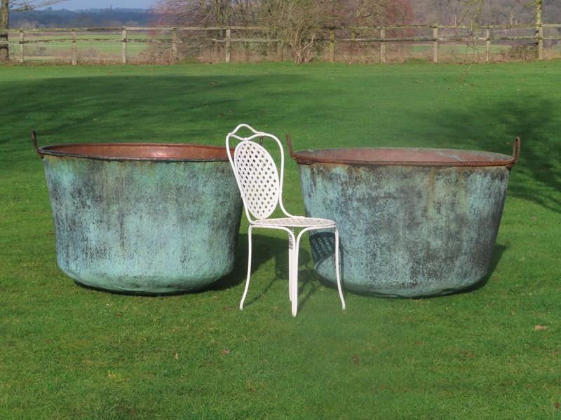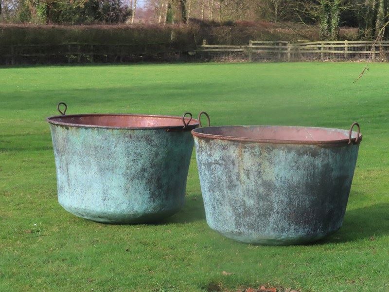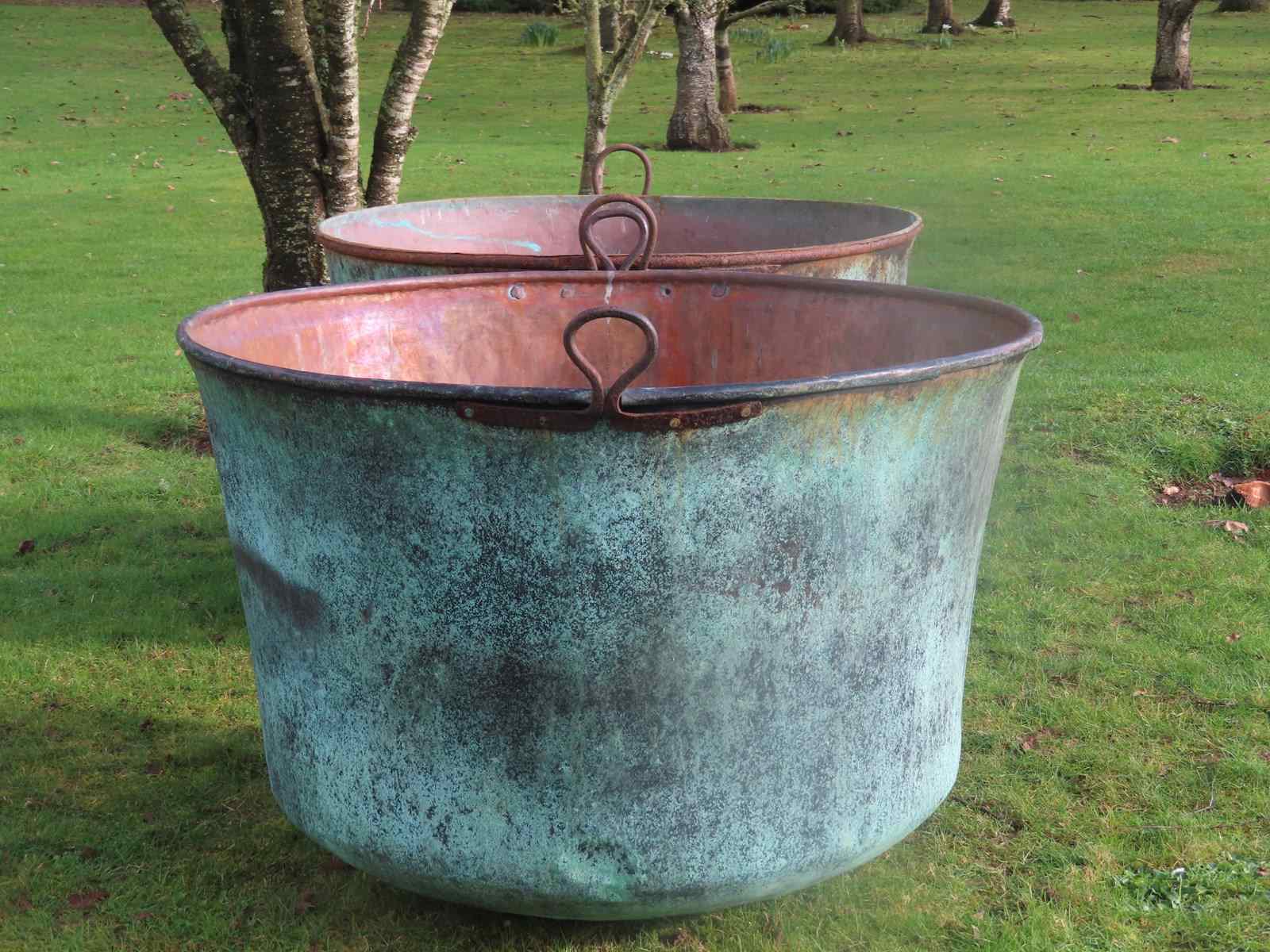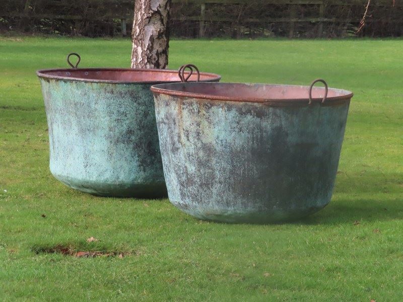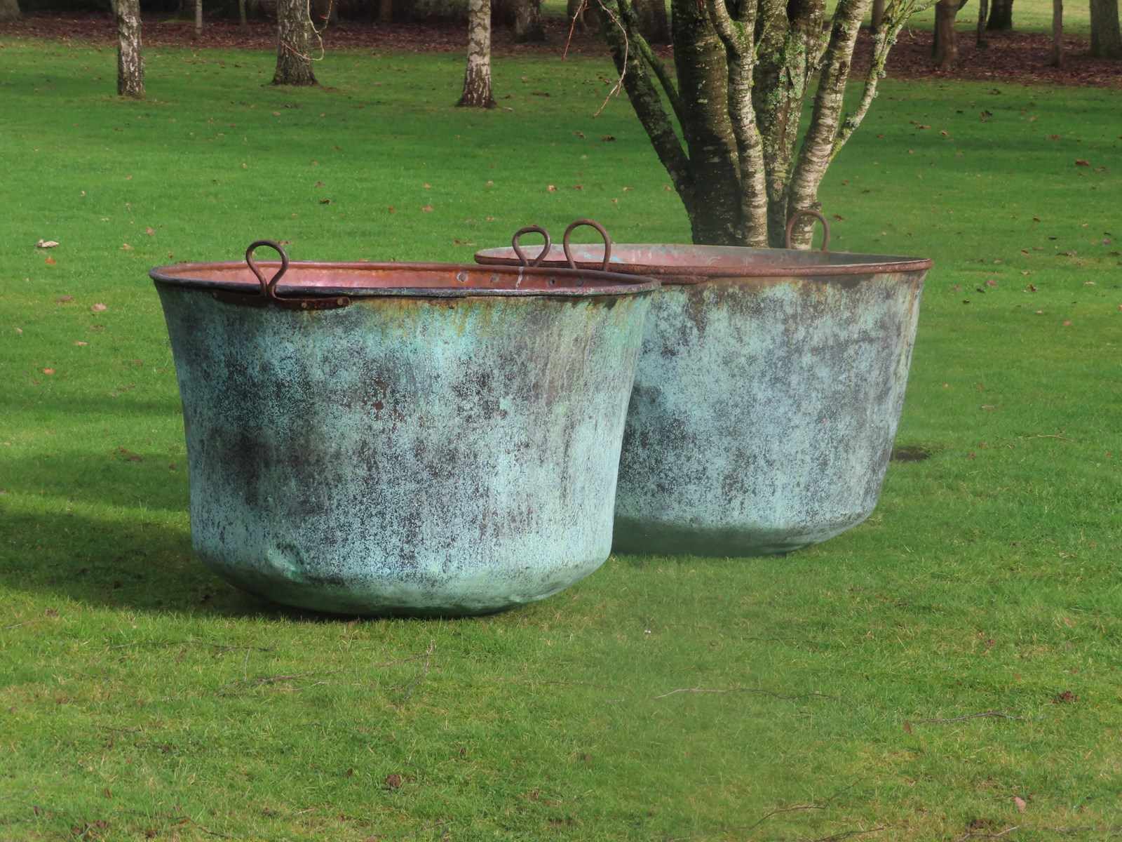 These beautifully patinated copper basins have iron handles and no drainage holes, so they can hold water. They could be drilled for planting small trees or bushes.