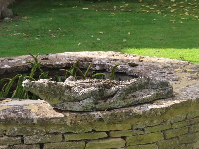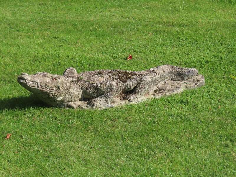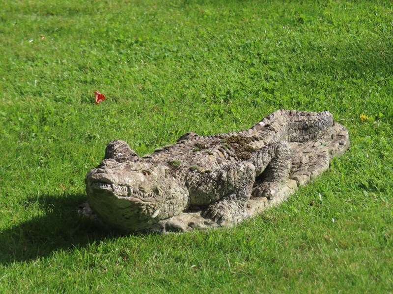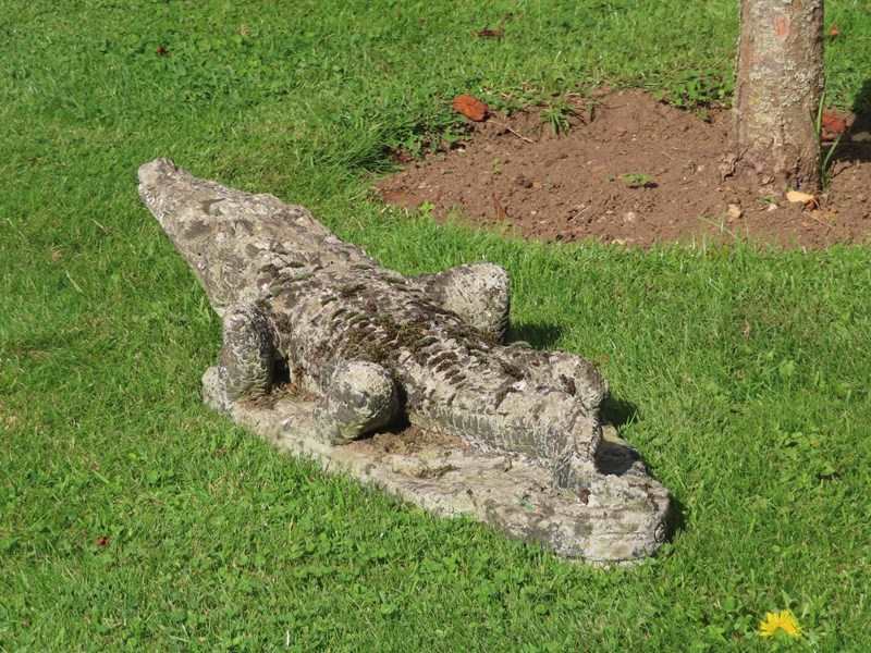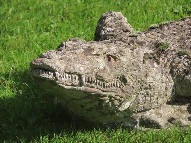 This old crocodile is a fun piece for the garden. Well weathered composition stone.