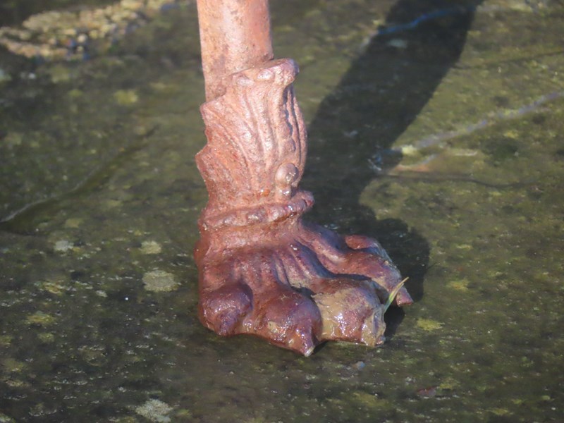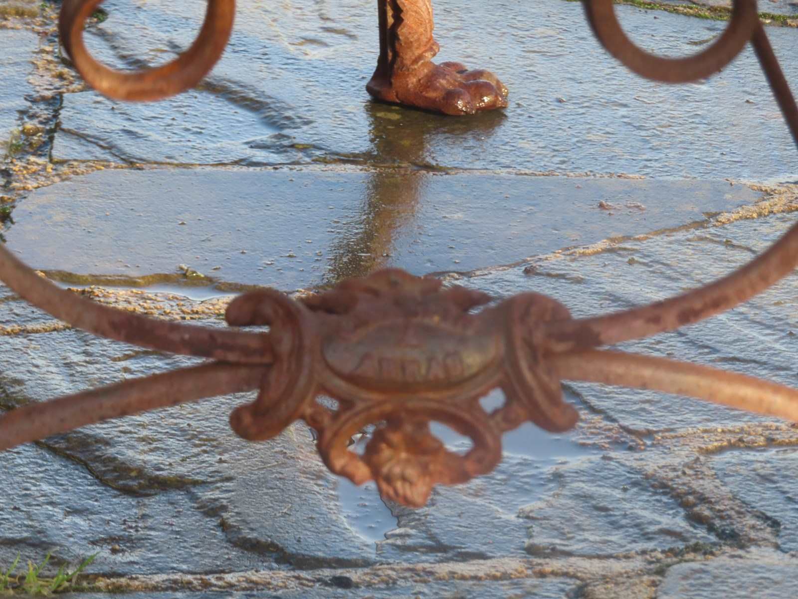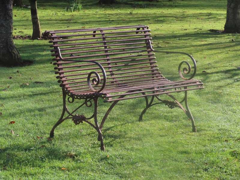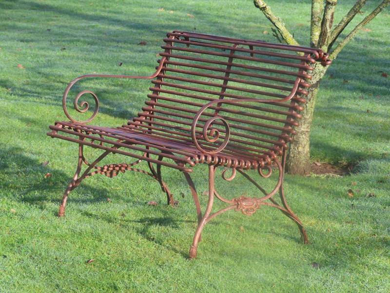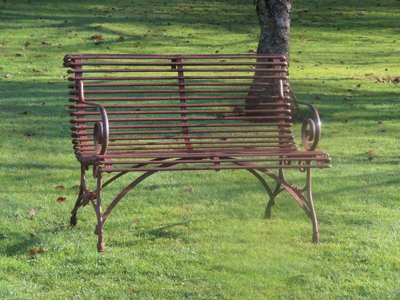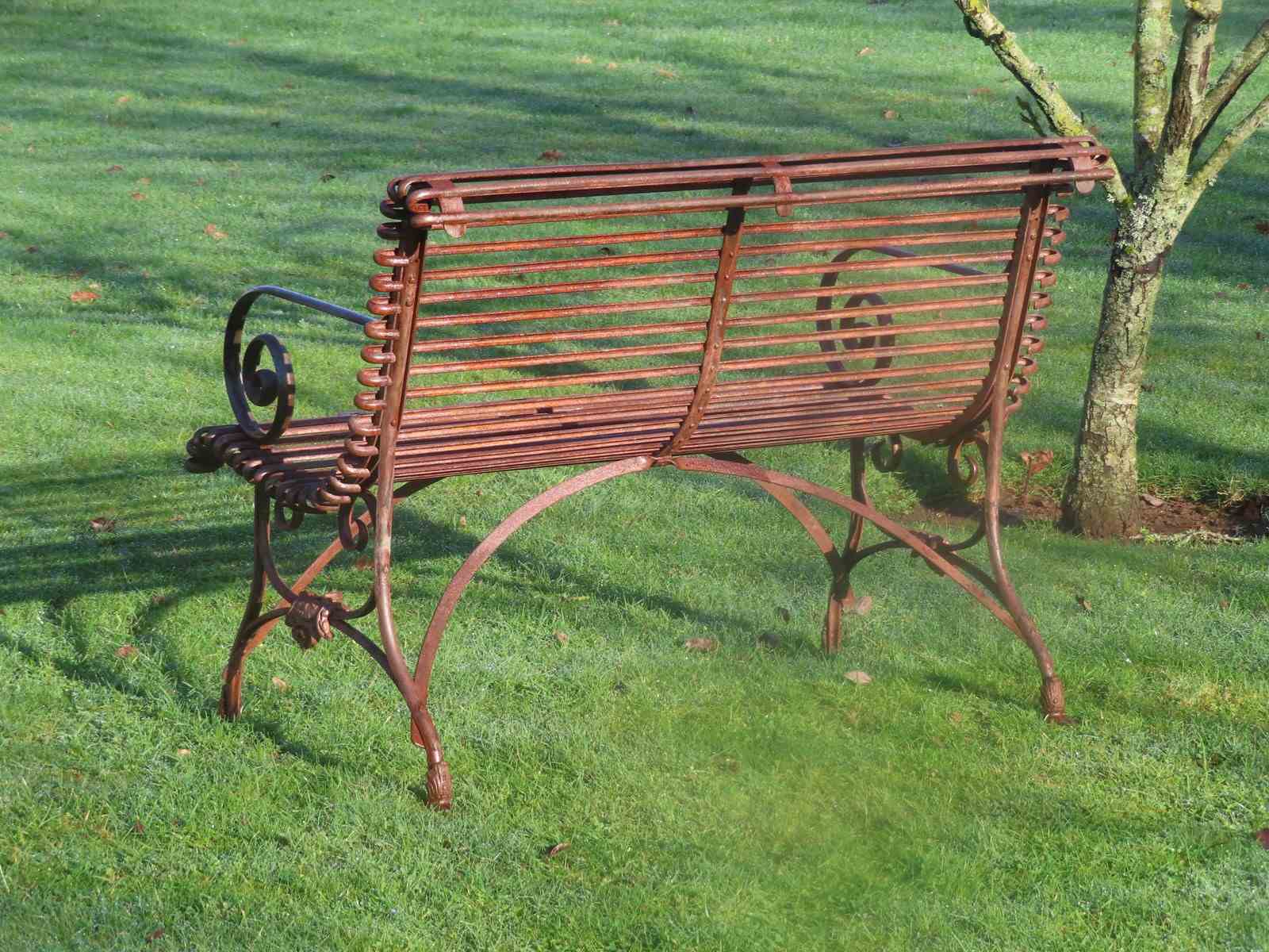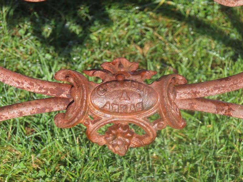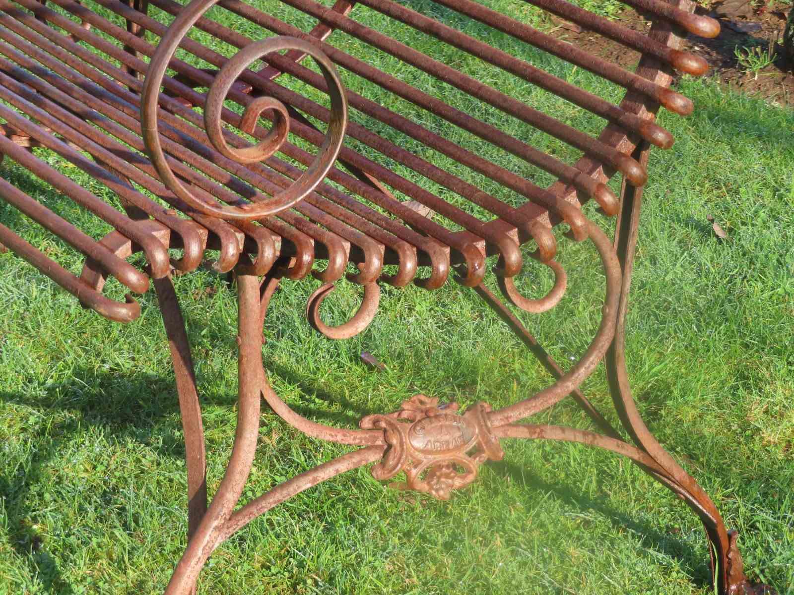 Late 19thC, two-seater Arras garden bench. Wrought iron garden furniture. Original garden antique with distinctive lion's paw feet and Grassin Arras maker's plaque.