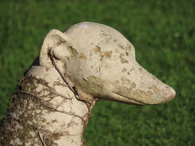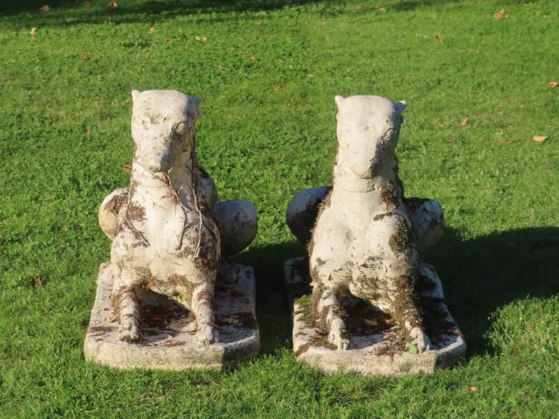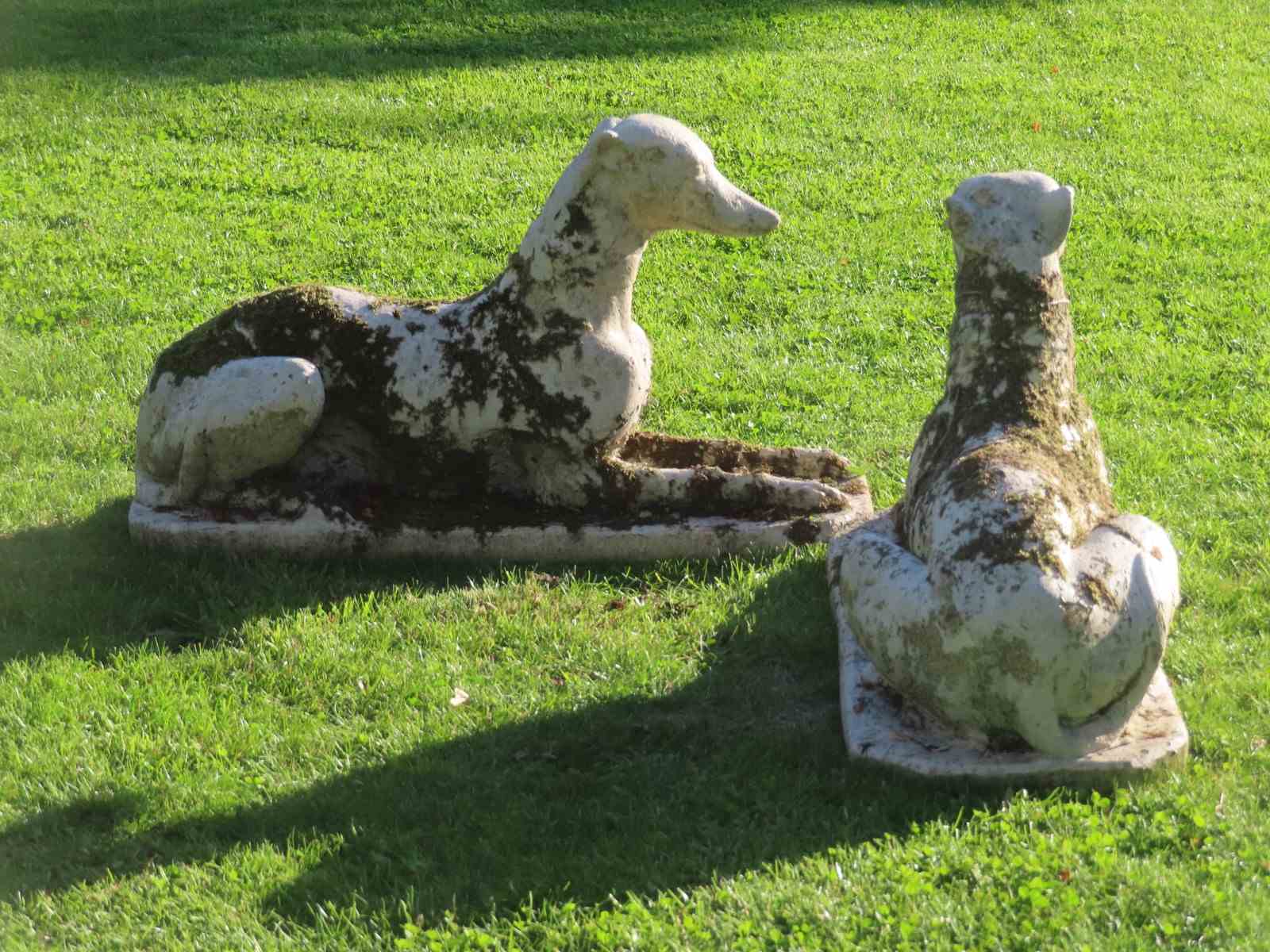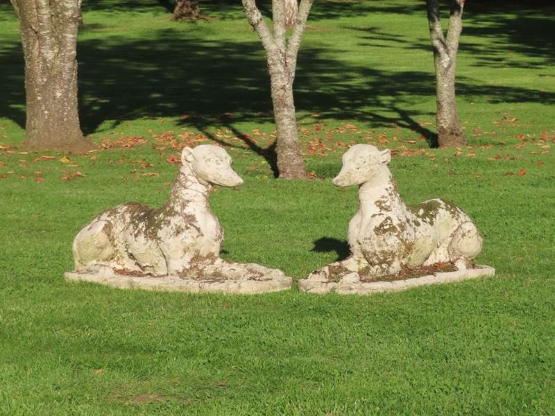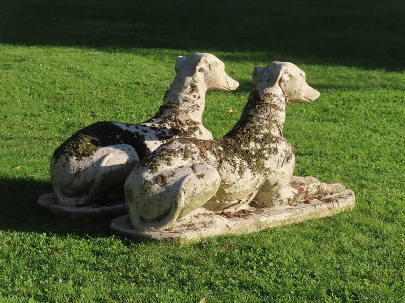 Pair of recumbent stone whippets. Early 20th century composition stone.