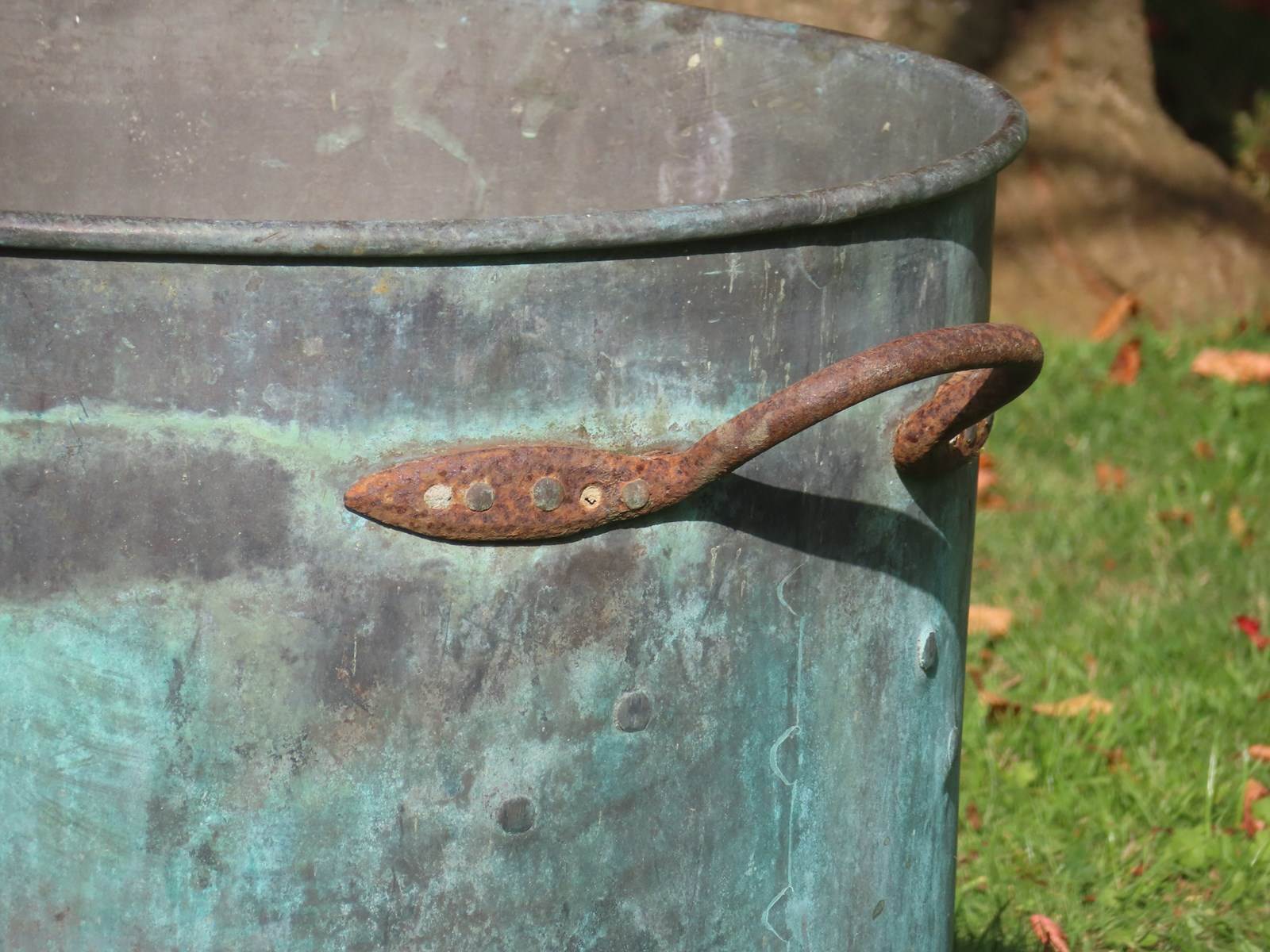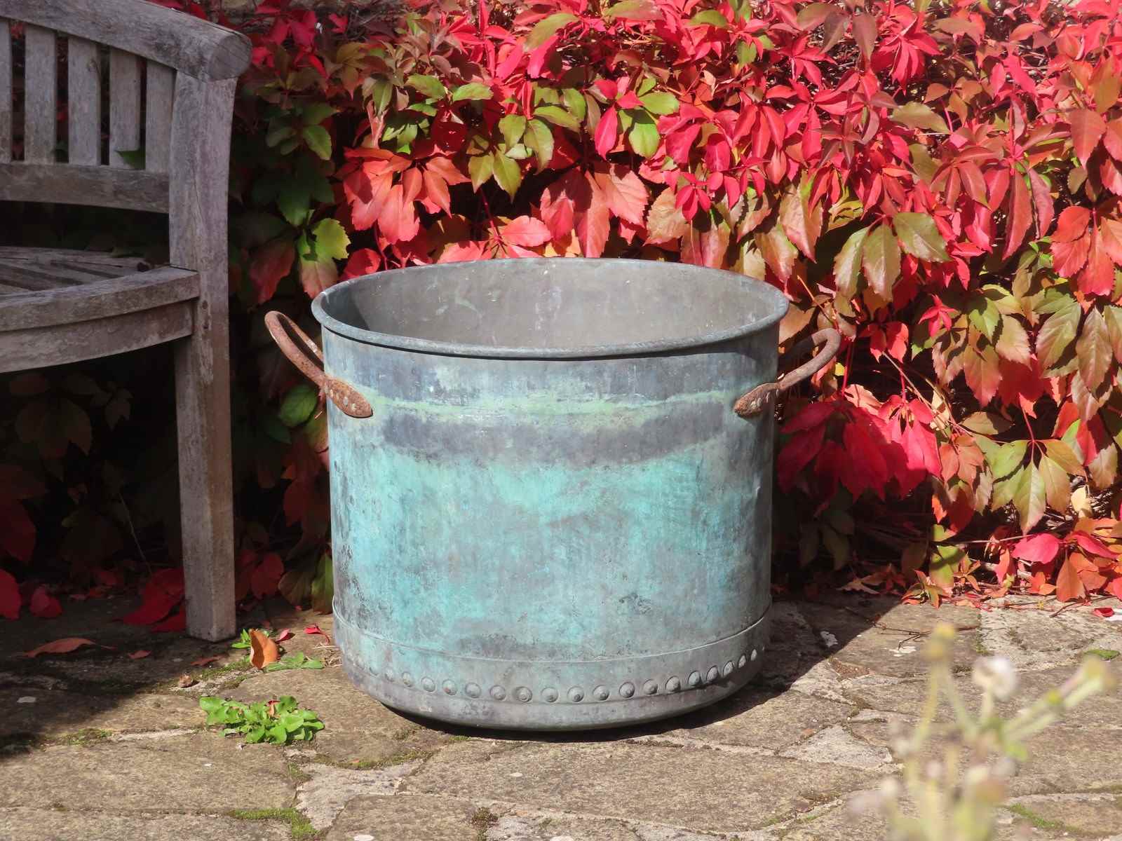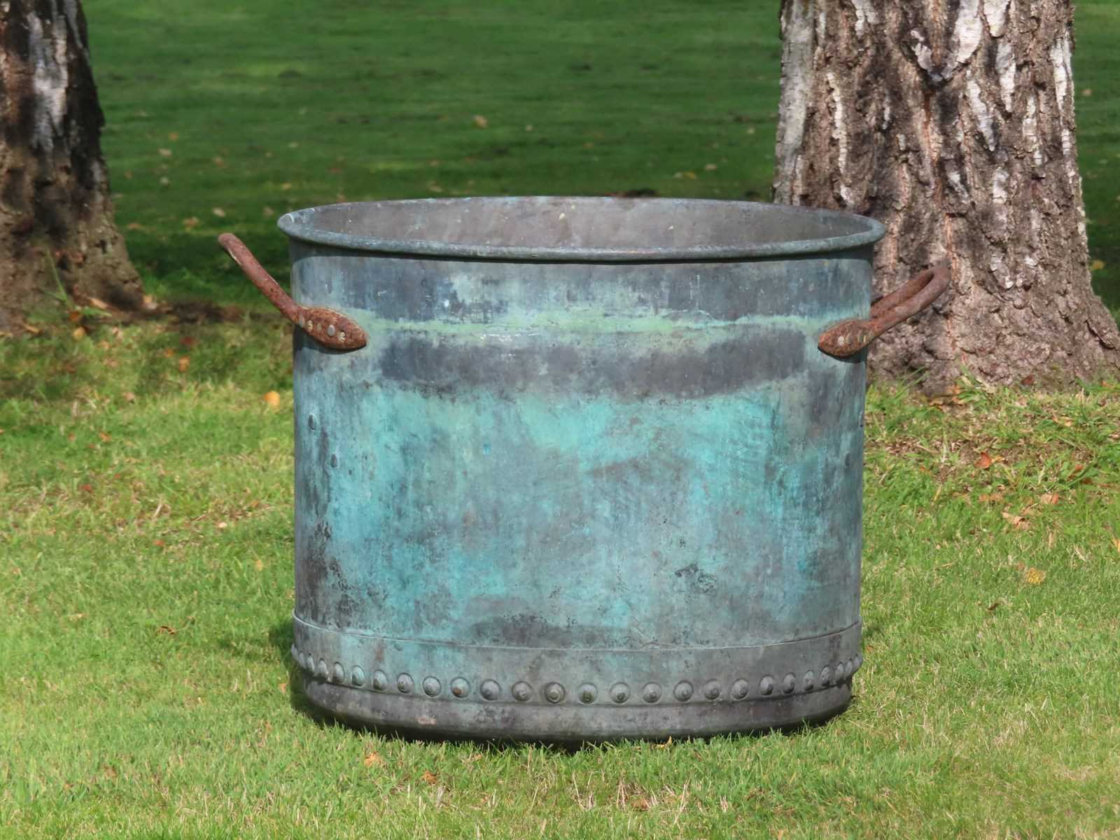19th century riveted copper with twin handles. Holds water, so can be used as a water feature or drilled for planting.