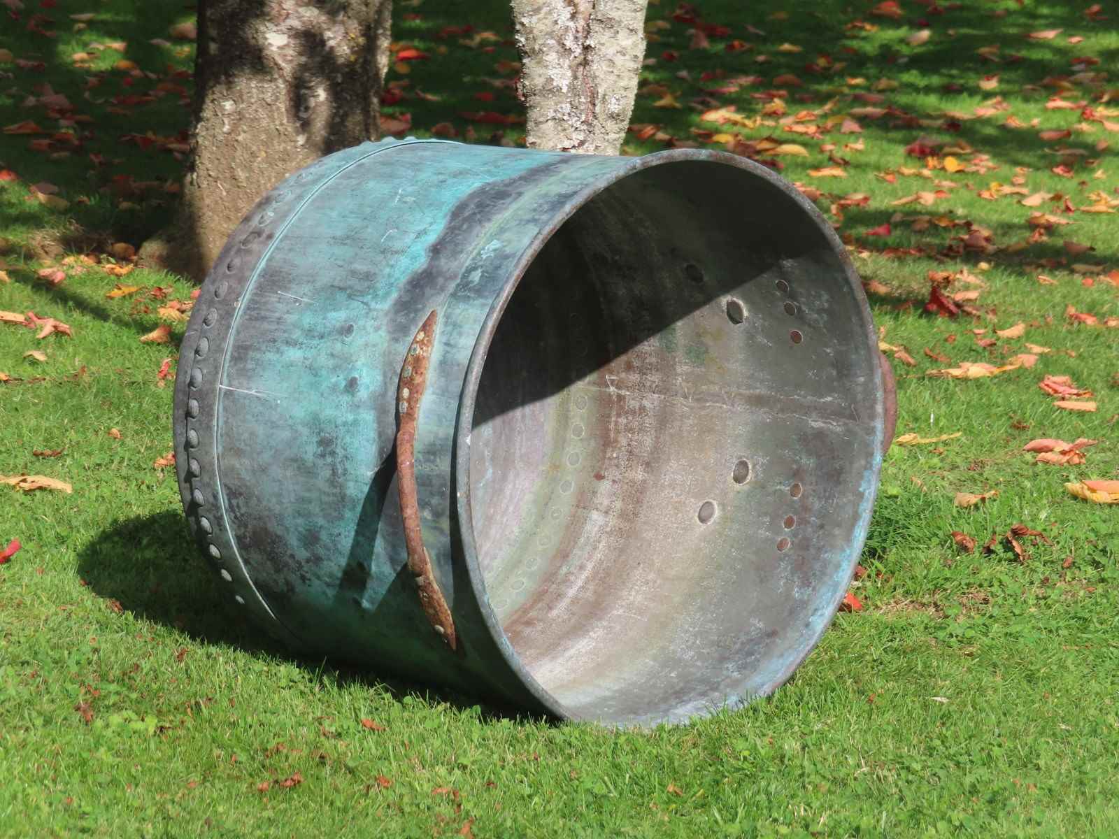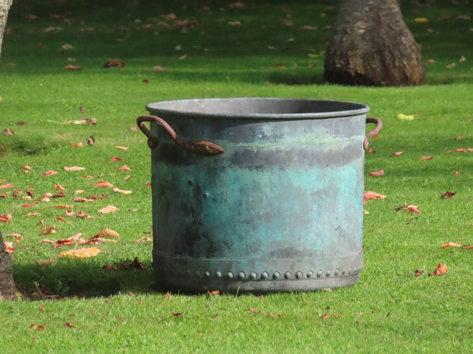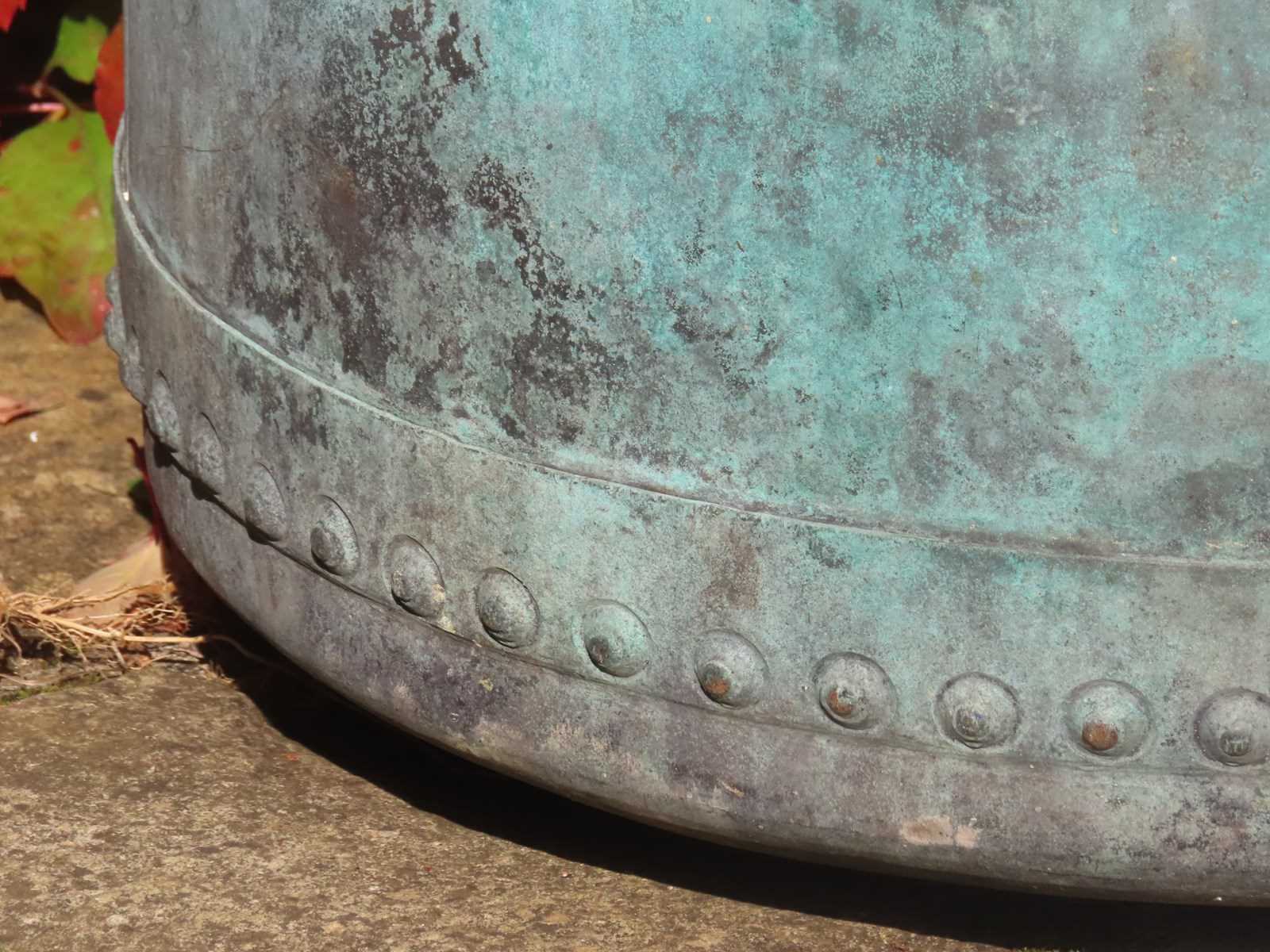 19th century riveted copper with twin handles. Holds water, so can be used as a water feature or drilled for planting.