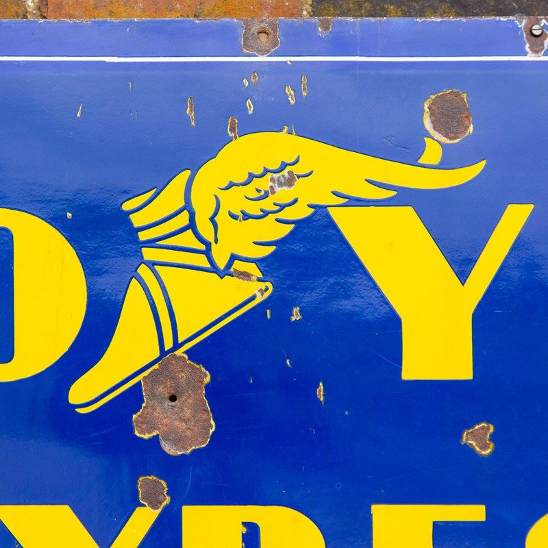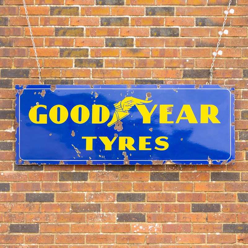 From advertising blimps in the 1920s, through to heavy motorsport sponsorship the Goodyear logo has become iconic. This enamel sign was produced for the English market (tyres, not tires) and looks to have been made by the Imperial Enamel Co of Birmingham. It uses the variant of the logo used by the company from 1942-1968 and I suspect it to date to the '40s.