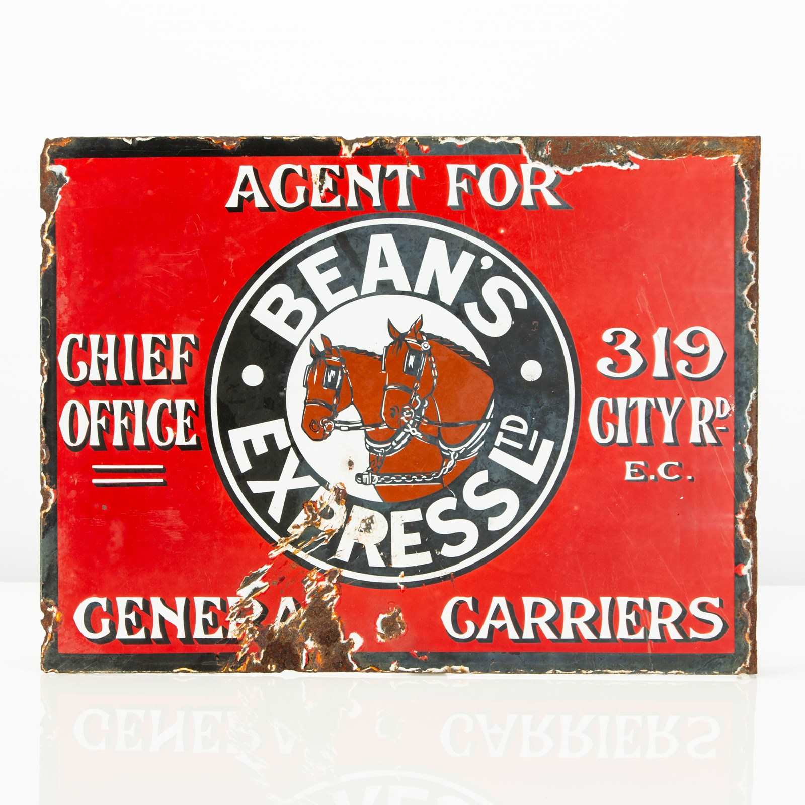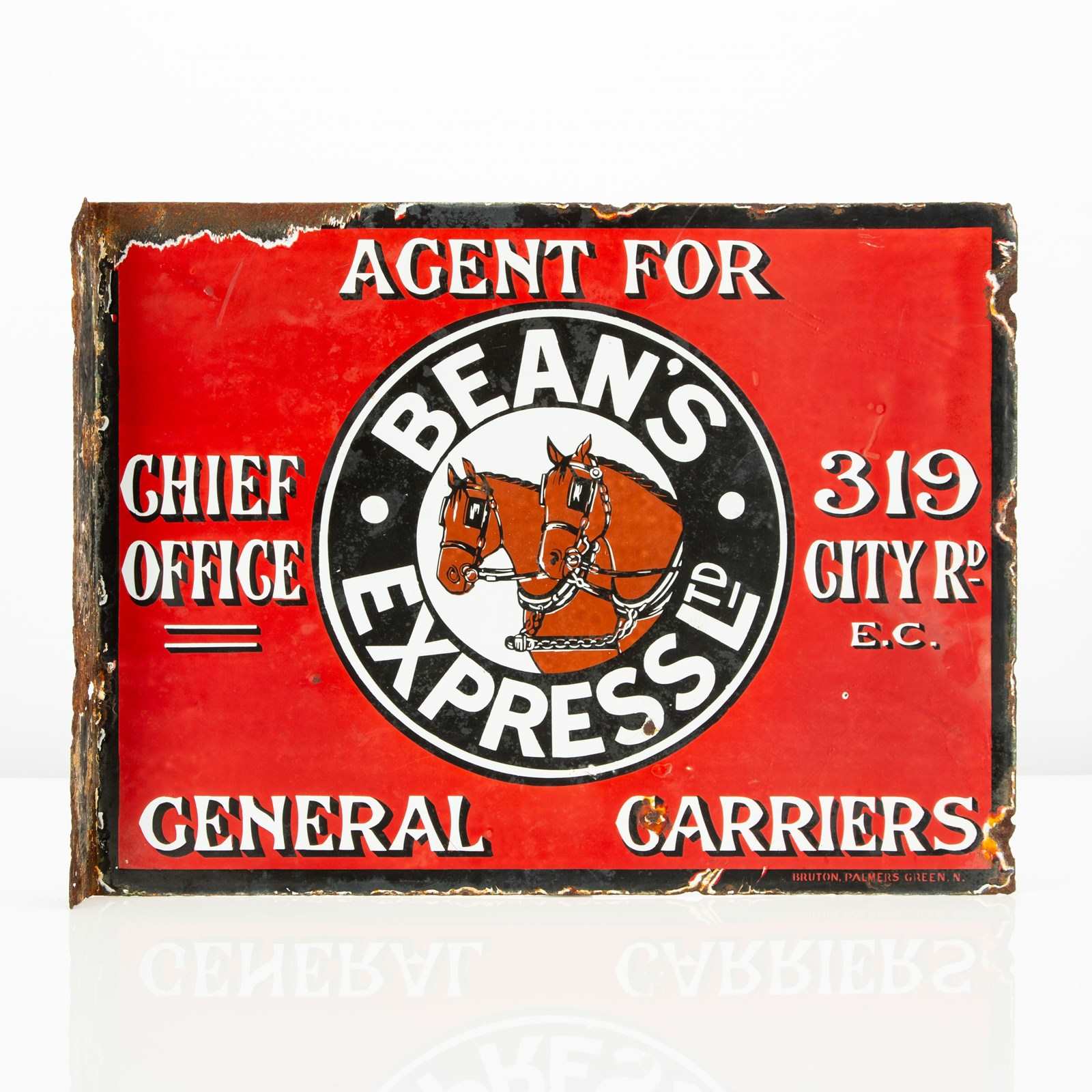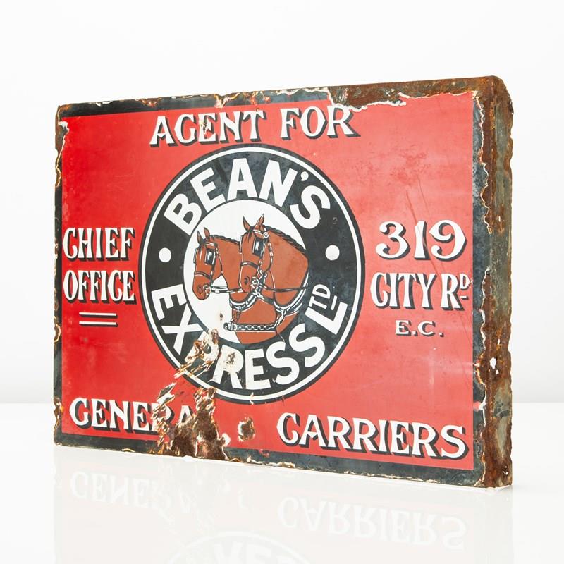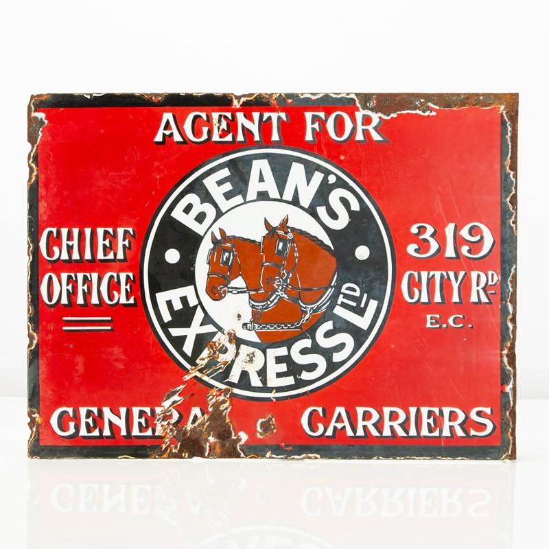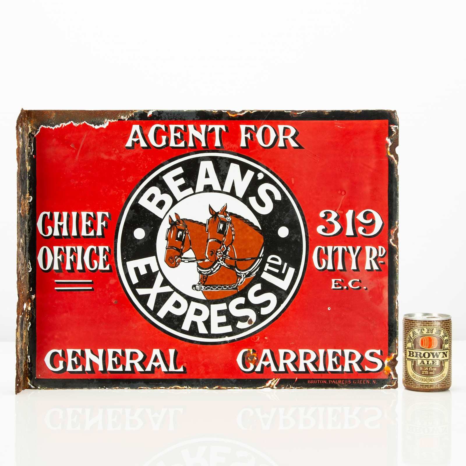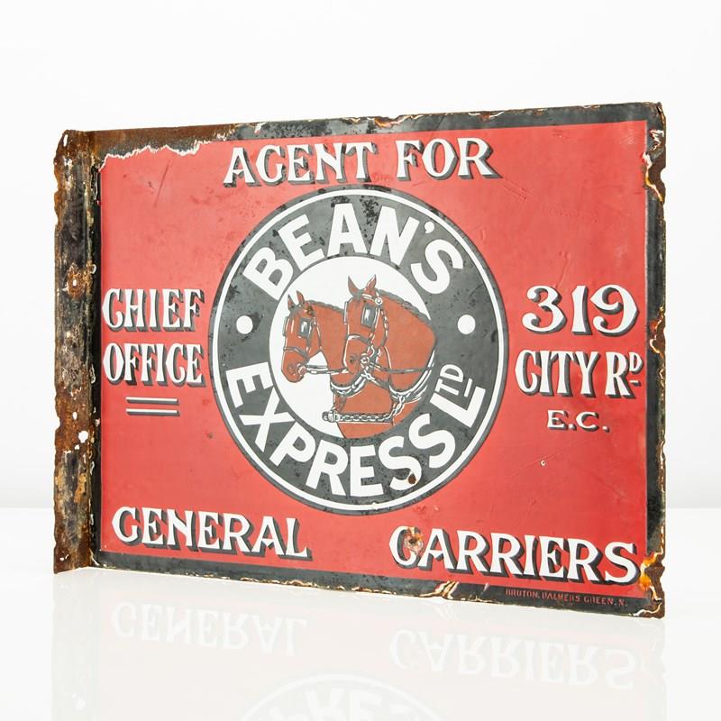 Here we have a real rarity, quite possibly a lone-survivor; a double-sided enamel flange sign for an agent of "Bean's Express Ltd - General Carriers - Chief Office 319 City Road, E.C." (Islington, London, England).