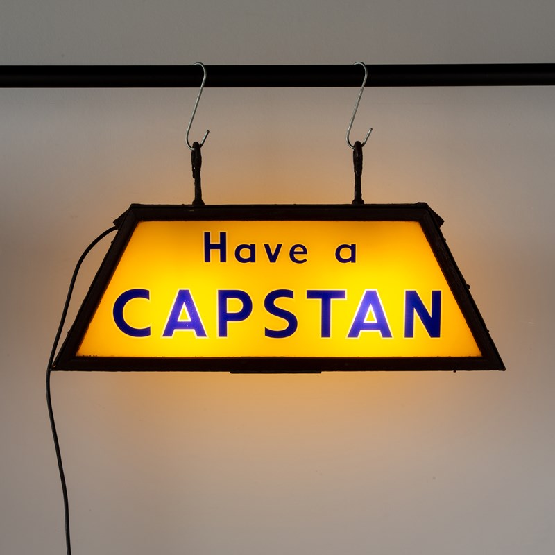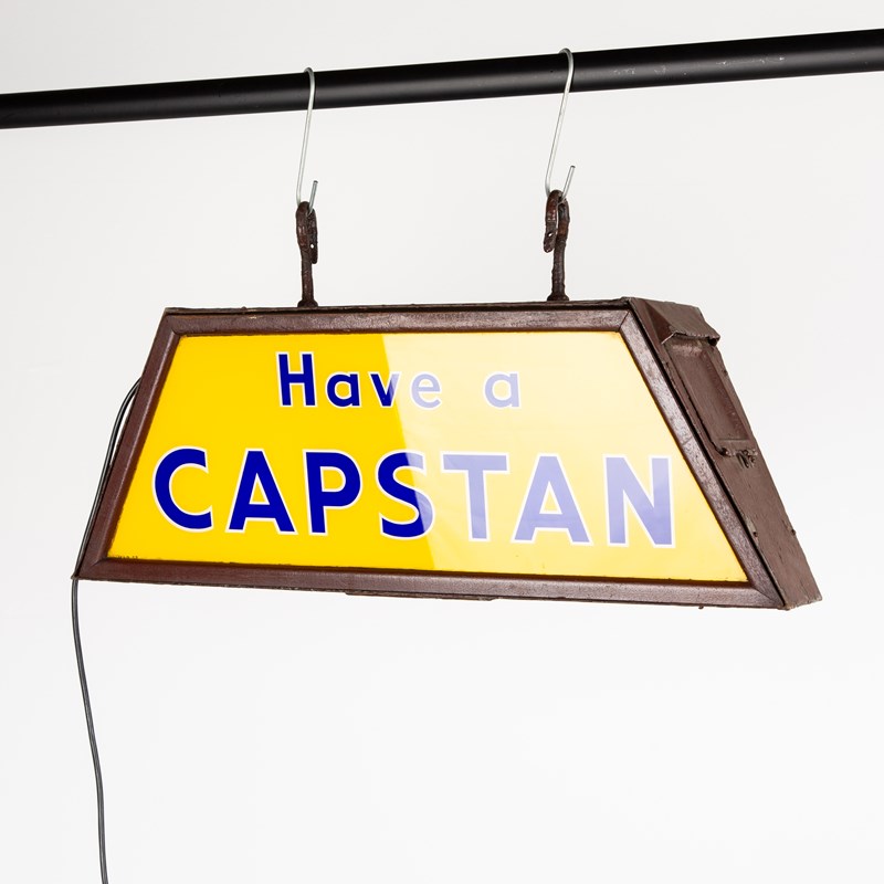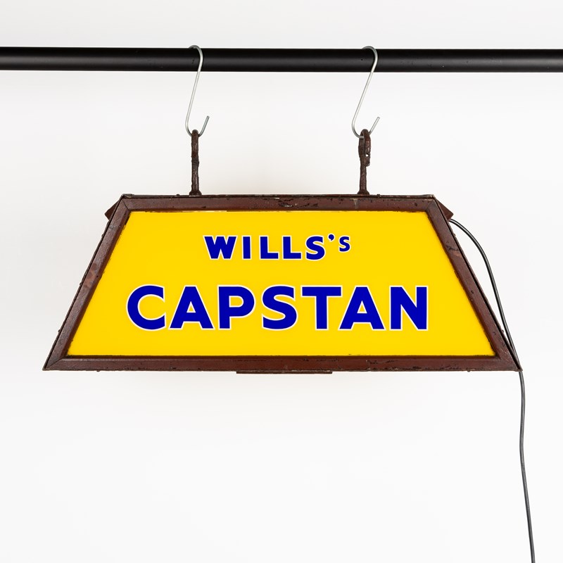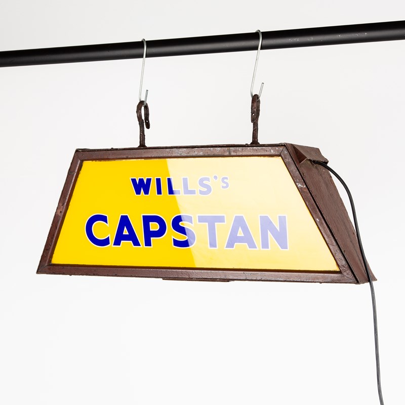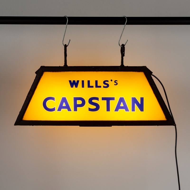 This Wills's Capstan (cigarettes), double-sided illuminating glass hanging sign is a wonderfully original, rare survivor and a great example of mid-century advertising.
