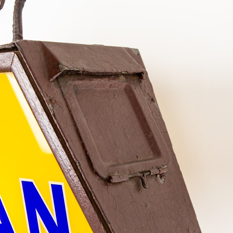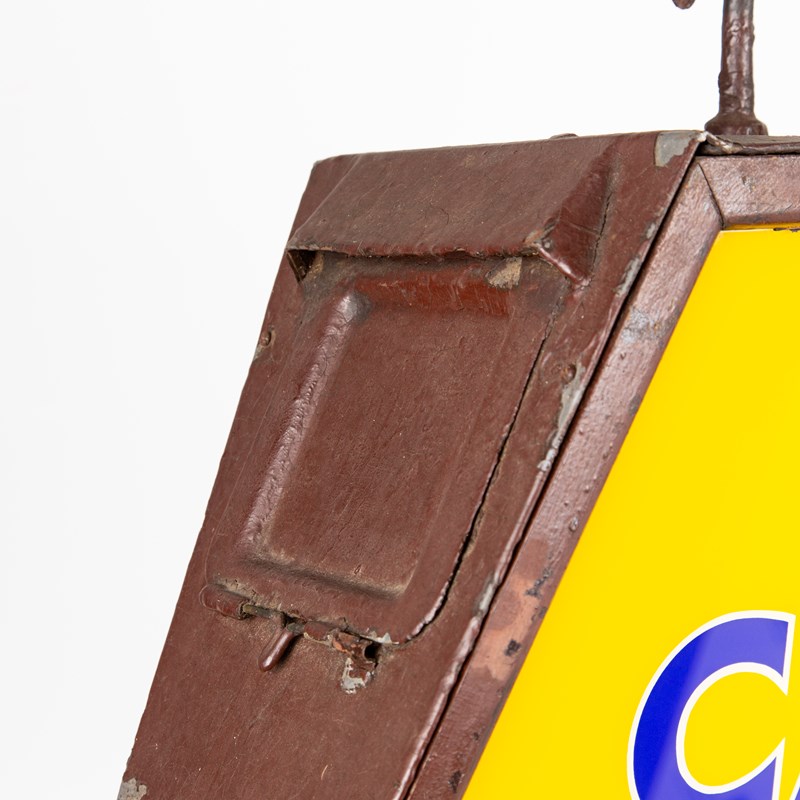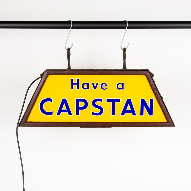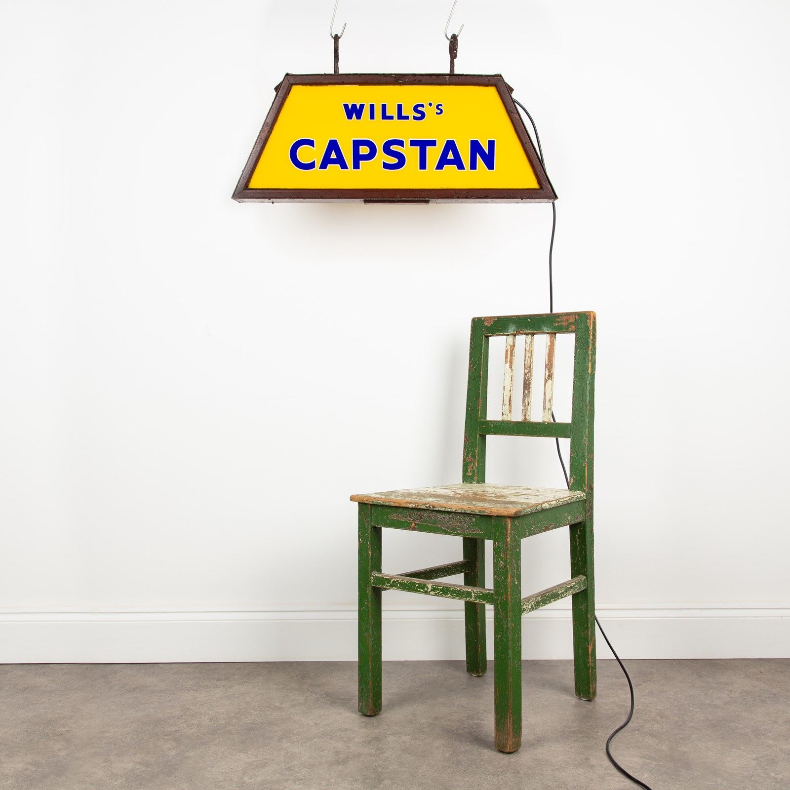 This Wills's Capstan (cigarettes), double-sided illuminating glass hanging sign is a wonderfully original, rare survivor and a great example of mid-century advertising.