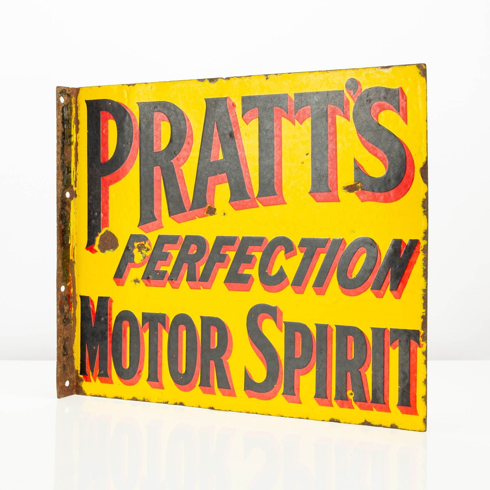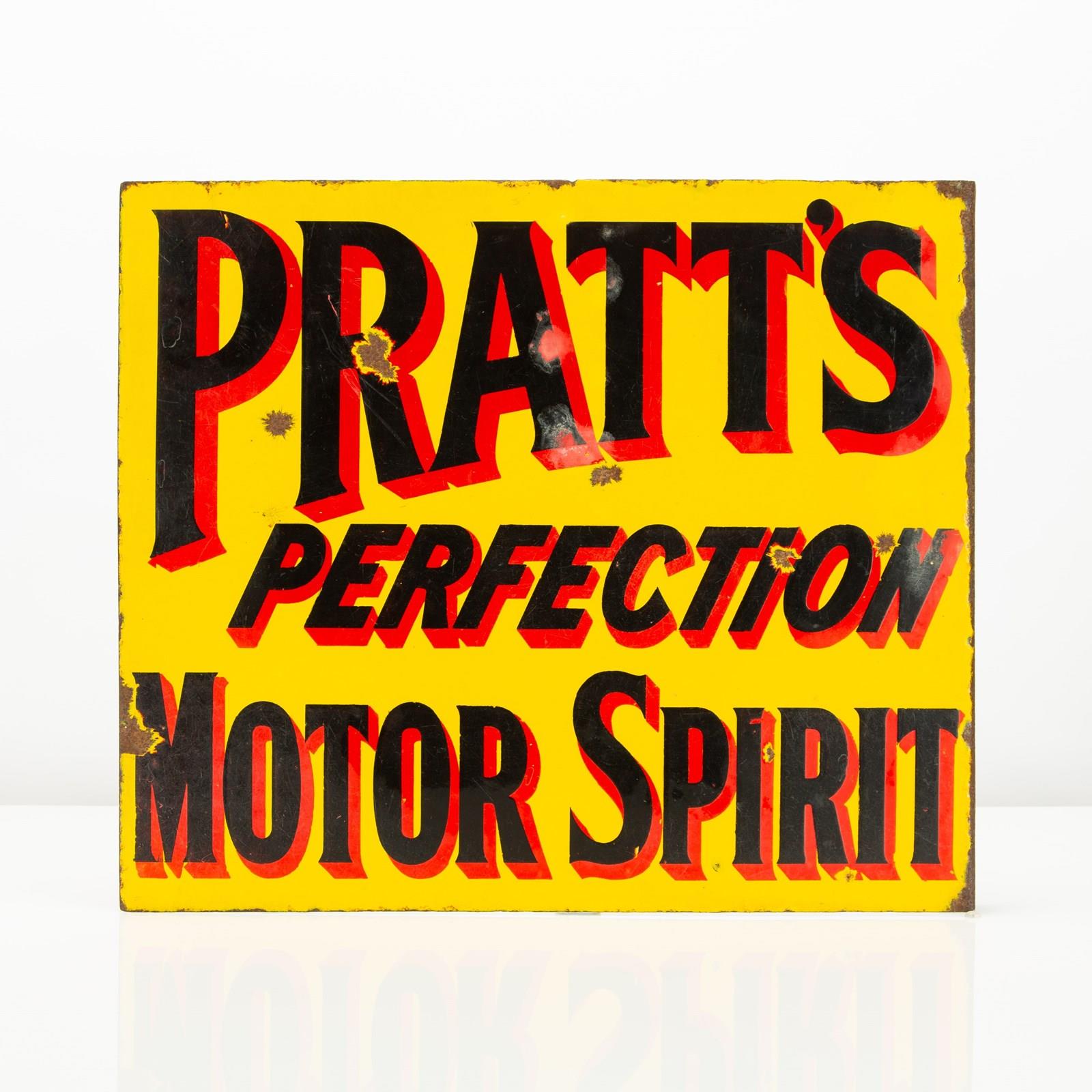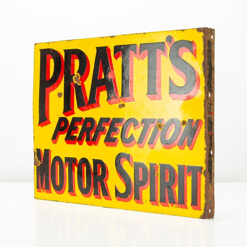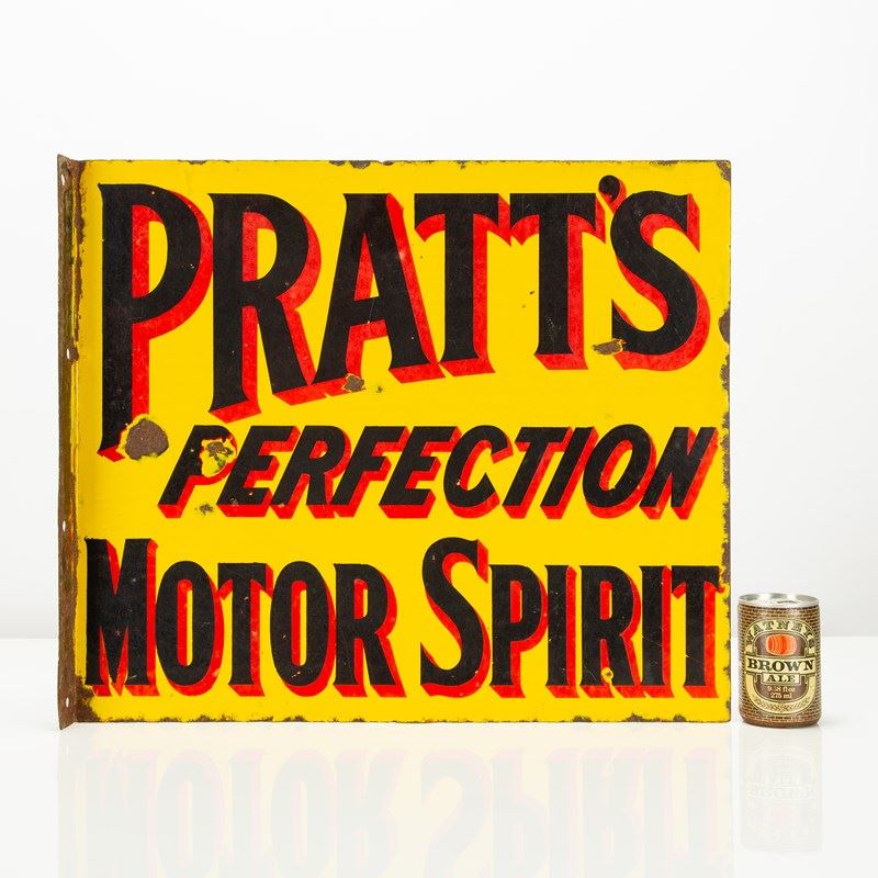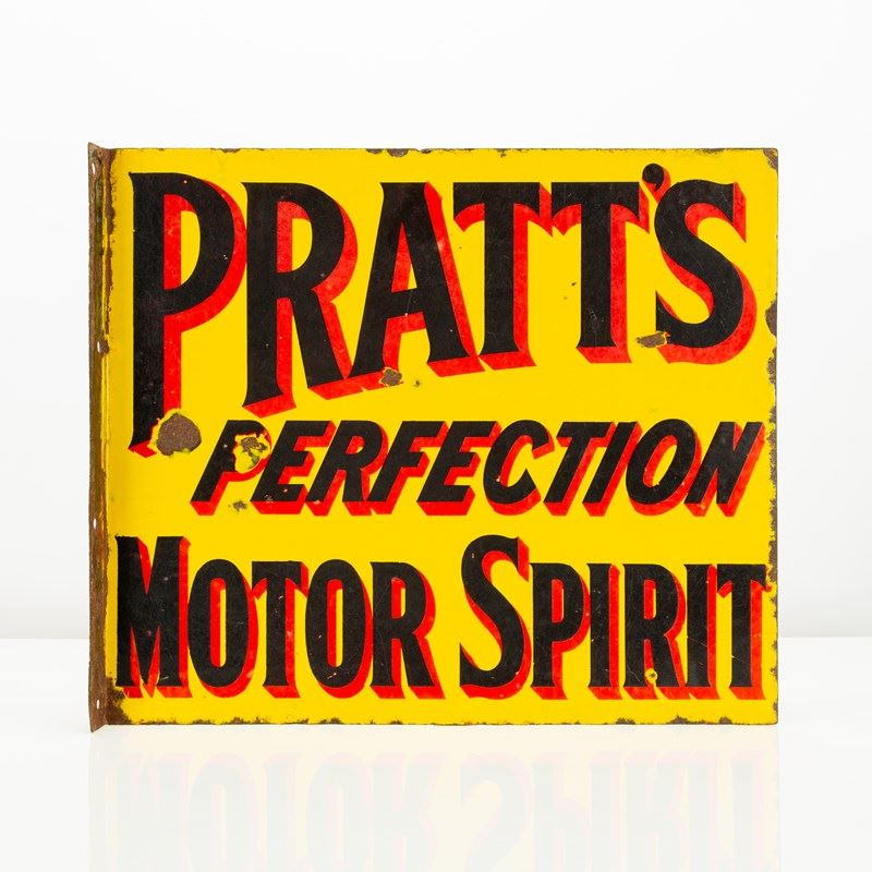 A good example of early, English automobilia - this Pratt's Perfection Motor Spirit double-sided enamel flange sign is a real rarity. A petrol, or as it was more pleasingly termed at the time 'motor spirit', company that was formed in the late 19th century - Pratt's were amongst the founding father's of motoring.