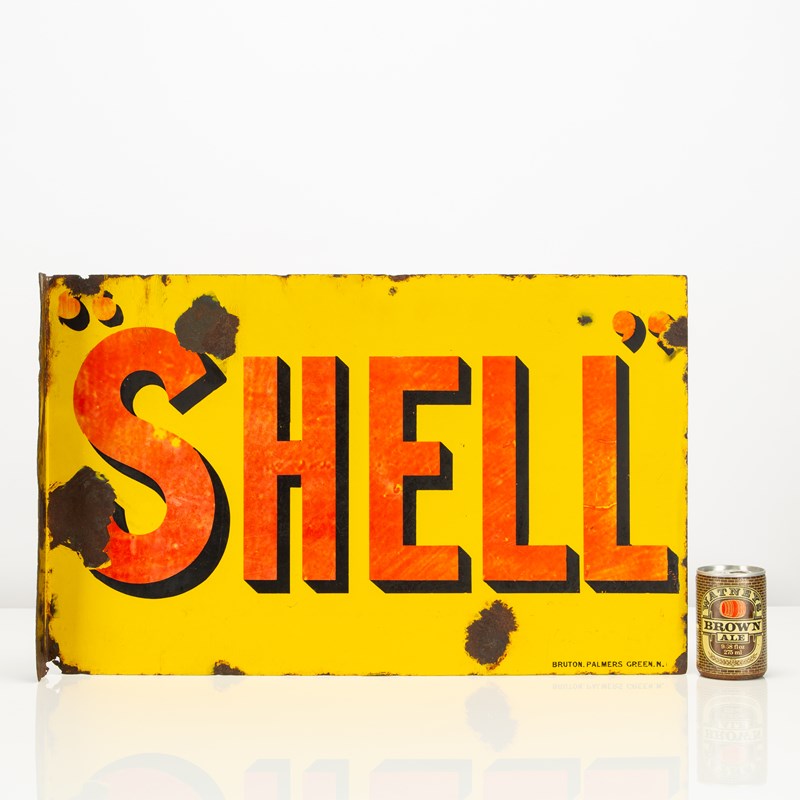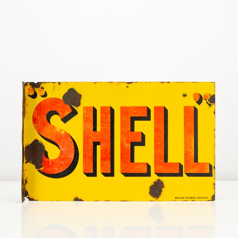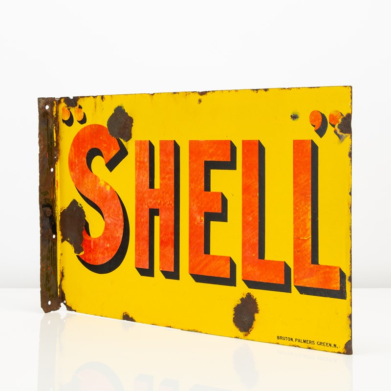 A lovely, early piece of automobilia - this "SHELL" double-sided enamel flange sign dates to the 1920s/'30s and was produced by the London enamelers; Bruton of Palmers Green.