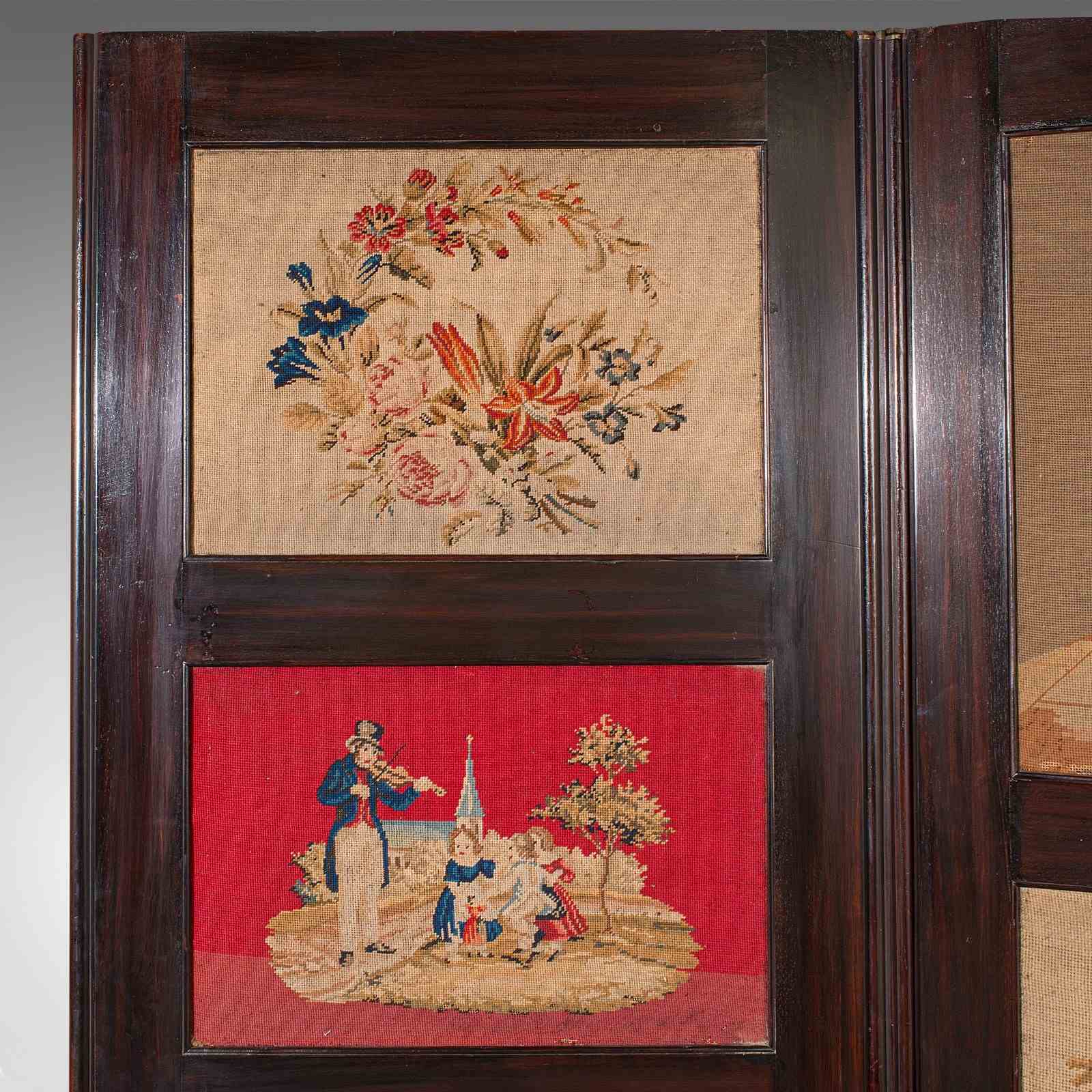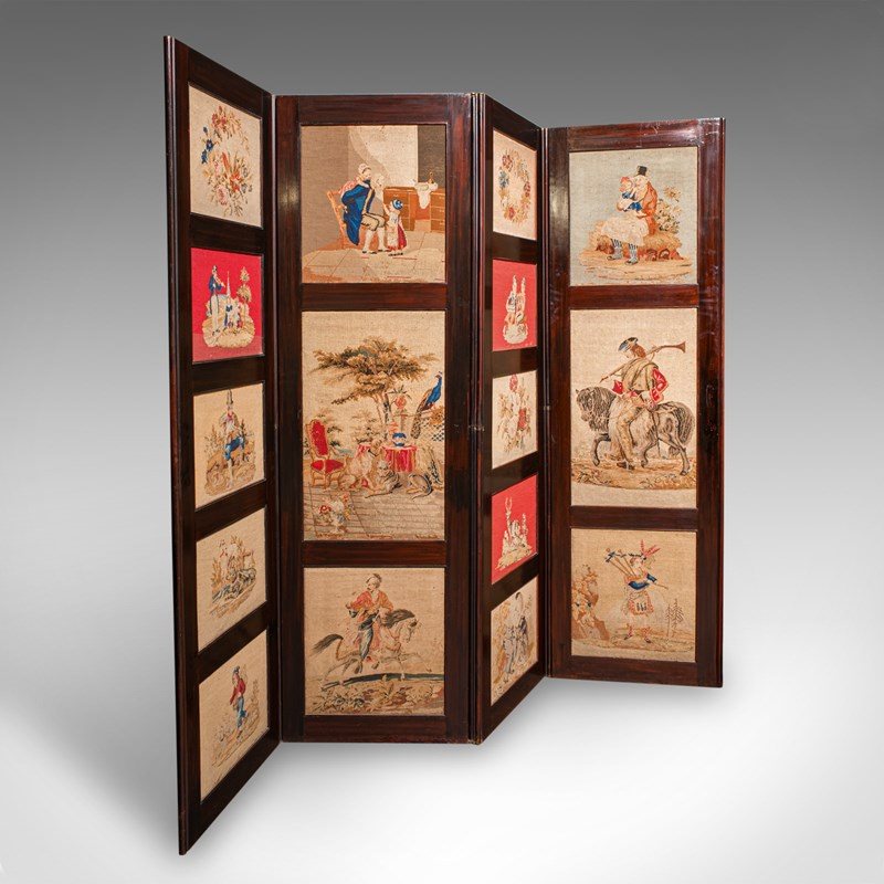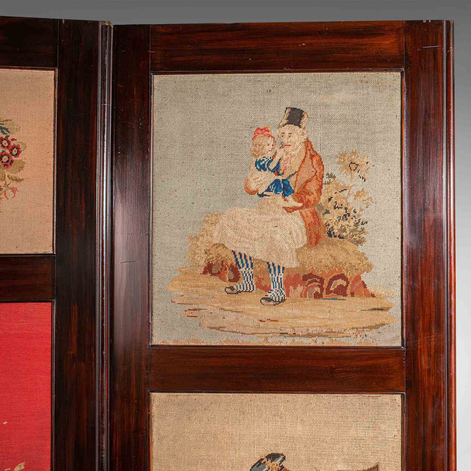 This is an antique 4-panel room divider. An English, rosewood and needlepoint folding privacy screen, dating to the Regency period, circa 1820. A fine and well detailed example, this screen presents charming embroidered panels and showcases the refinement and artistry of late Georgian interior design.