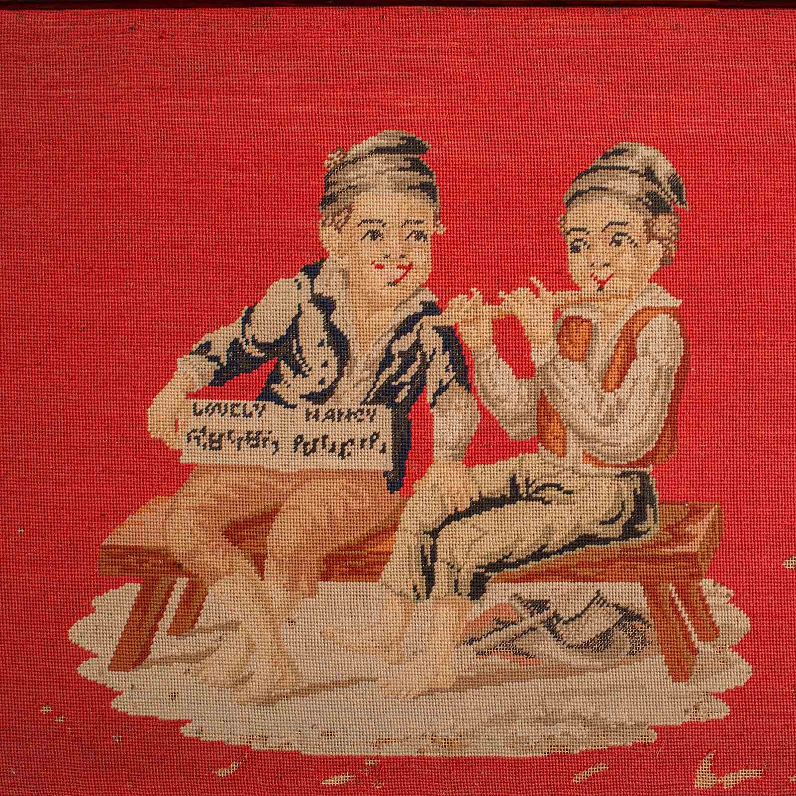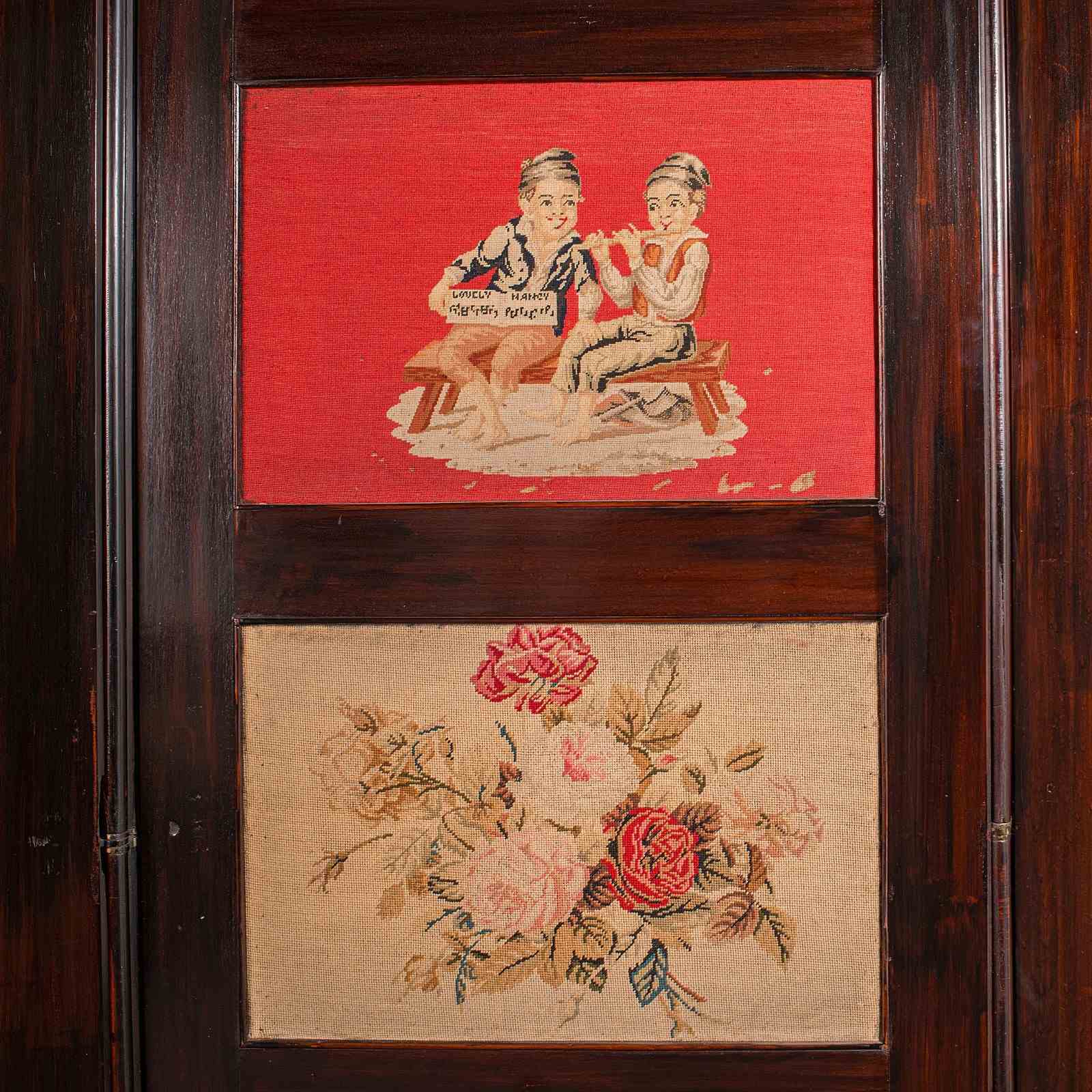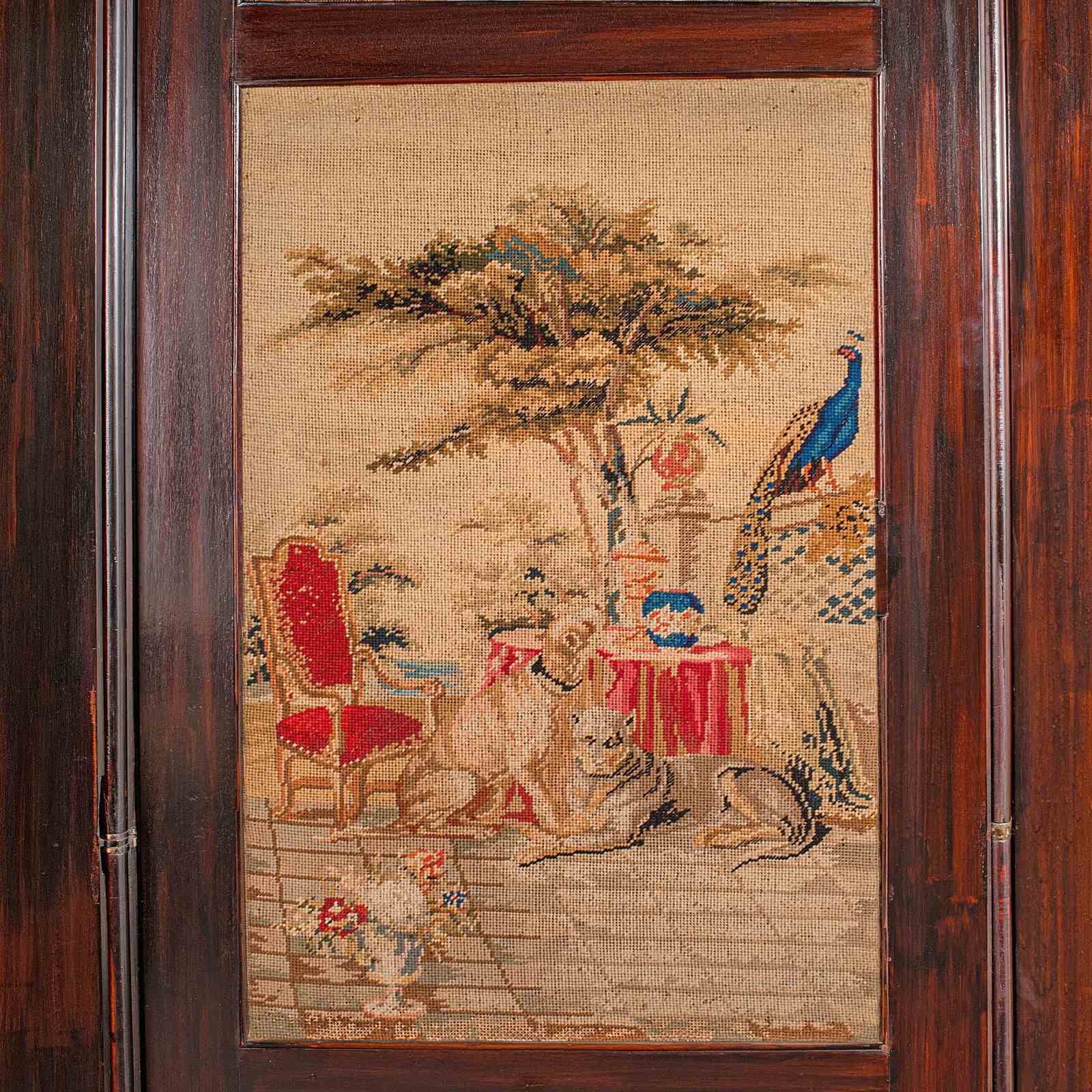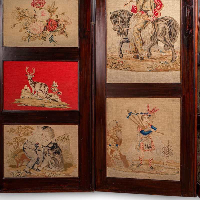 Each section is adorned with finely worked needlepoint embroidery, presenting figural, floral, and animal scenes