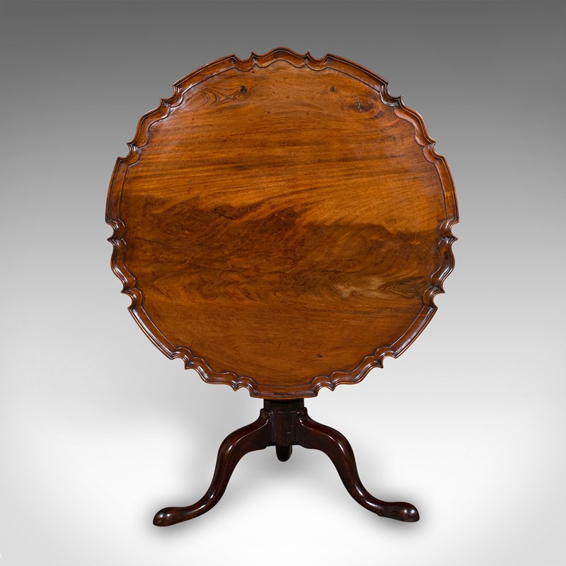 This is an antique 4 seat occasional table. An English, walnut and mahogany tilt-top pie crust serving table, dating to the Georgian period, circa 1800. A superbly crafted and generously proportioned example of fine Georgian furniture, displaying elegance and versatility.