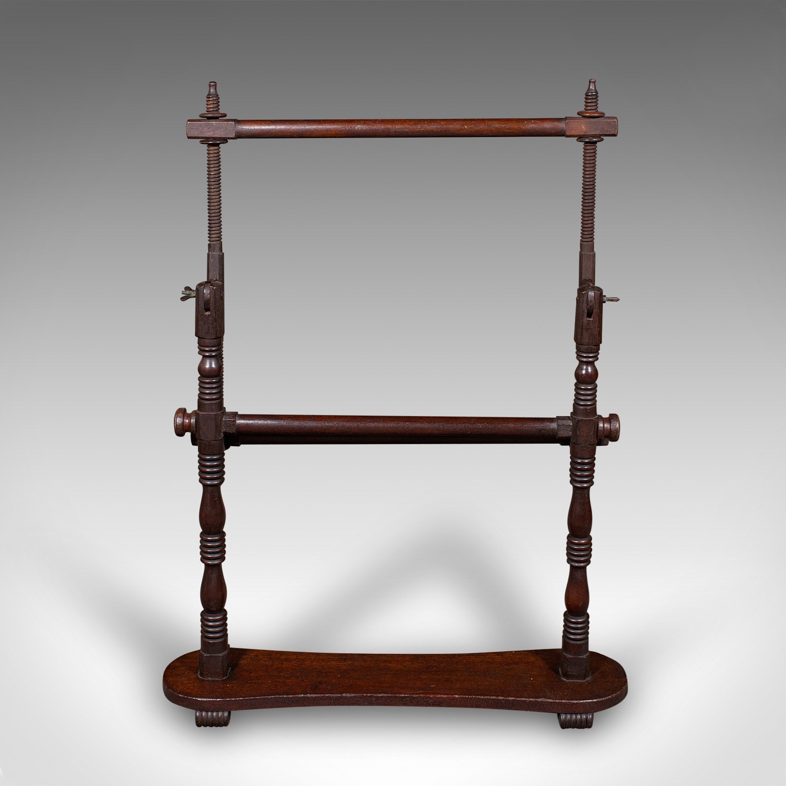 This is an antique adjustable tapestry frame. An English, mahogany country house needlepoint stretcher, dating to the late Victorian period, circa 1880.