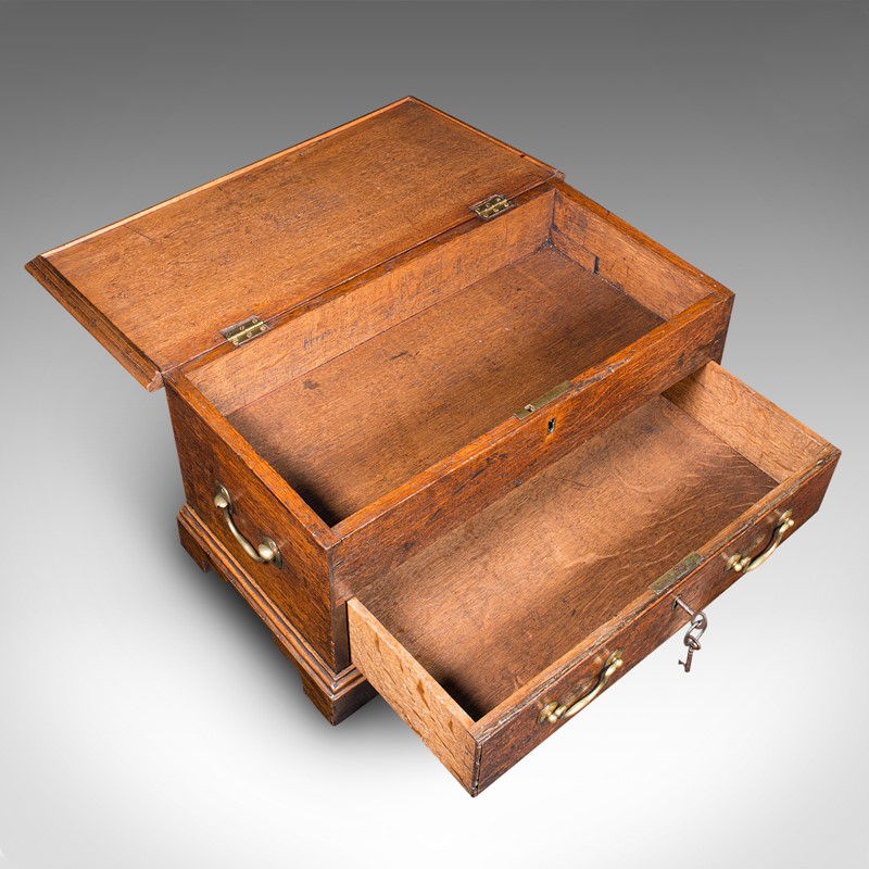 This is an antique apprentice mule chest. An English, oak miniature desktop coffer, dating to the late Georgian period, circa 1800.