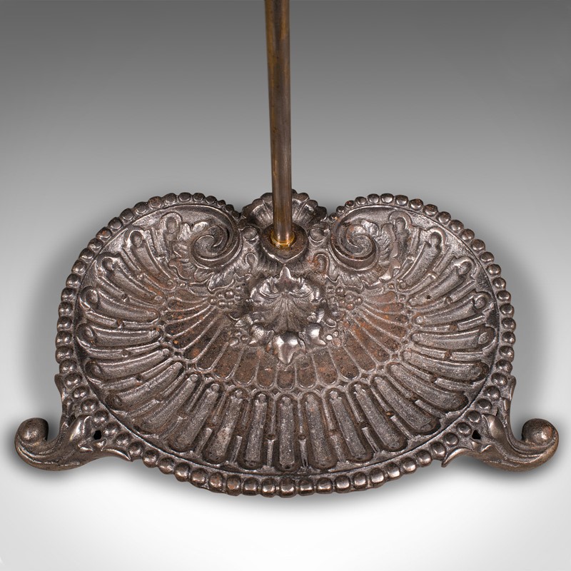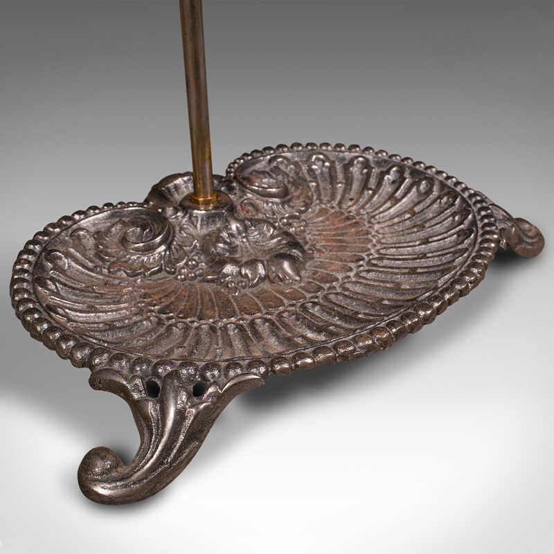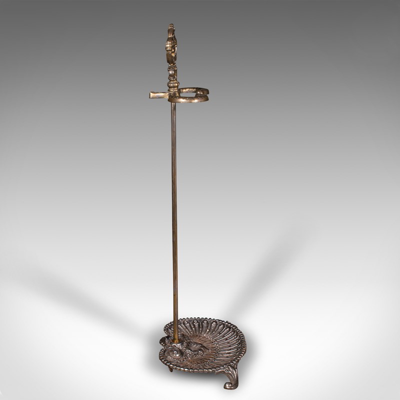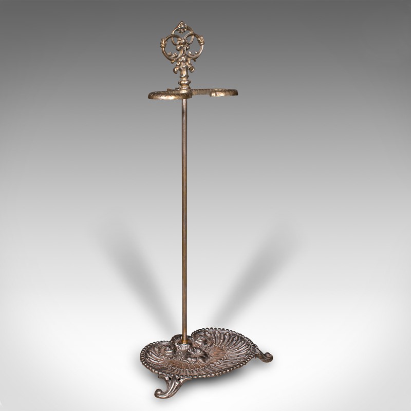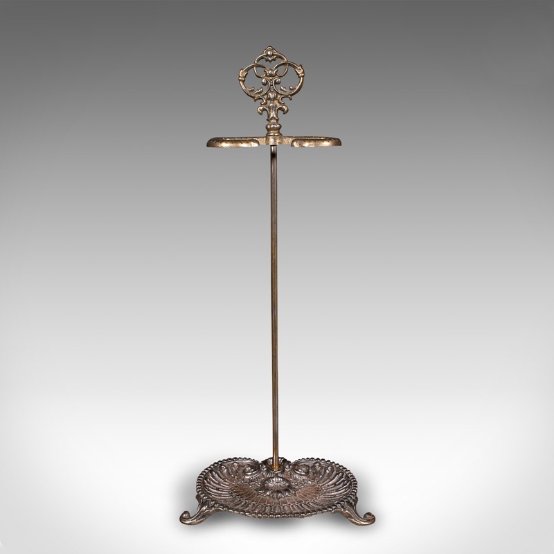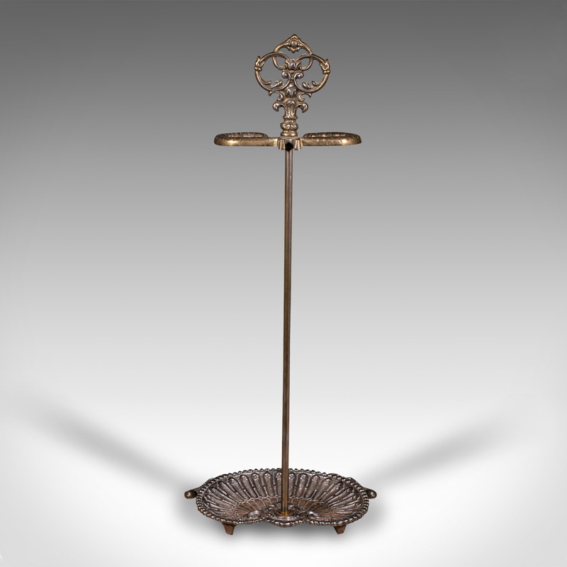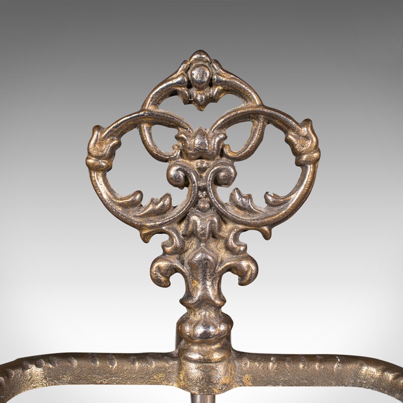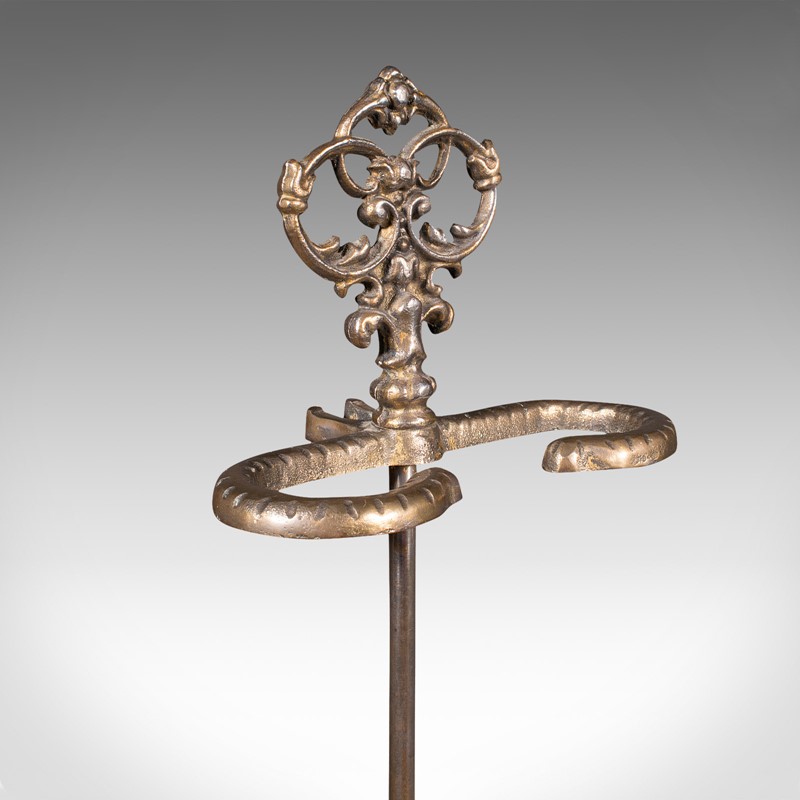 Ornate pierced finial adorns the support, the demi-lune stick loop accentuated with a dashed finish