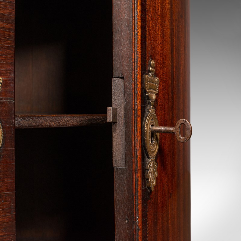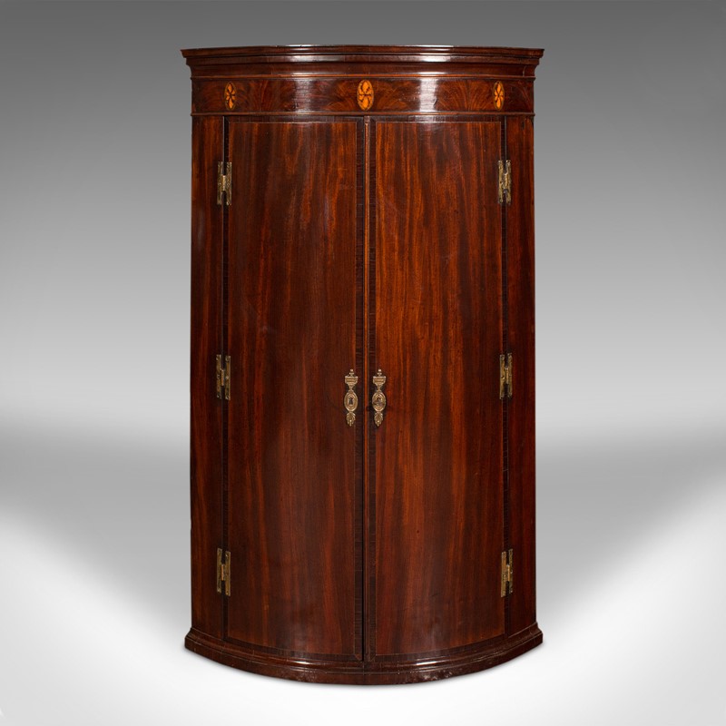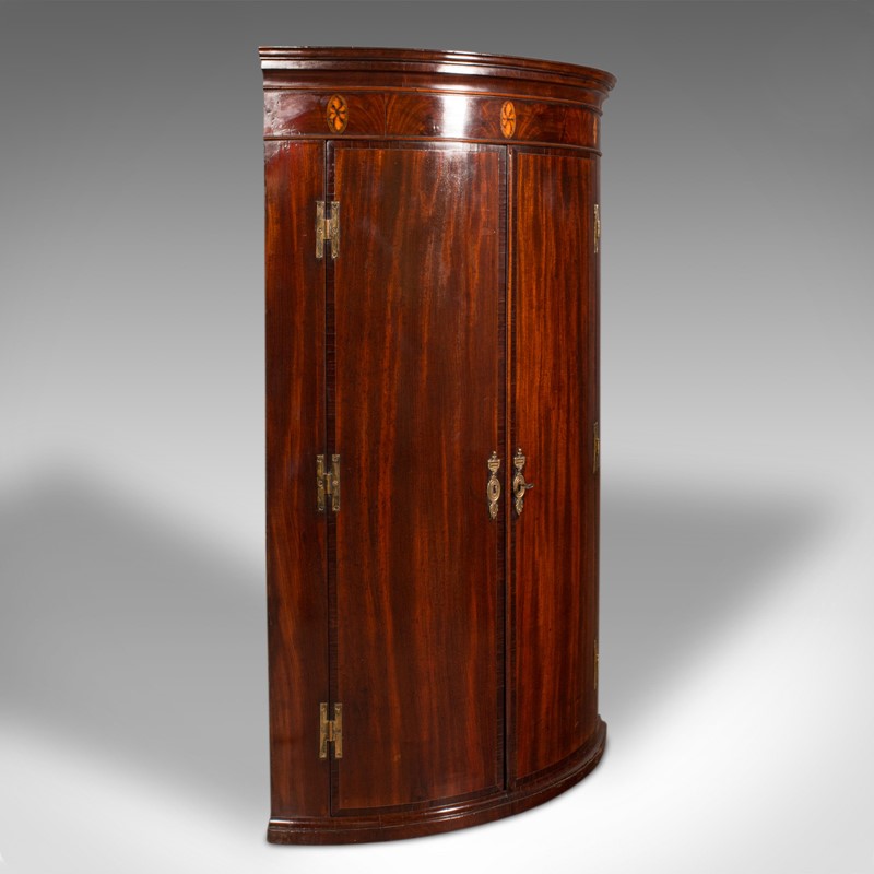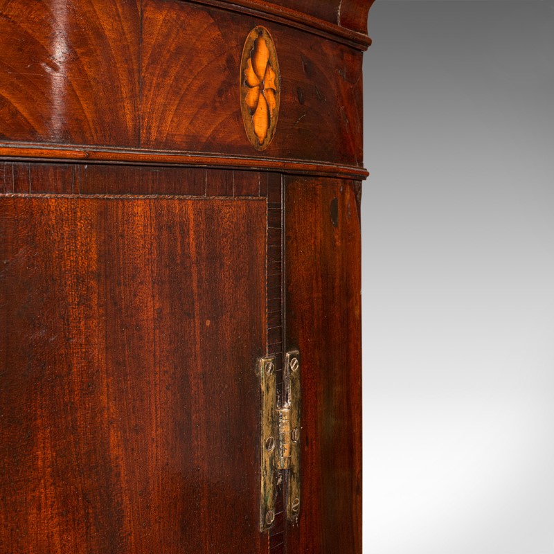 This is an antique bow front corner cabinet. An English, flame mahogany and oak wall cupboard, dating to the Georgian period, circa 1780.