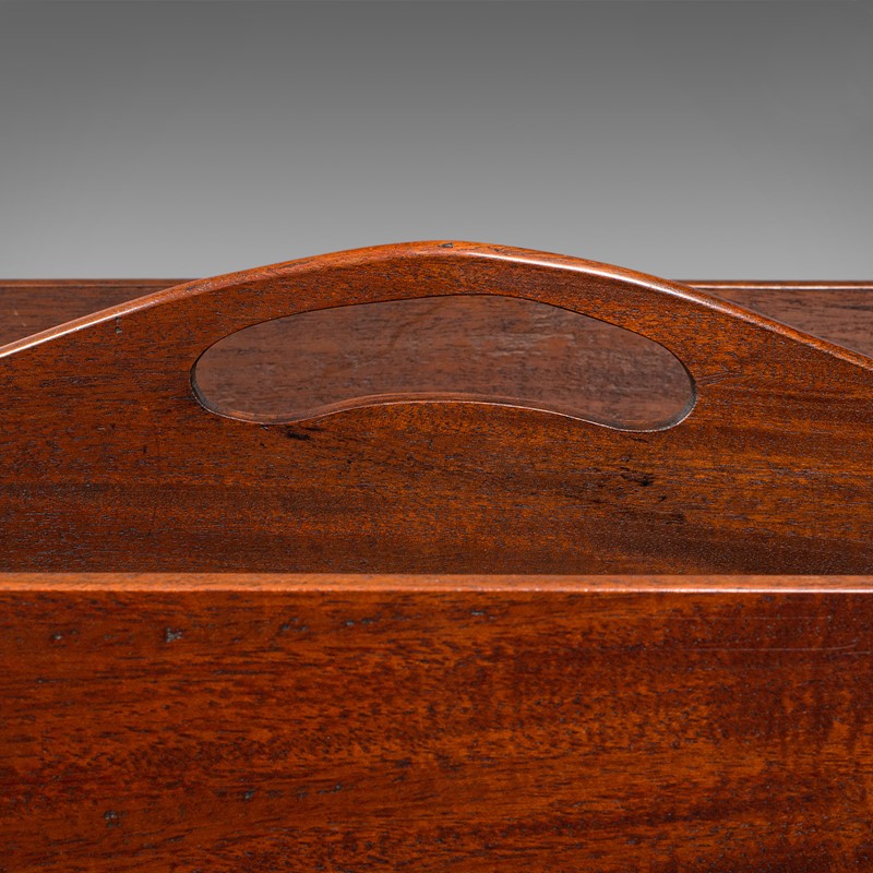 This is an antique butler's silver carry tray. An English, mahogany newspaper rack or work box, dating to the early Victorian period, circa 1850.