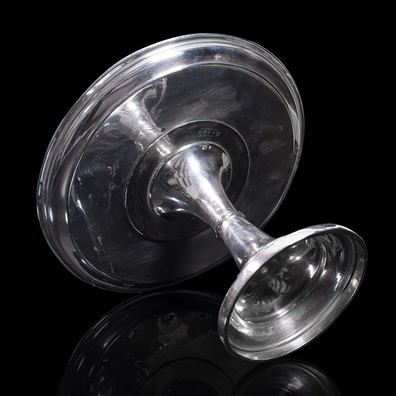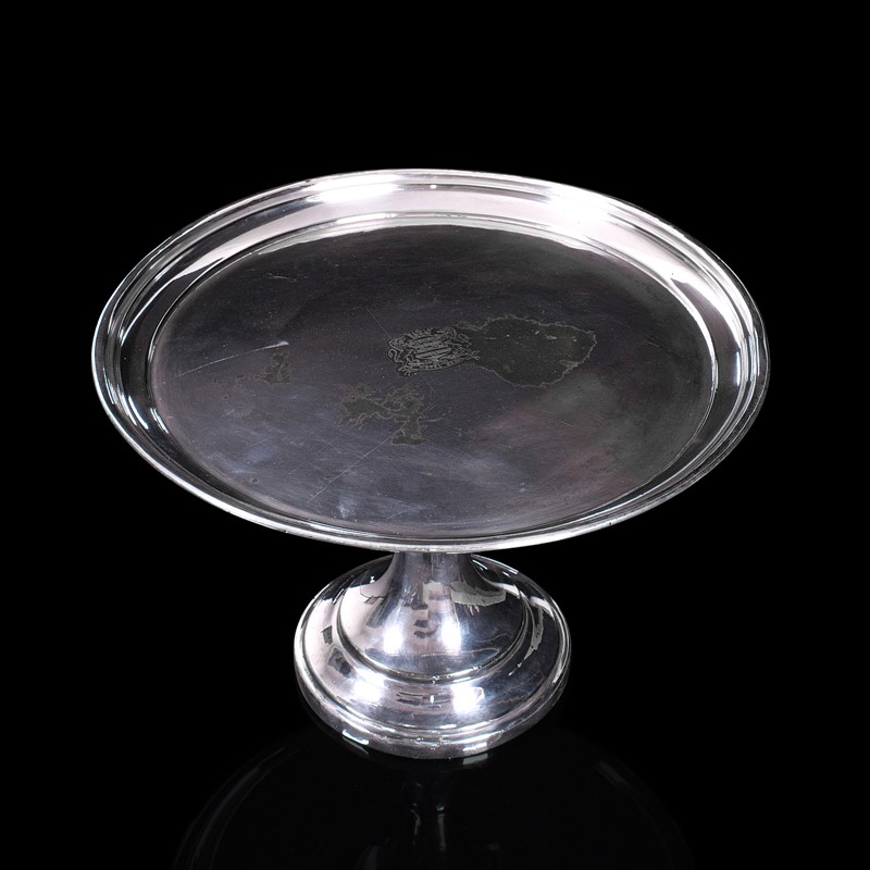 This is an antique cake stand. An English, silver plated serving dish with engraved Cecil Hotel, London emblem, dating to the late Victorian period, circa 1900.