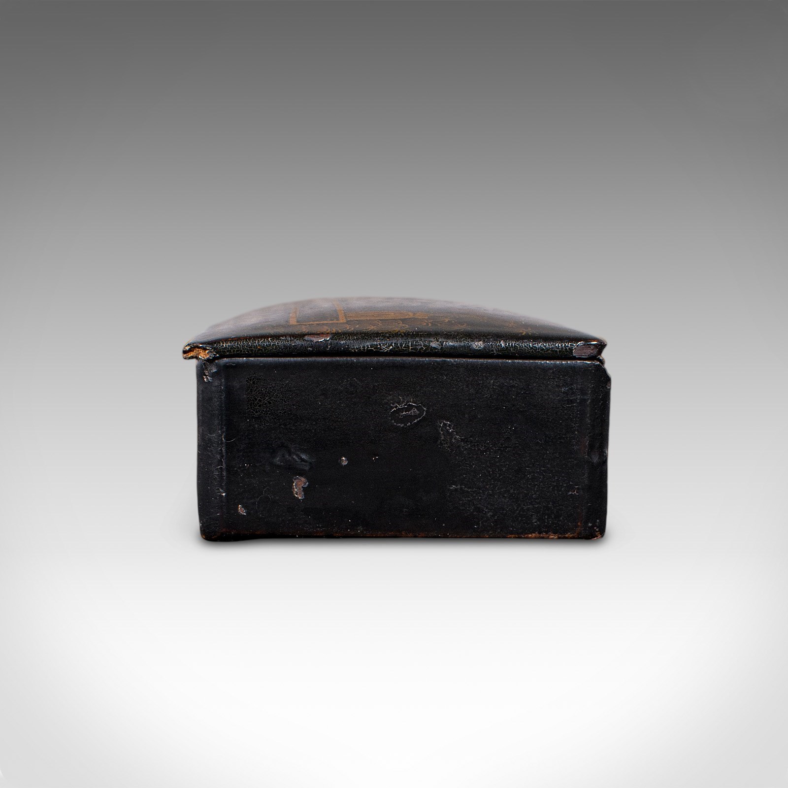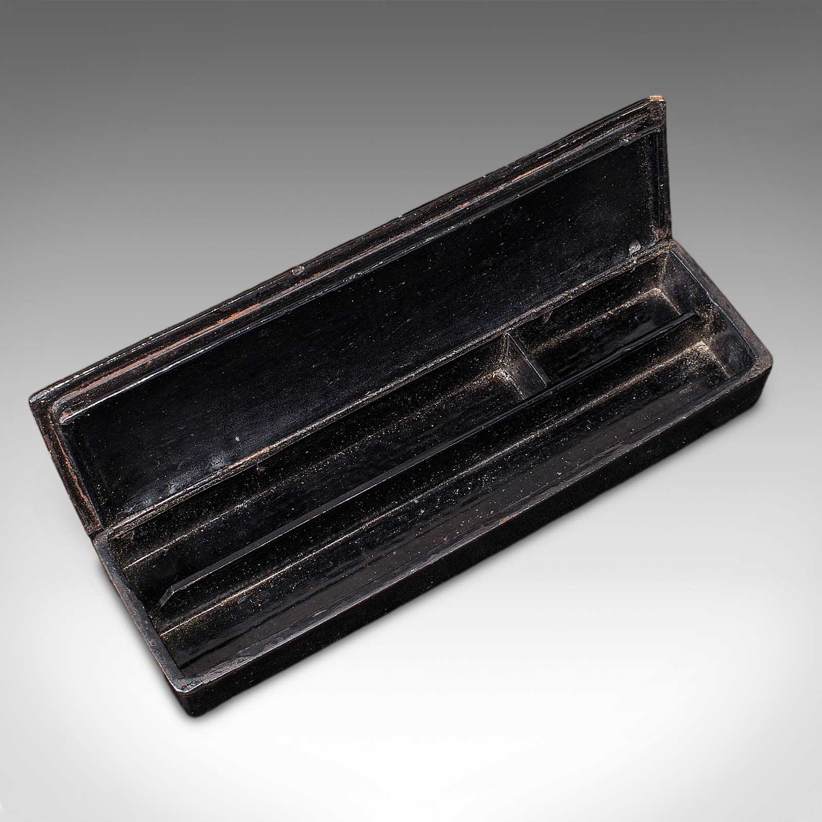 This is an antique calligrapher's pen box. An Oriental, lacquered papier-mâché quill case in Chinoiserie taste, dating to the late Victorian period, circa 1890.