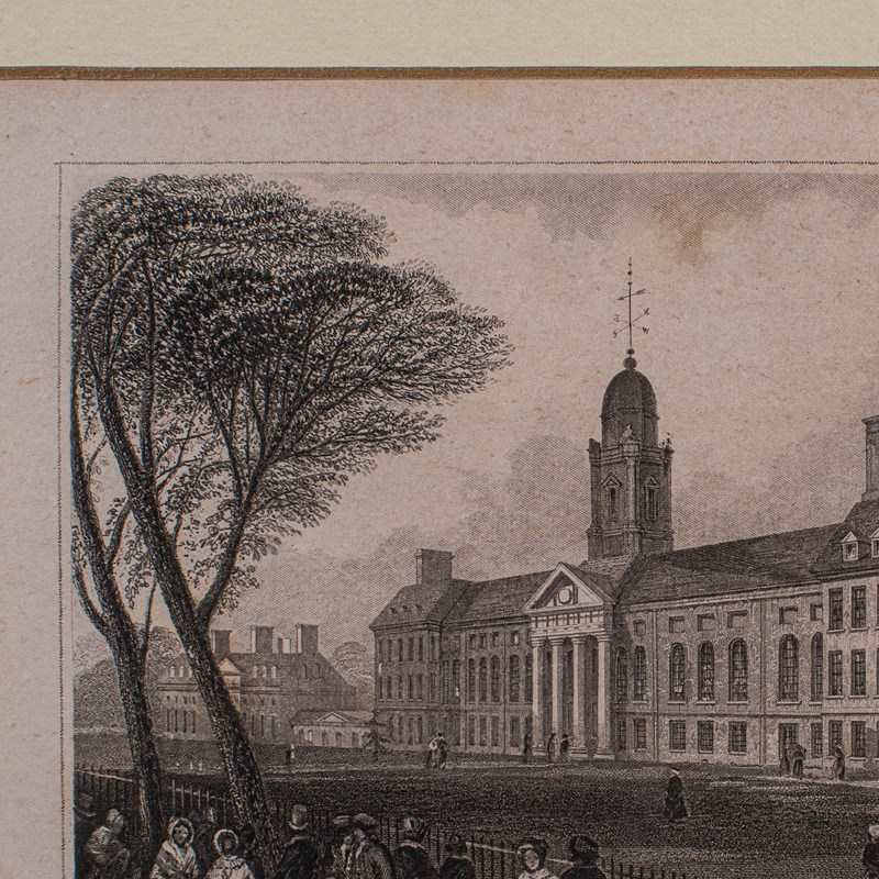 Charming period engraving depicting Chelsea Hospital, London
