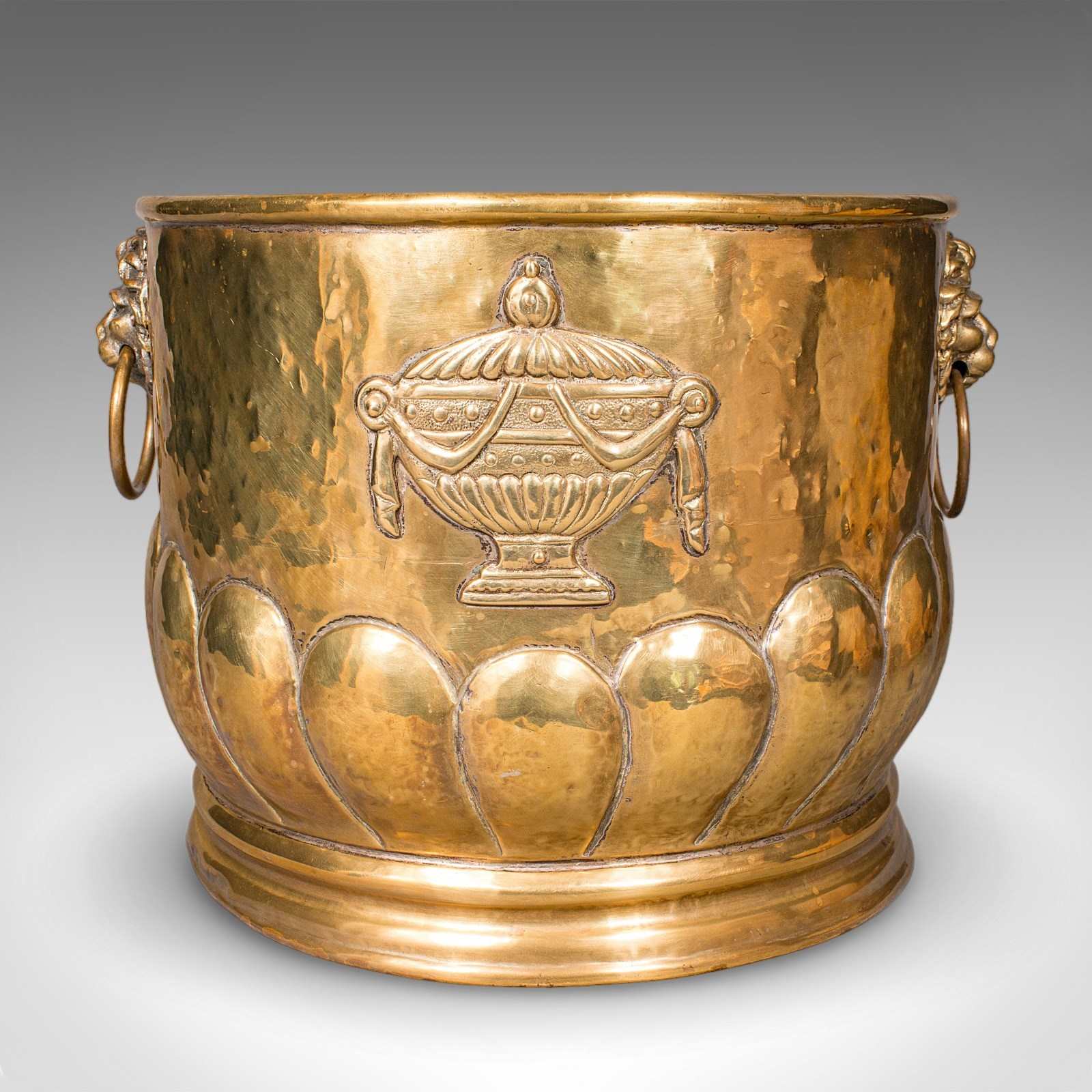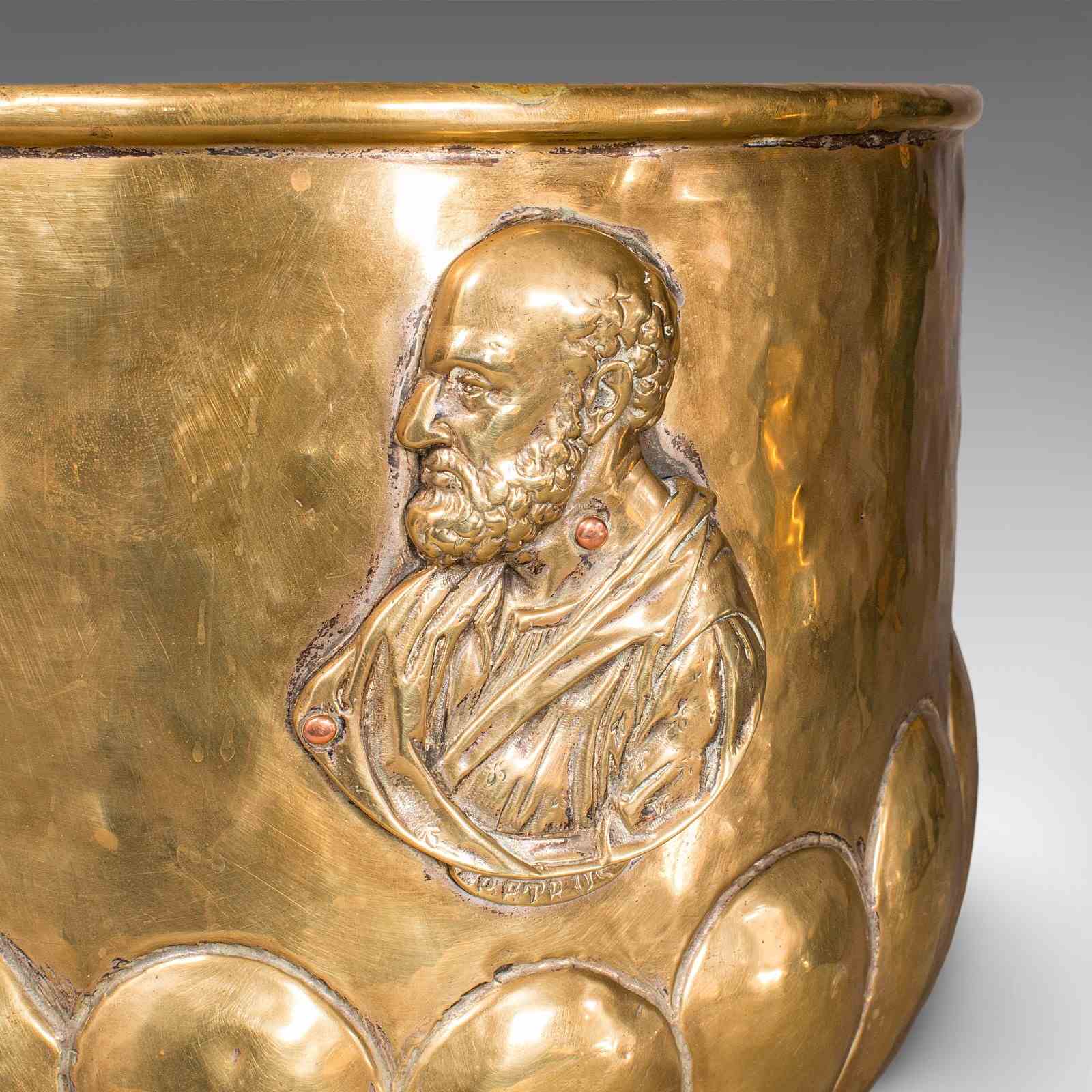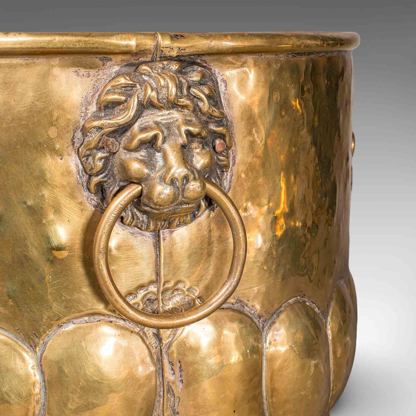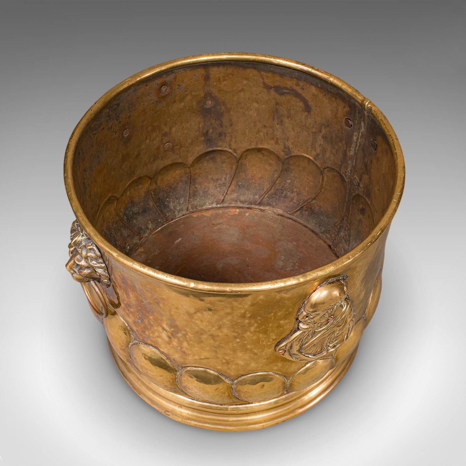 This is an antique coal bucket. A French, polished brass fireside fuel basket in Art Nouveau taste, dating to the late Victorian period, circa 1890. A fascinating and decorative example, rich with figurative and foliate interest.