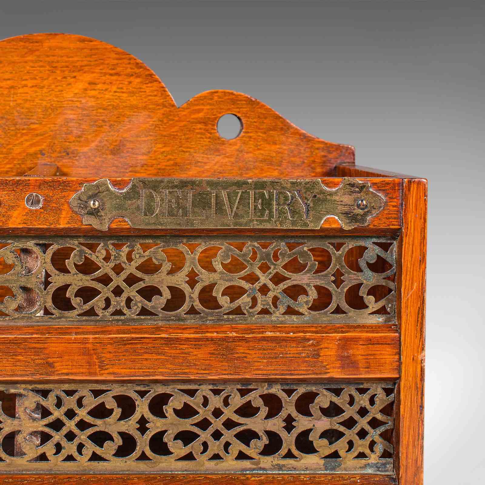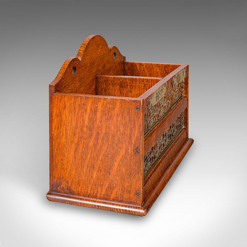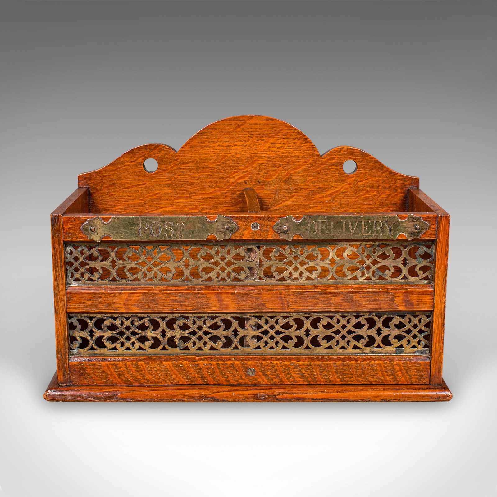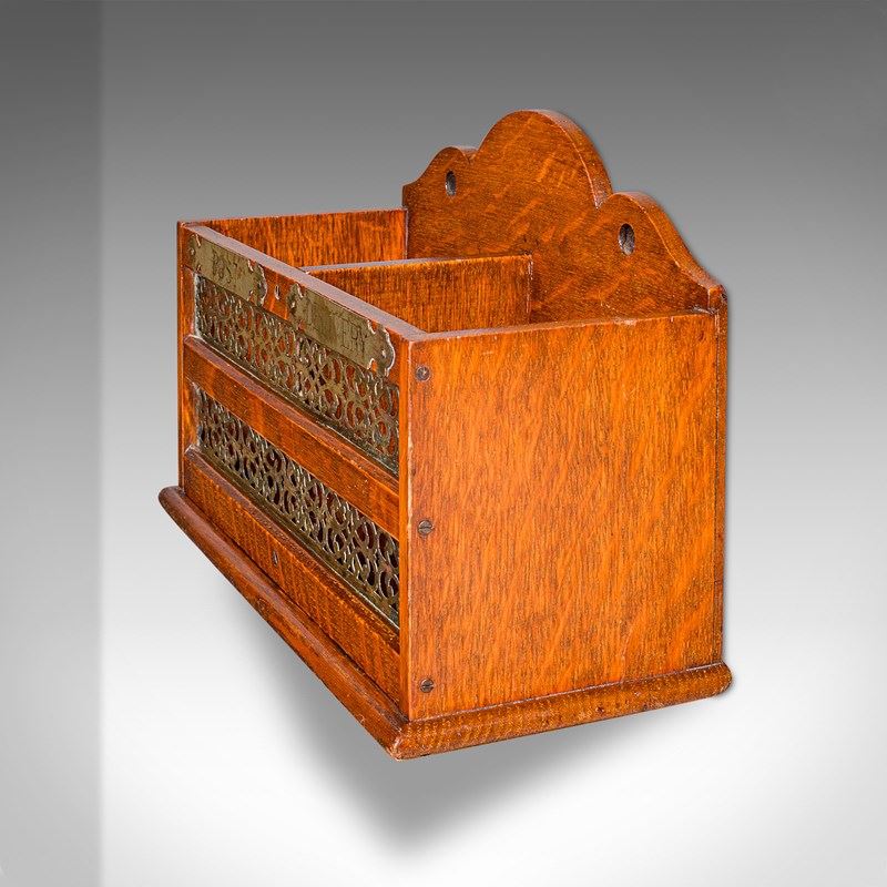 This is an antique country hotel post box. An English, oak two division desk organiser or mounted stationery rack, dating to the Edwardian period, circa 1910. A fine example of period craftsmanship, combining practicality with decorative charm.