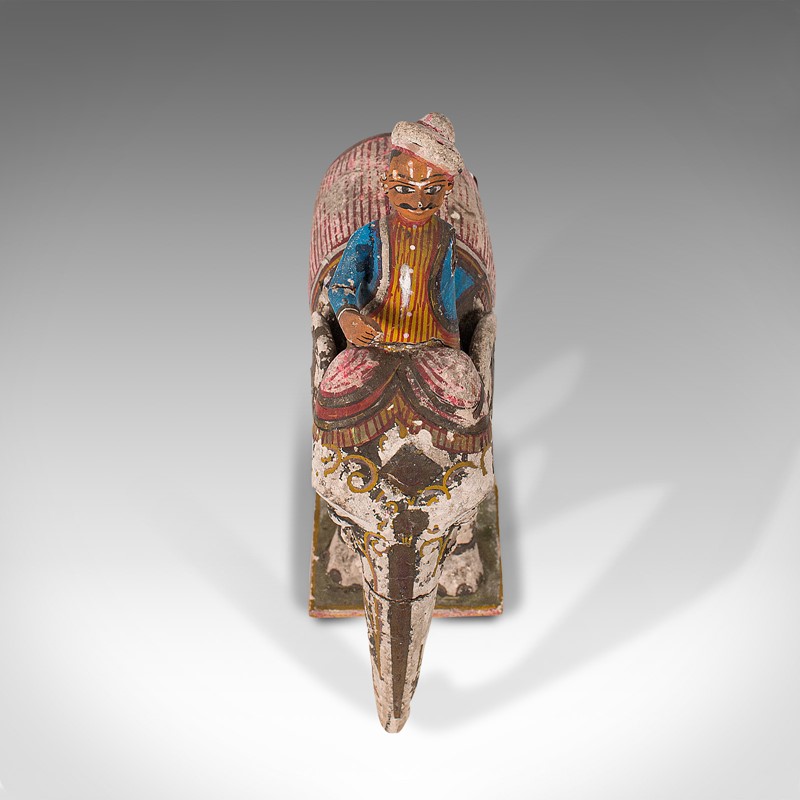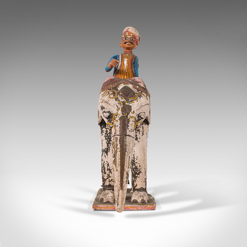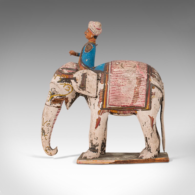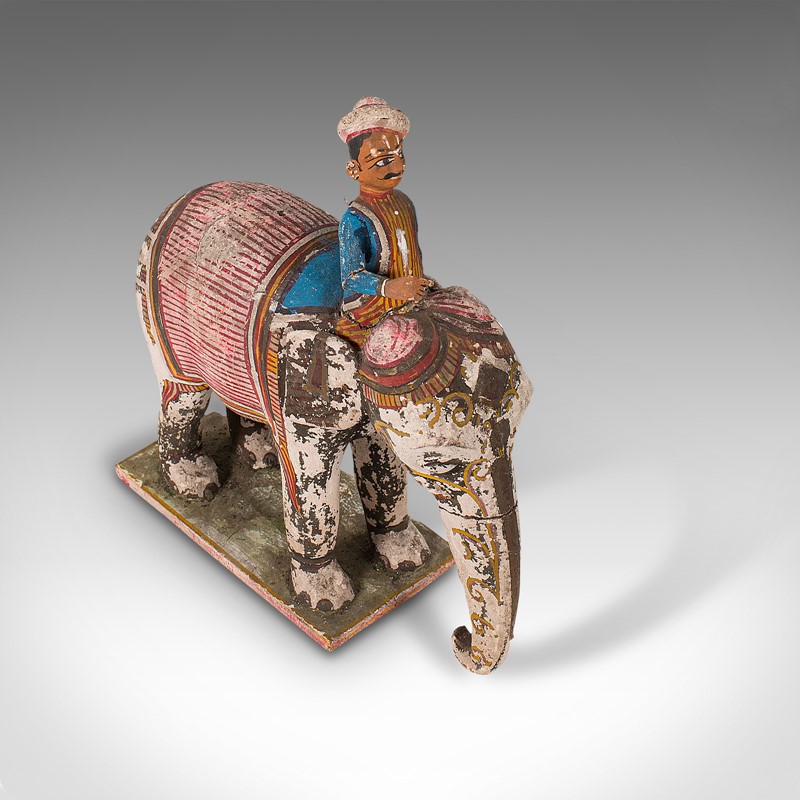 This is an antique decorative elephant and mahout. An Indian, hand-painted wooden figure, dating to the early Victorian period - mid 19th century.