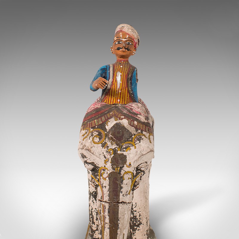 This is a super antique decorative elephant and rider, with great colours and a loveable patina that is testament to many decades of inquisitive handling and an obvious compulsion to take it in the hand and enjoy it. Delivered ready to delight all those who encounter it.