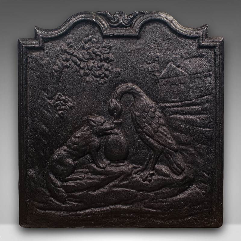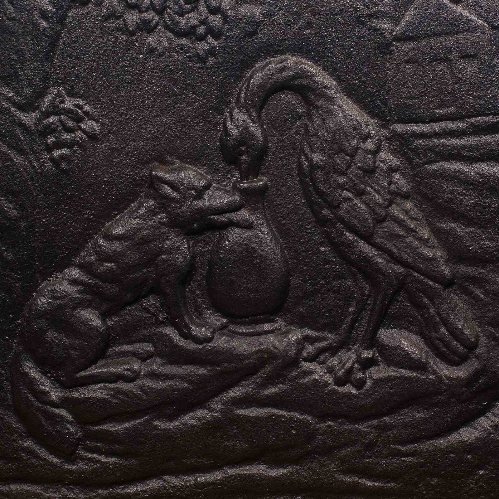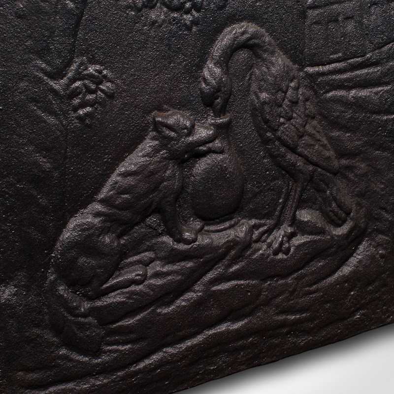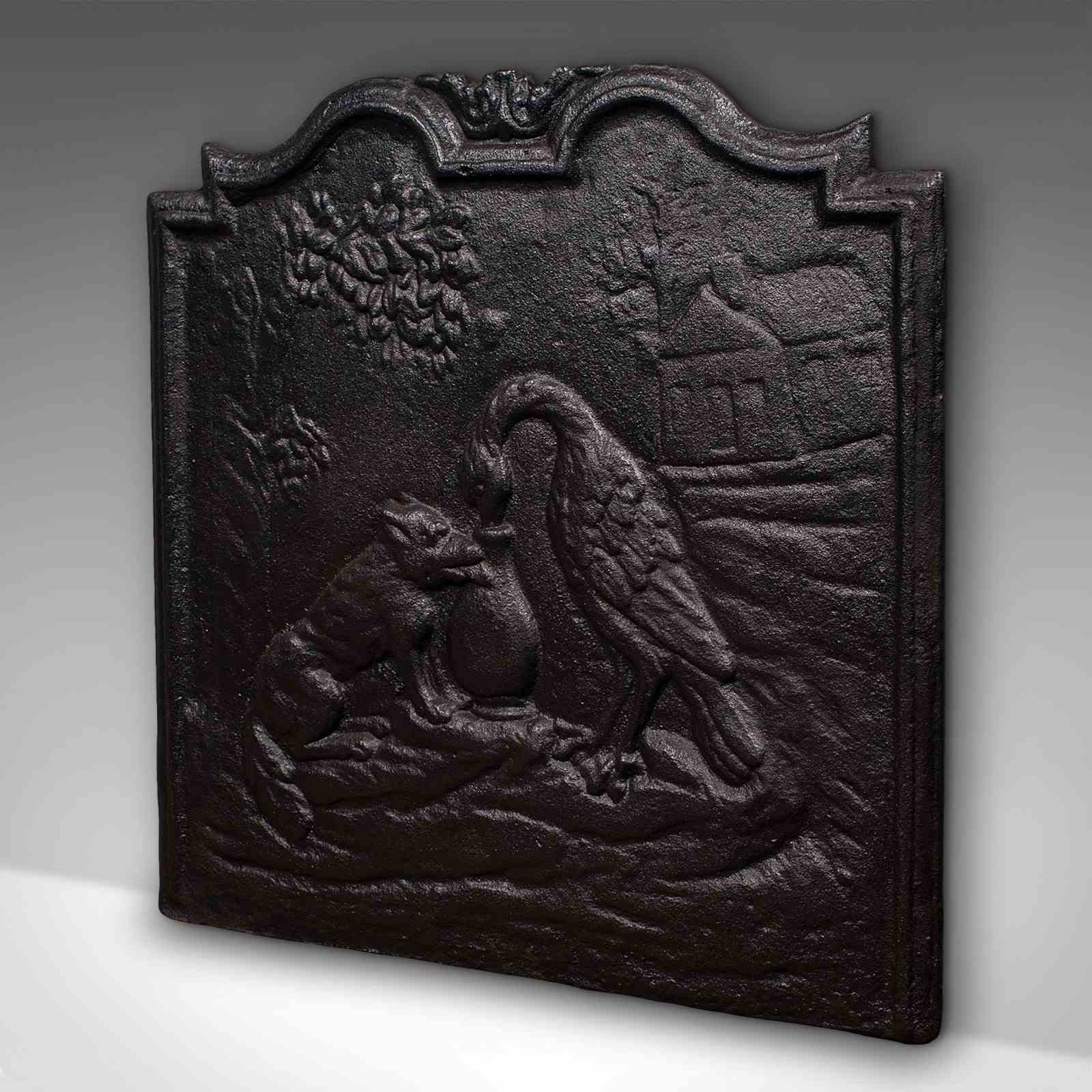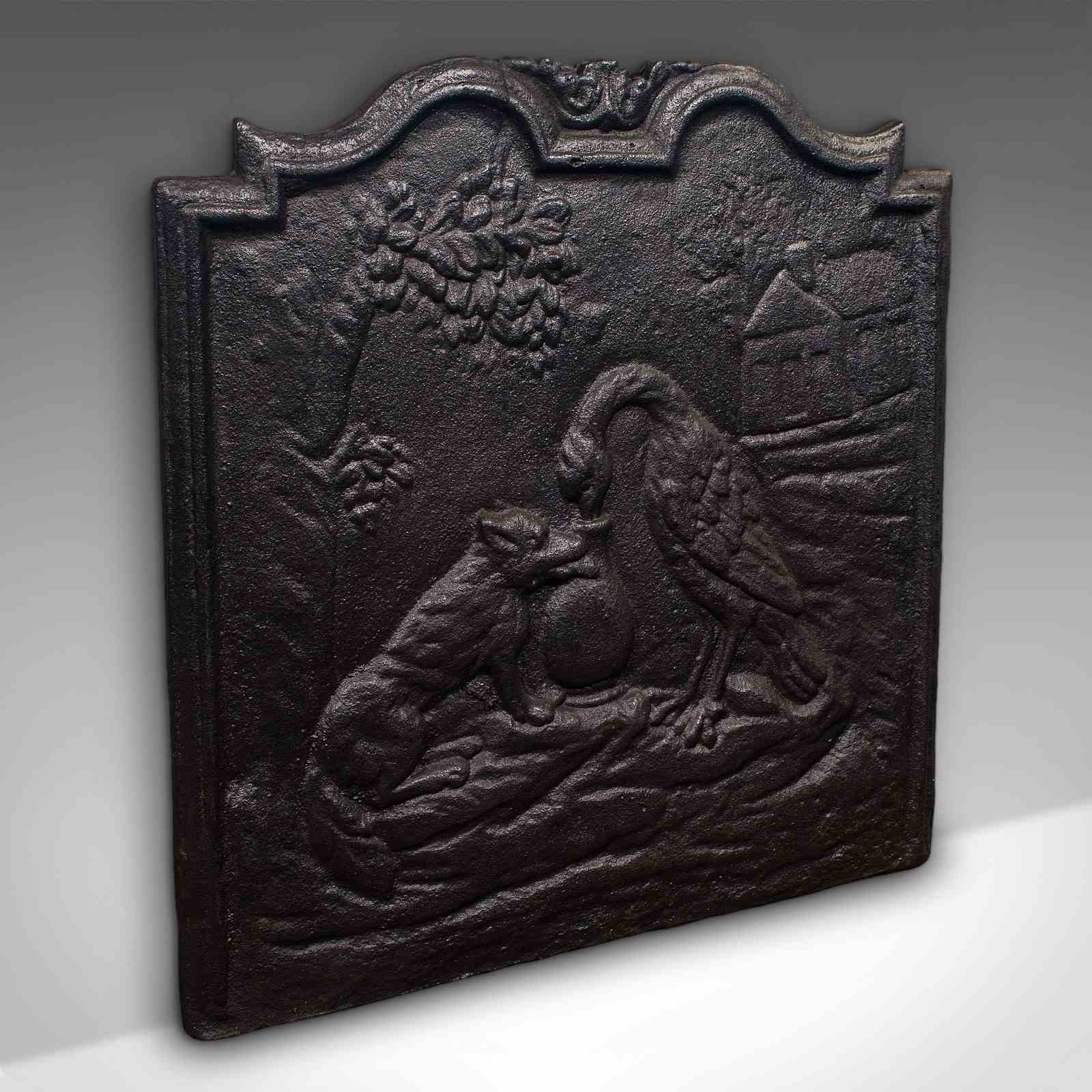 This is an antique decorative fire back. An English, cast iron relief fireplace reflector with Fox and Stork motif after Aesop's fable, dating to the late Victorian period, circa 1890.