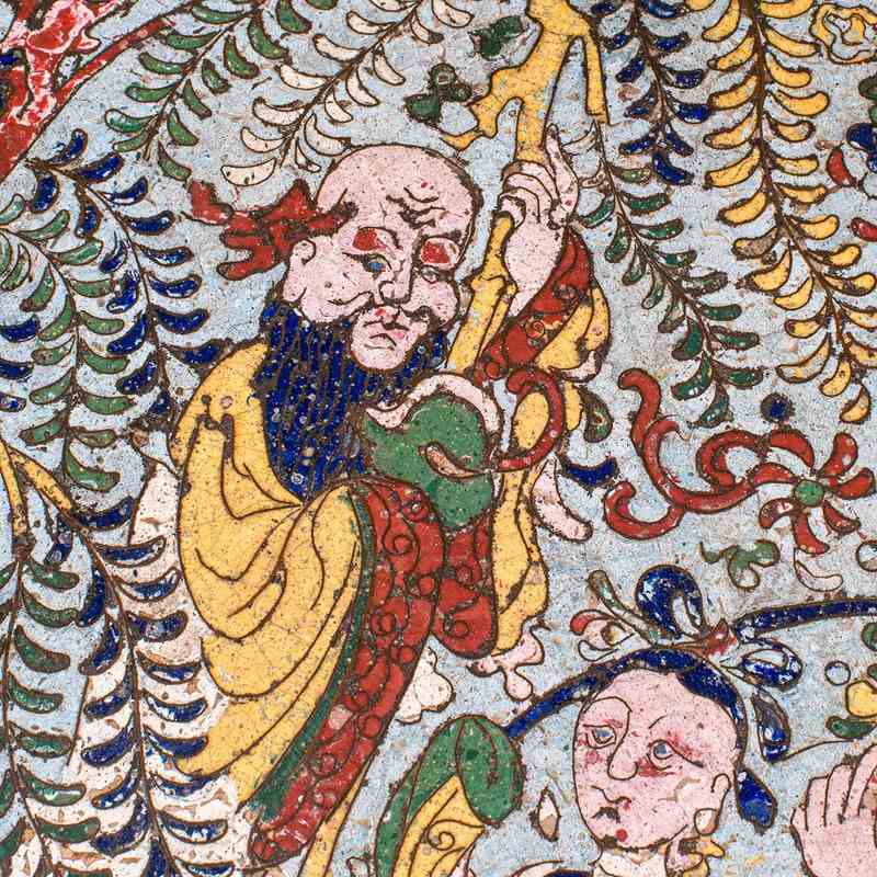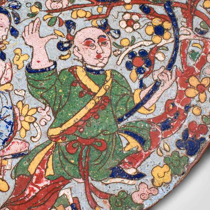 Delightful figural and foliate motif, presented in a rich, multicolour palette