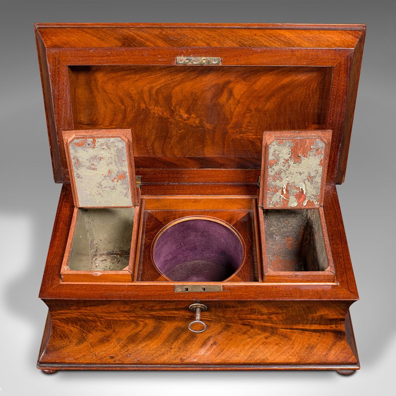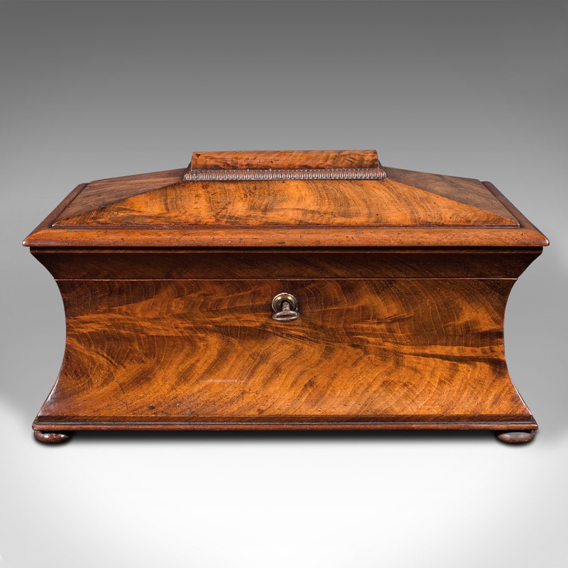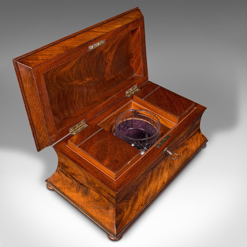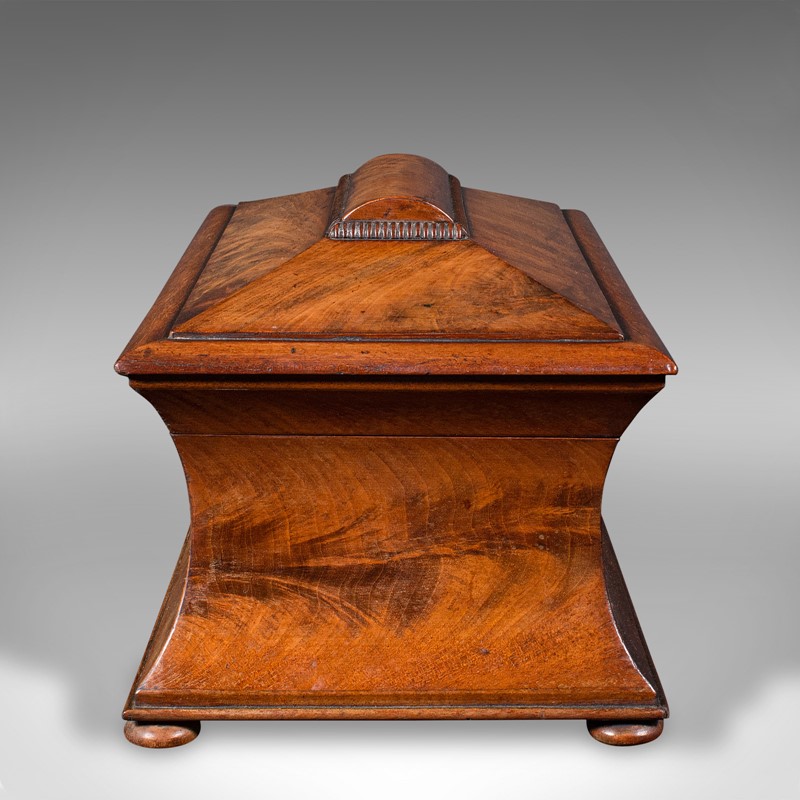 This is an antique drawing room tea caddy. An English, flame mahogany sarcophagus with glass mixer, dating to the Regency period, circa 1820.