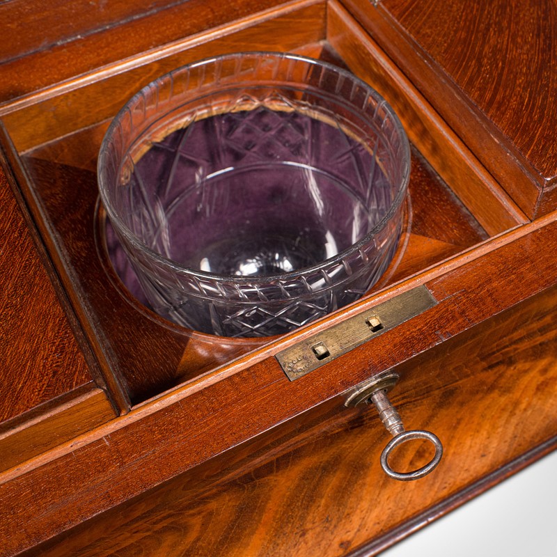 This is a dashing antique drawing room tea caddy, with striking figuring and graced with fine Regency craftsmanship. Solid joints and construction, delivered waxed, polished and ready for the home.