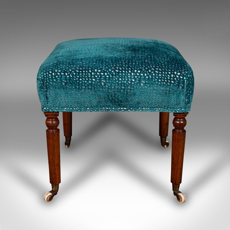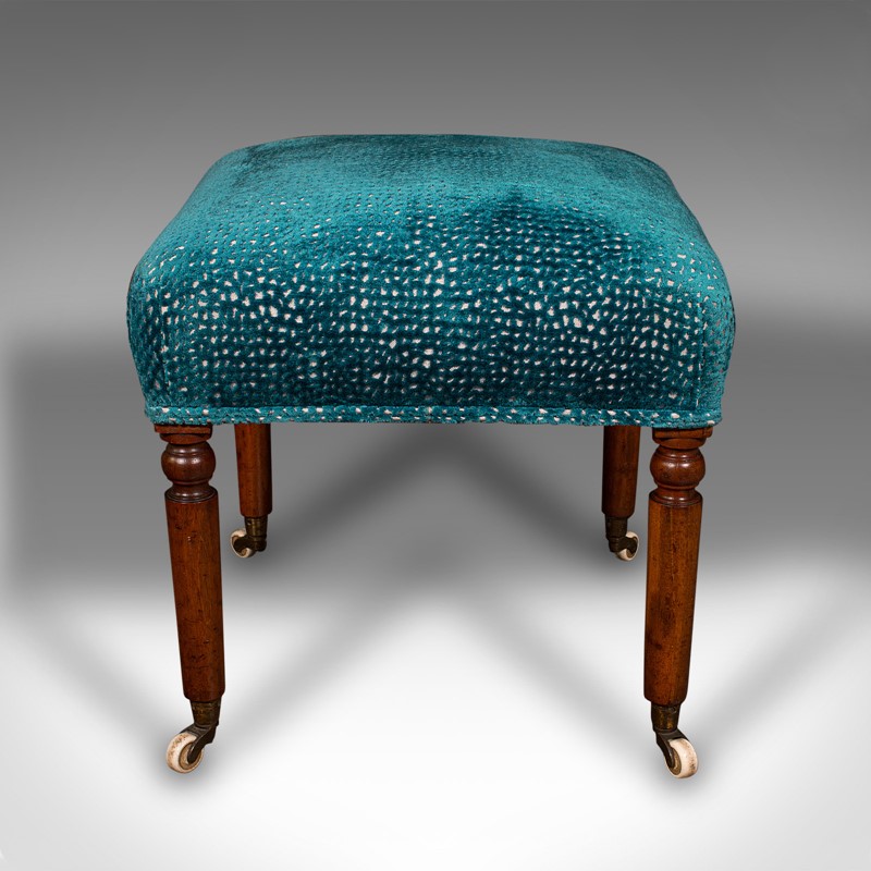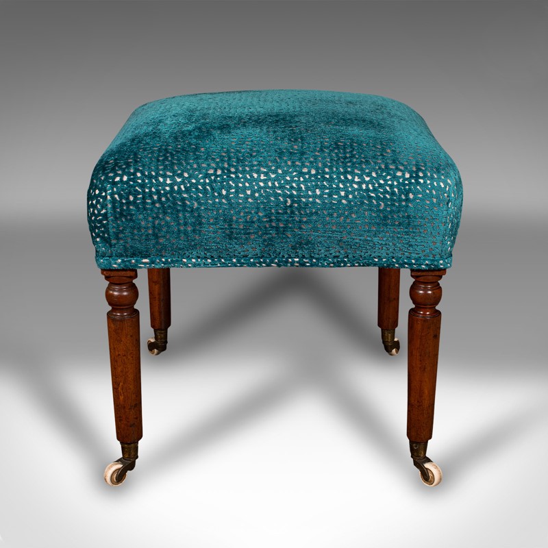 This is a fine antique dressing stool, offering a delightful coloured fabric and professionally upholstered with traditional springing for comfort. Solid joints and construction, delivered ready for the home.