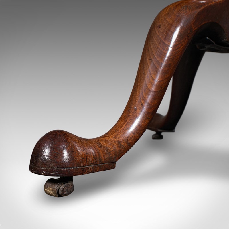 Standing upon a trio of broad cabriole legs, terminating in elegant snake feet